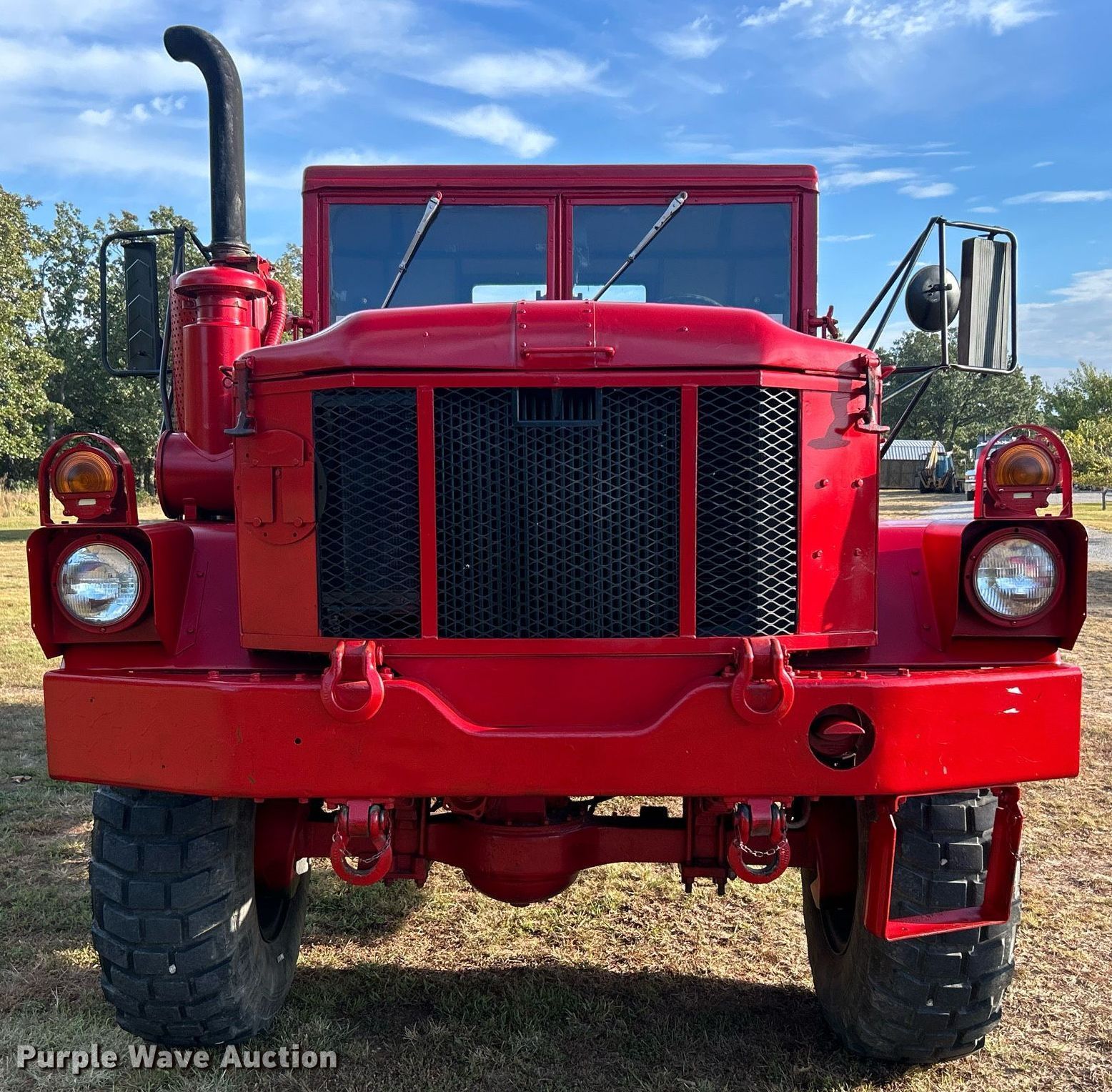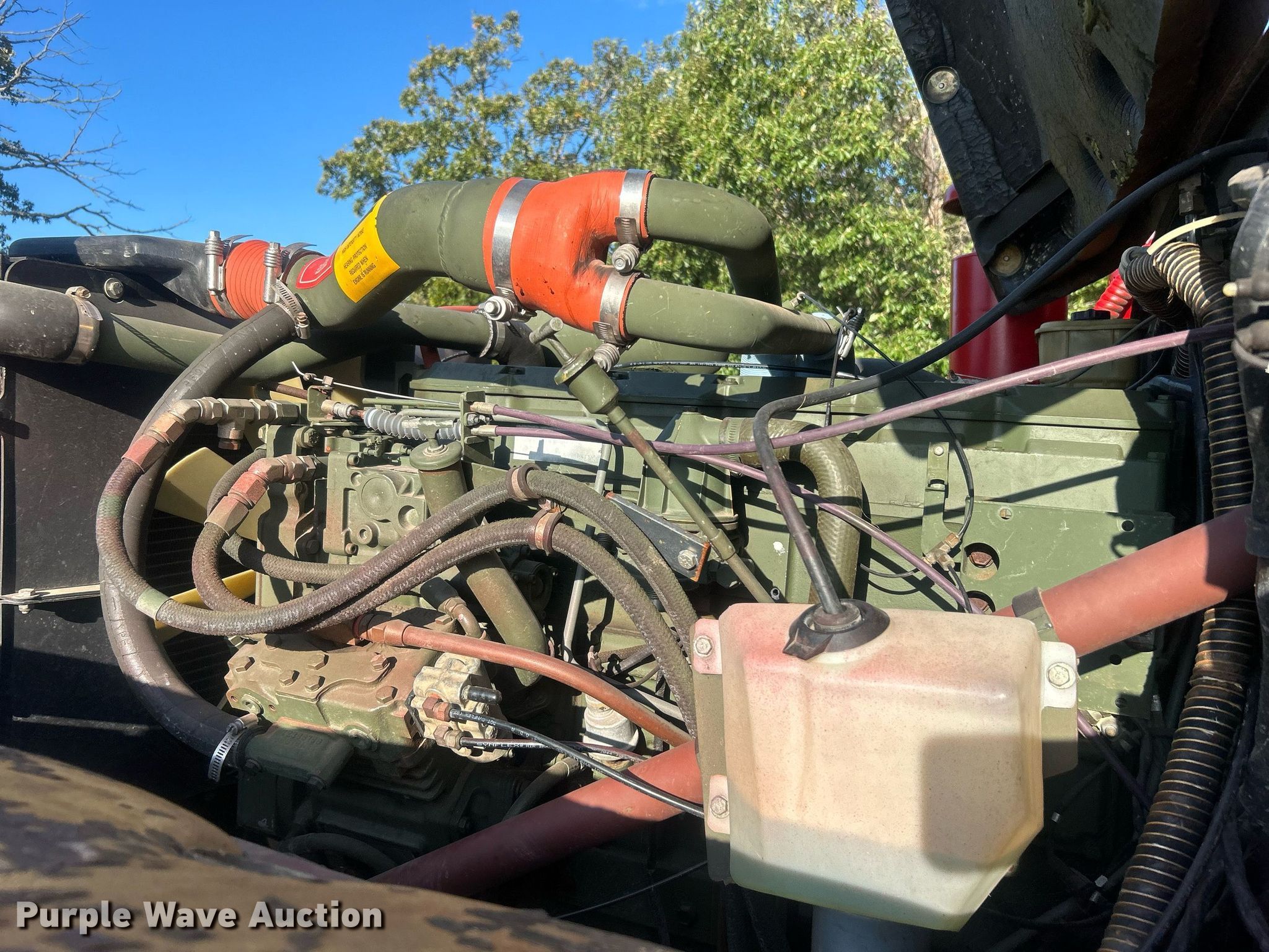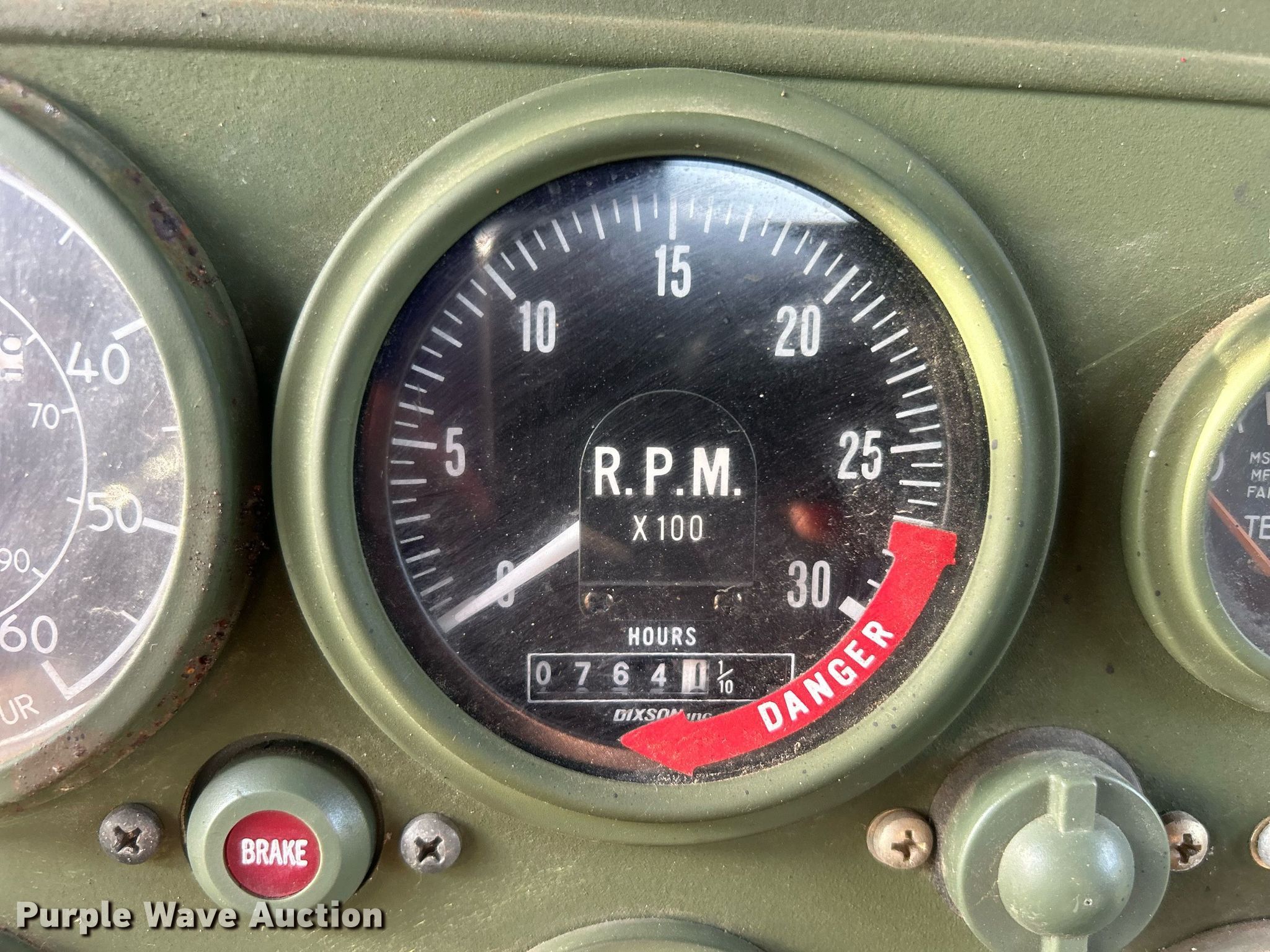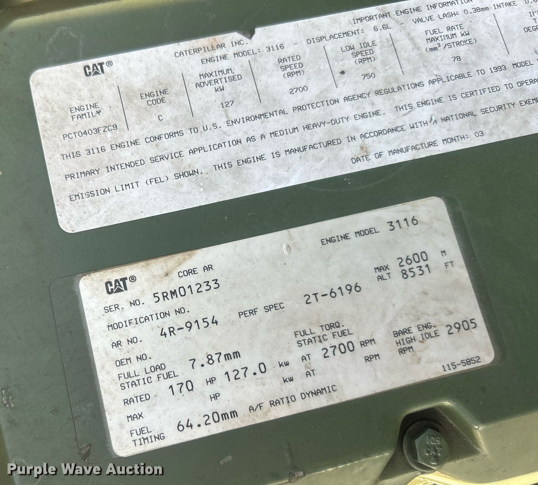 1999 AM General flatbed truck. Miles: 13,580 on odometer, Hours: 764 on meter, VIN: 501202. Engine Caterpillar 3116, Serial: 5RM01233, Displacement: 6.6L, Cylinders: 6, Fuel type: Diesel, kW: 127. Transmission Allison, Automatic. Chassis Six wheel drive, Axles: Tandem, Suspension: Spring, Brakes: Hydraulic. Interior Heat. Features Flatbed 12' 3" L x 95" W. Tires Size: 14.5R20. Oklahoma classic title. Merriman Trucking. Cleveland, OK 74020