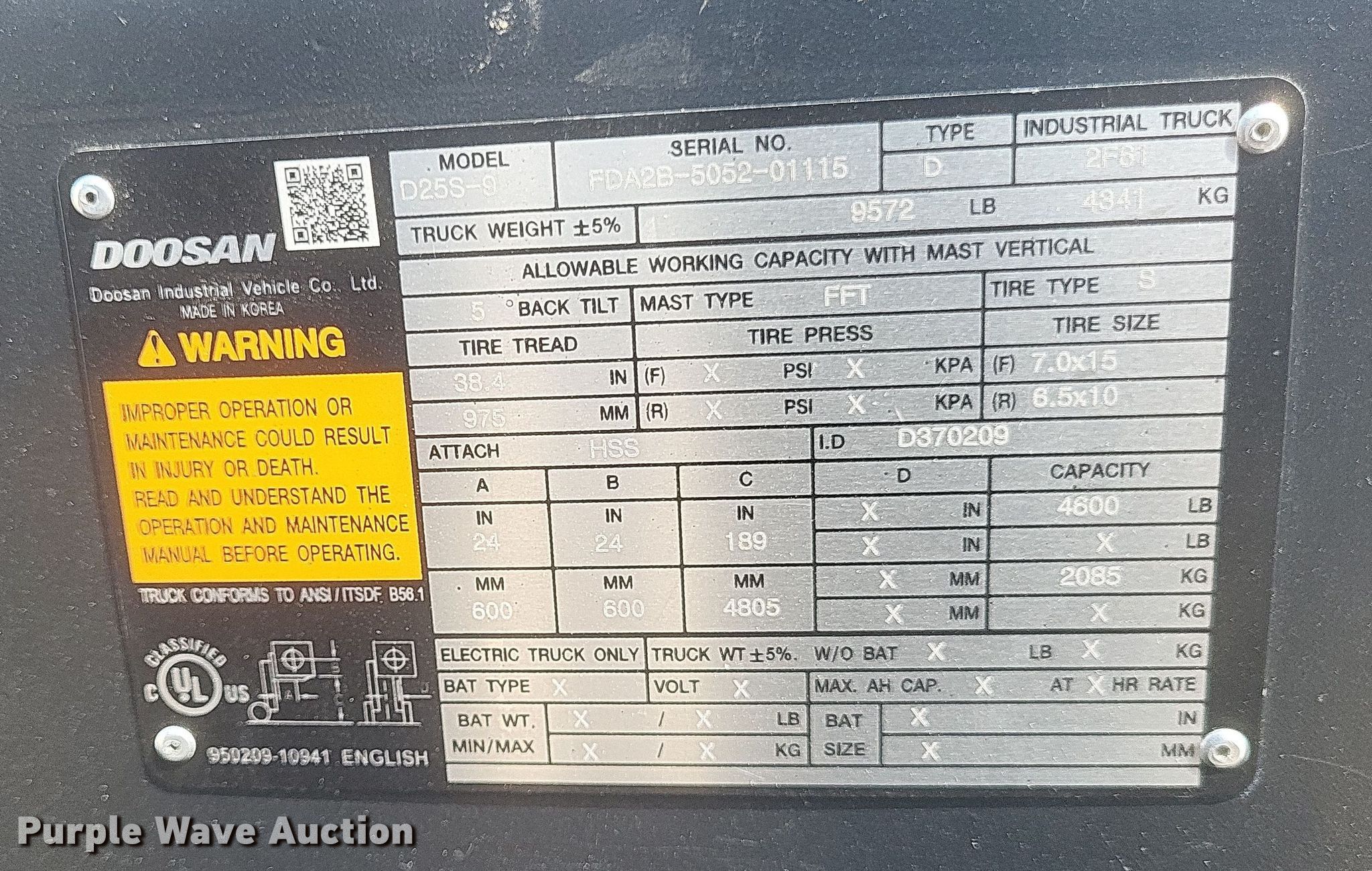 Doosan D25S-9 forklift | SOLD! October 30 Vehicles and Equipment Auction