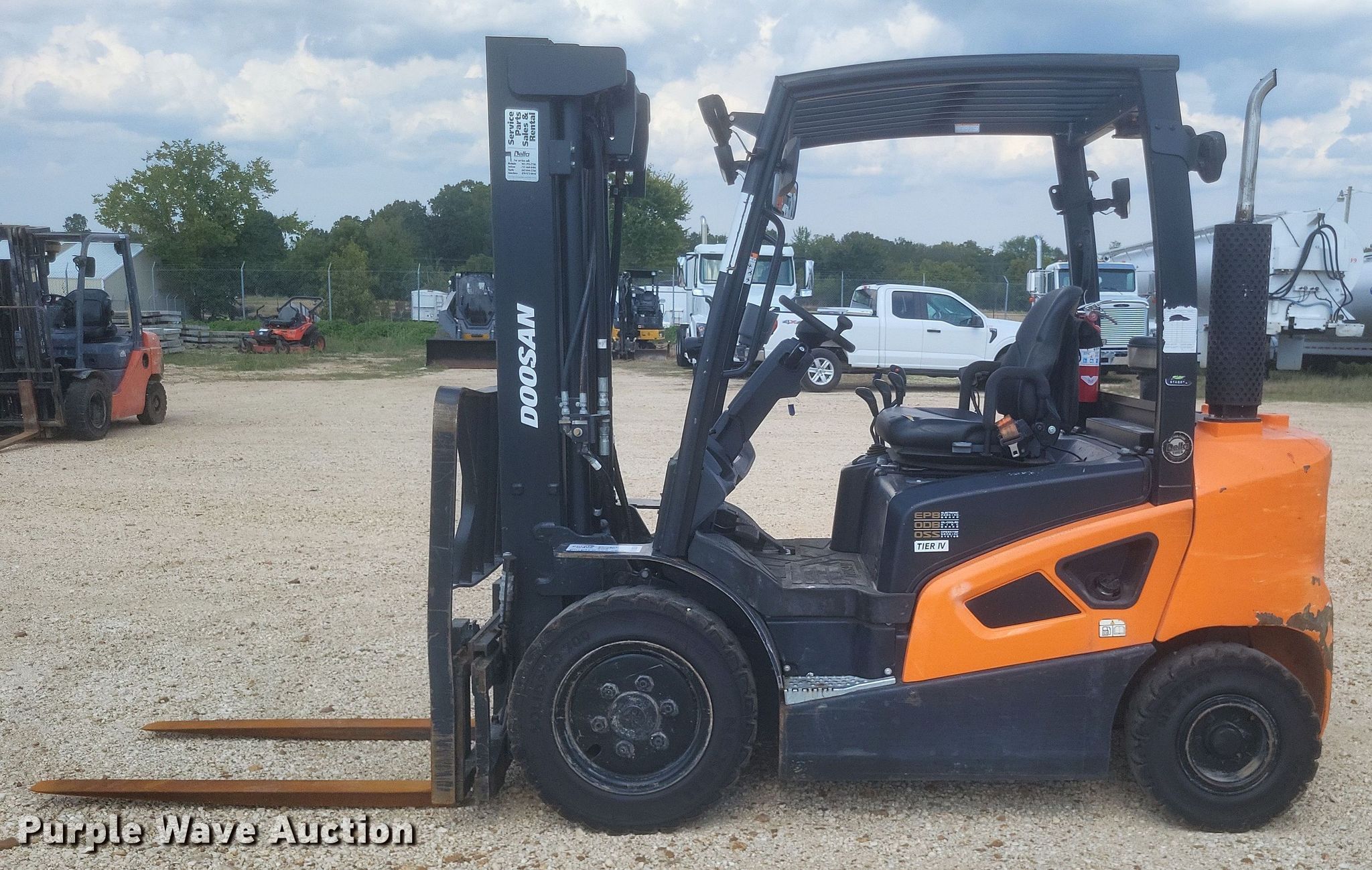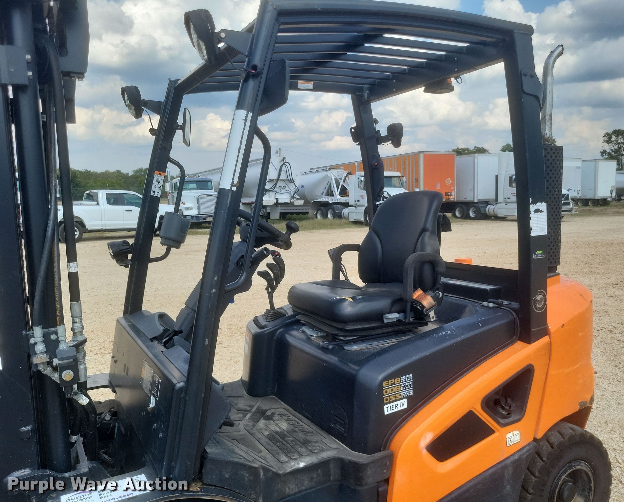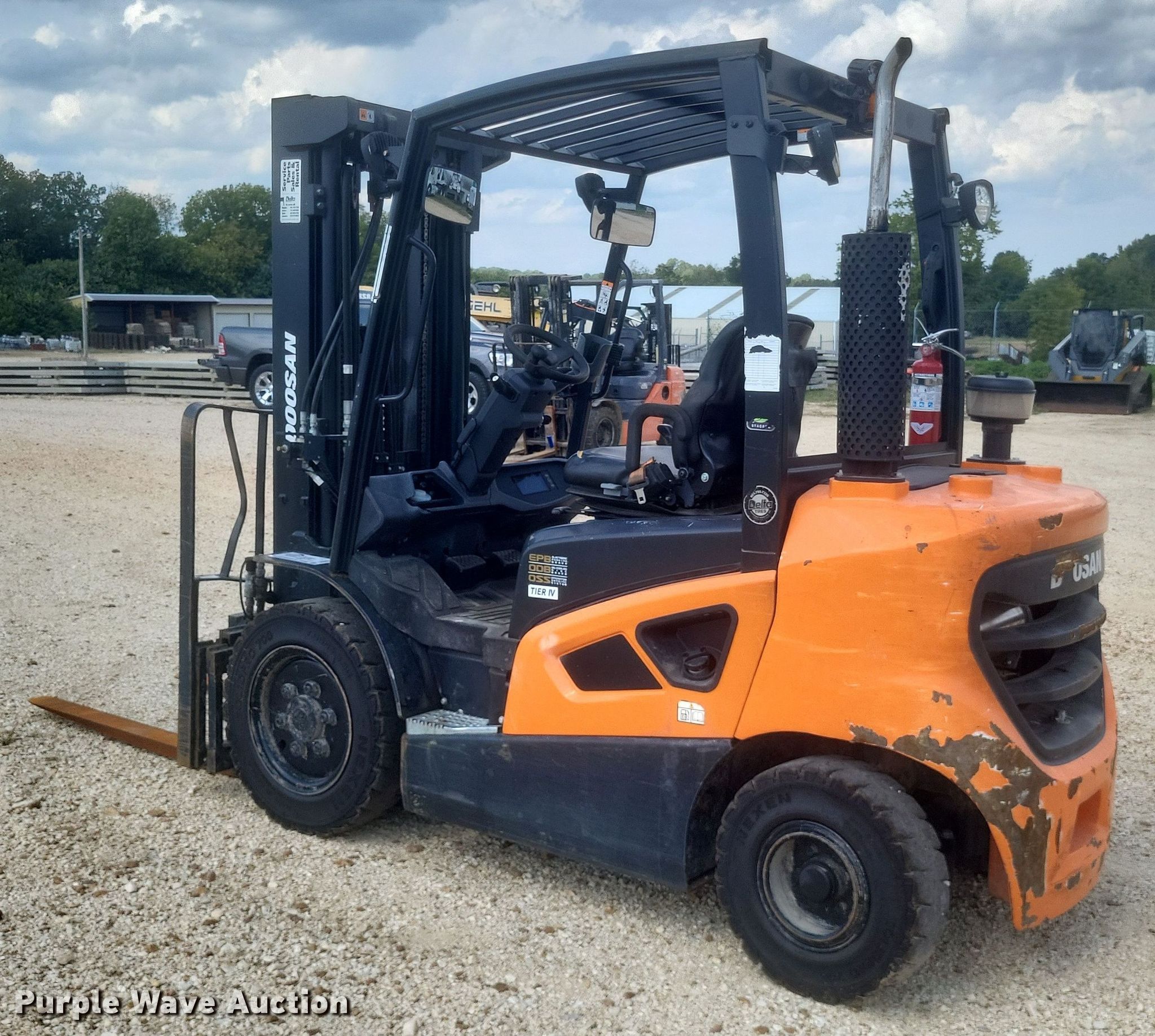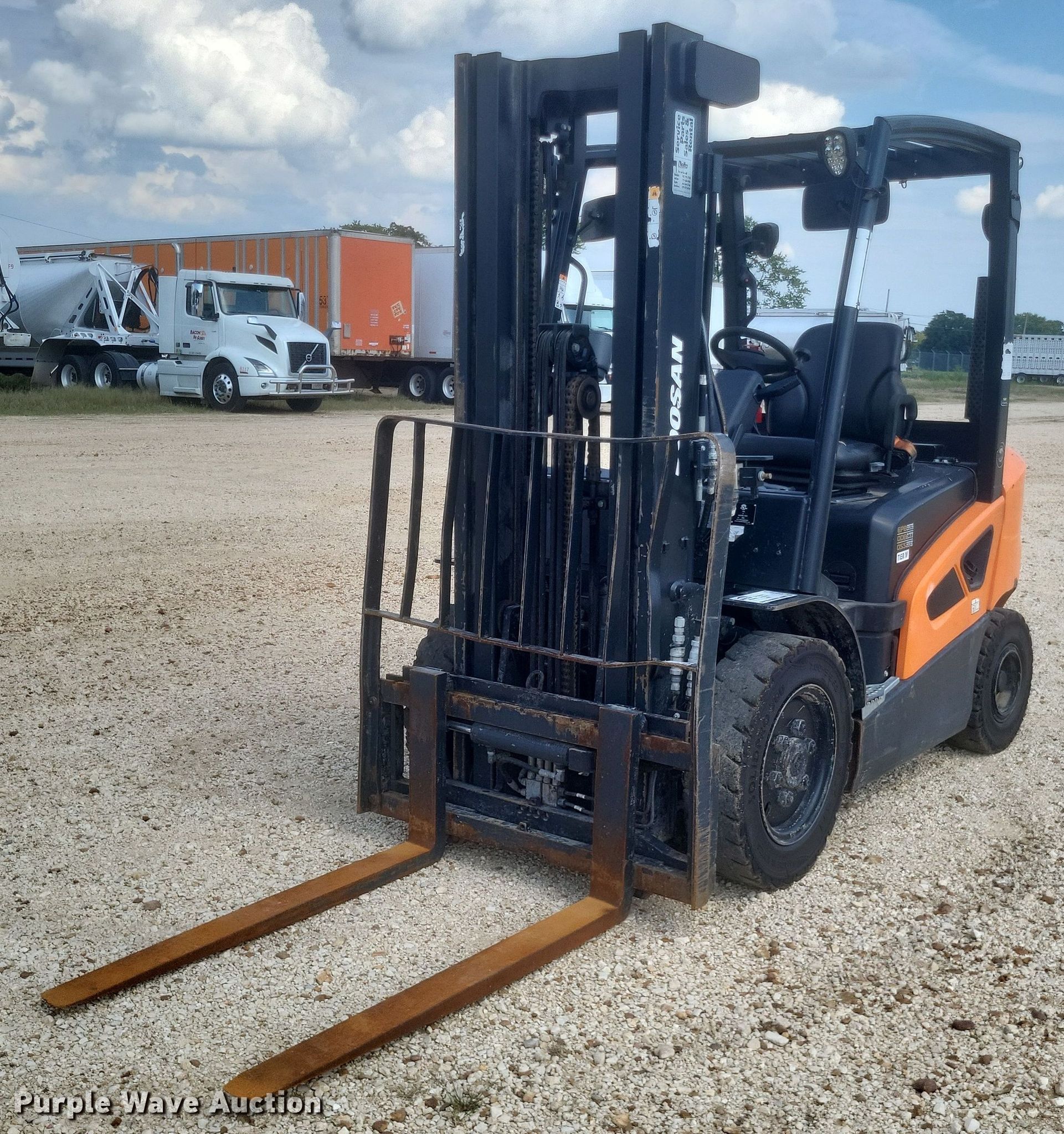 Purple Wave is selling a used Cushion Tire or Pneumatic Forklift in Tennessee. This item is a Doosan D25S-9 forklift with the following: Hours: 4,490 on meter, Serial: FDA2B-5052-01077