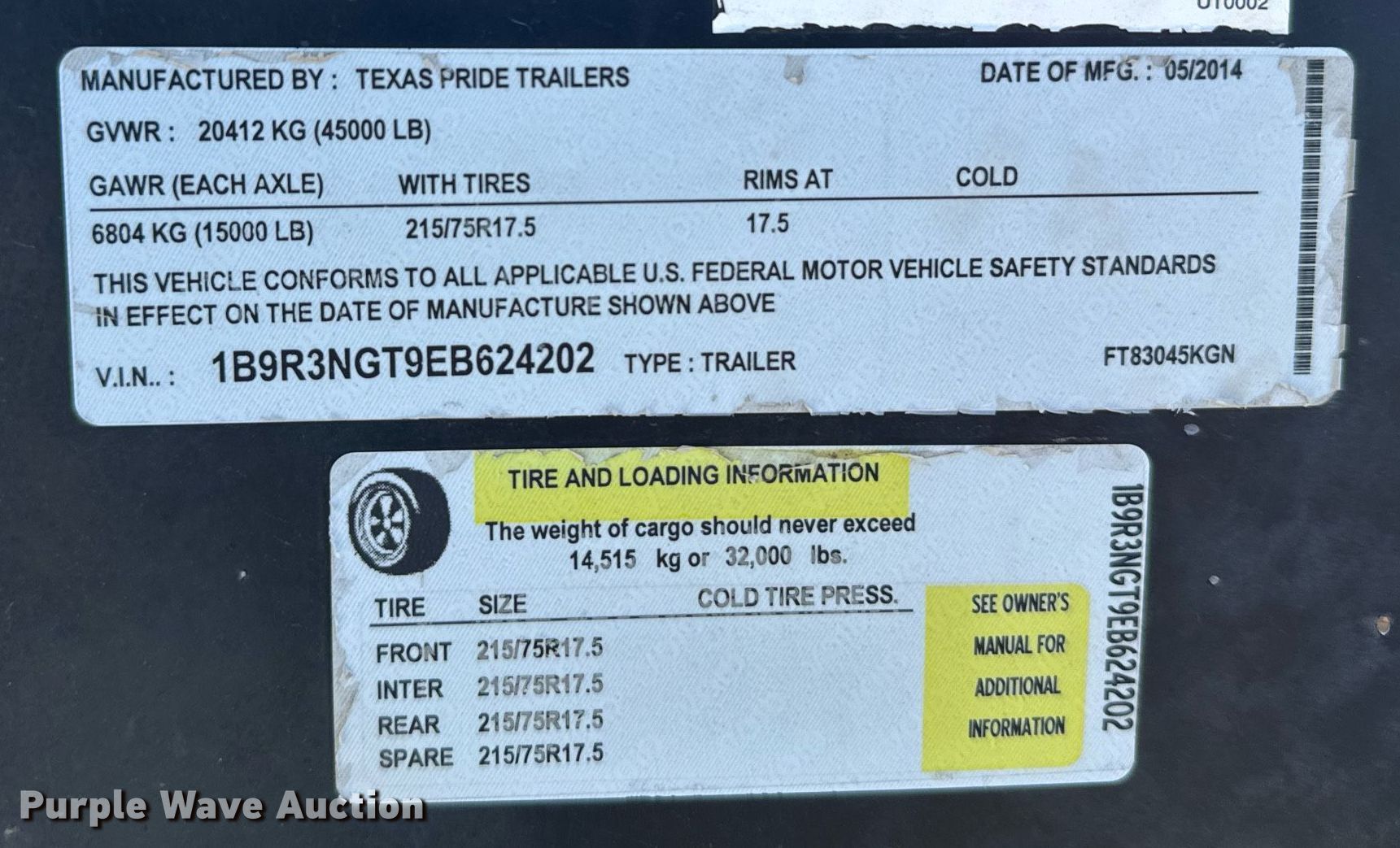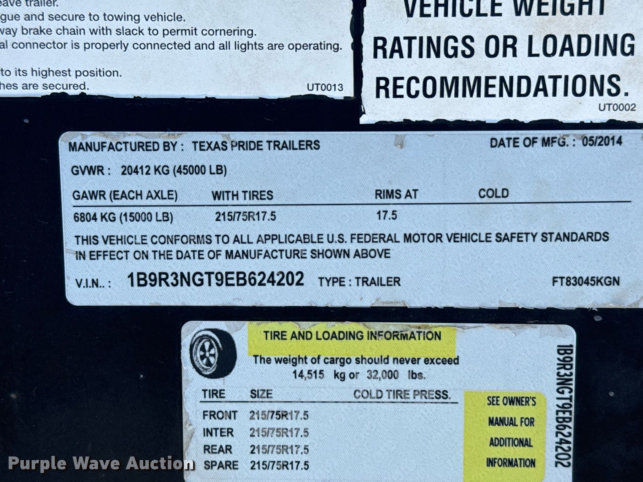 Purple Wave is selling a used Equip. Trailer in Kansas. This item is a 2014 Texas pride equipment trailer with the following: VIN: 1B9R3NGT9EB624202