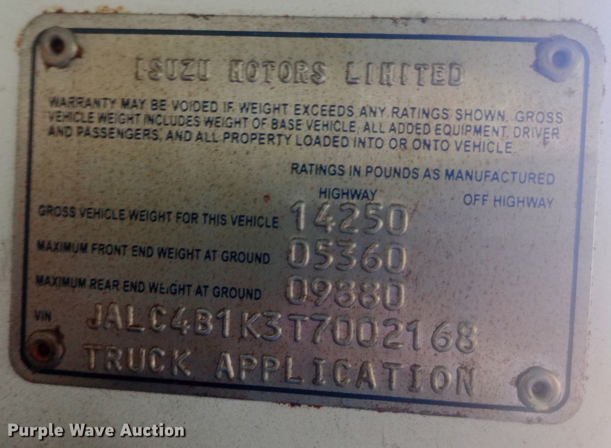 1996 Isuzu NPR flatbed truck. Miles: 194,434 on odometer, VIN: JALC4B1K3T7002168. Engine Displacement: 3.9L, Cylinders: 4, Fuel type: Diesel. Transmission Automatic. Chassis Axles: Single, Suspension: Spring, Brakes: Hydraulic, GVWR: 14,250 lbs. Interior AC, Heat. Features Flatbed Load Maximizer, Serial: 1180, 14' L x 96" W. Tires Front: 215/85R16, Rear: 225/75R16. Oklahoma classic title. Title distribution may be delayed up to 14 days from verification of funds. Ponca City, OK 74604