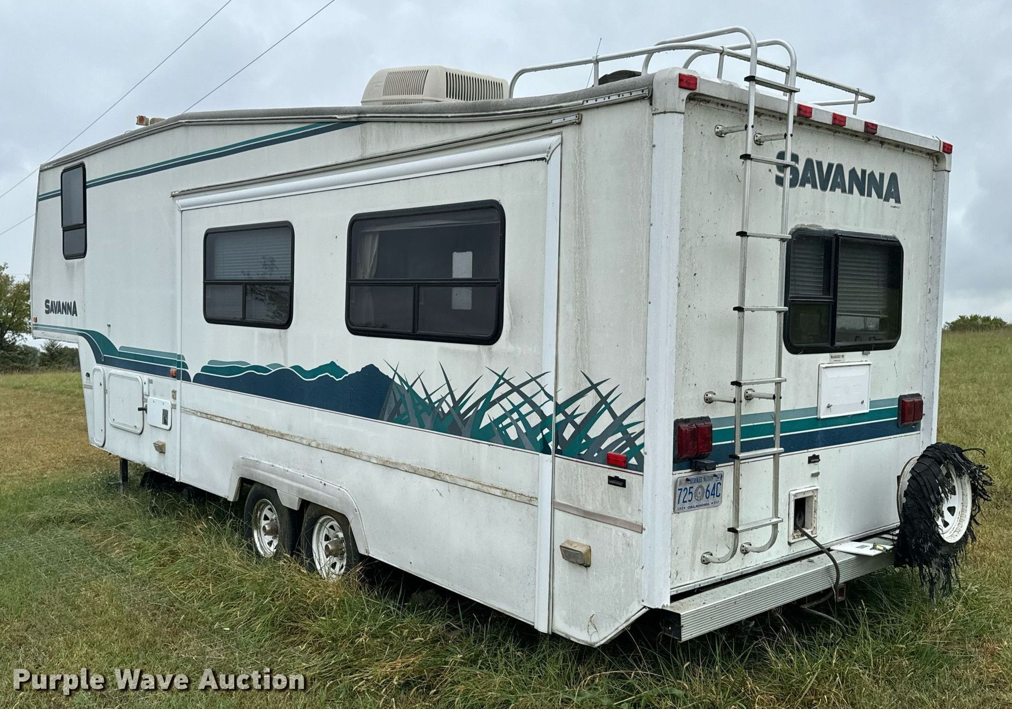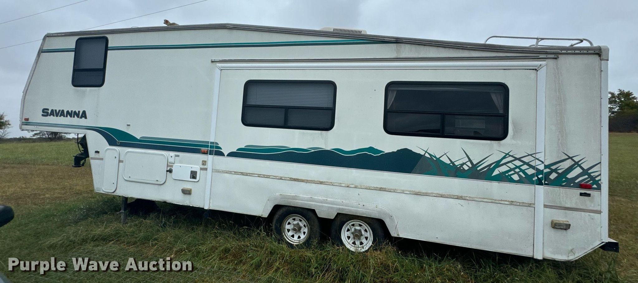 1996 Fleetwood Savannah 30 5X camper. Camper length: 30', VIN: 1EG5X3022T2879684. Chassis Axles: Tandem, Suspension: Spring, Brakes: Electric. Interior Kitchen: Sink, Refrigerator, Freezer, Microwave, Oven, Stove: Propane, Living room: Table, Pull out couch, Bathroom, Beds: 1 Bed type: Queen, AC units: 1. Features Slide outs: 1, Awnings: 1 Awning type: Manual, Hitch: Fifth wheel. Tires Size: ST225/75R15. Cherokee Nation title. Title distribution may be delayed up to 14 days from verification of funds. Nowata, OK 74048