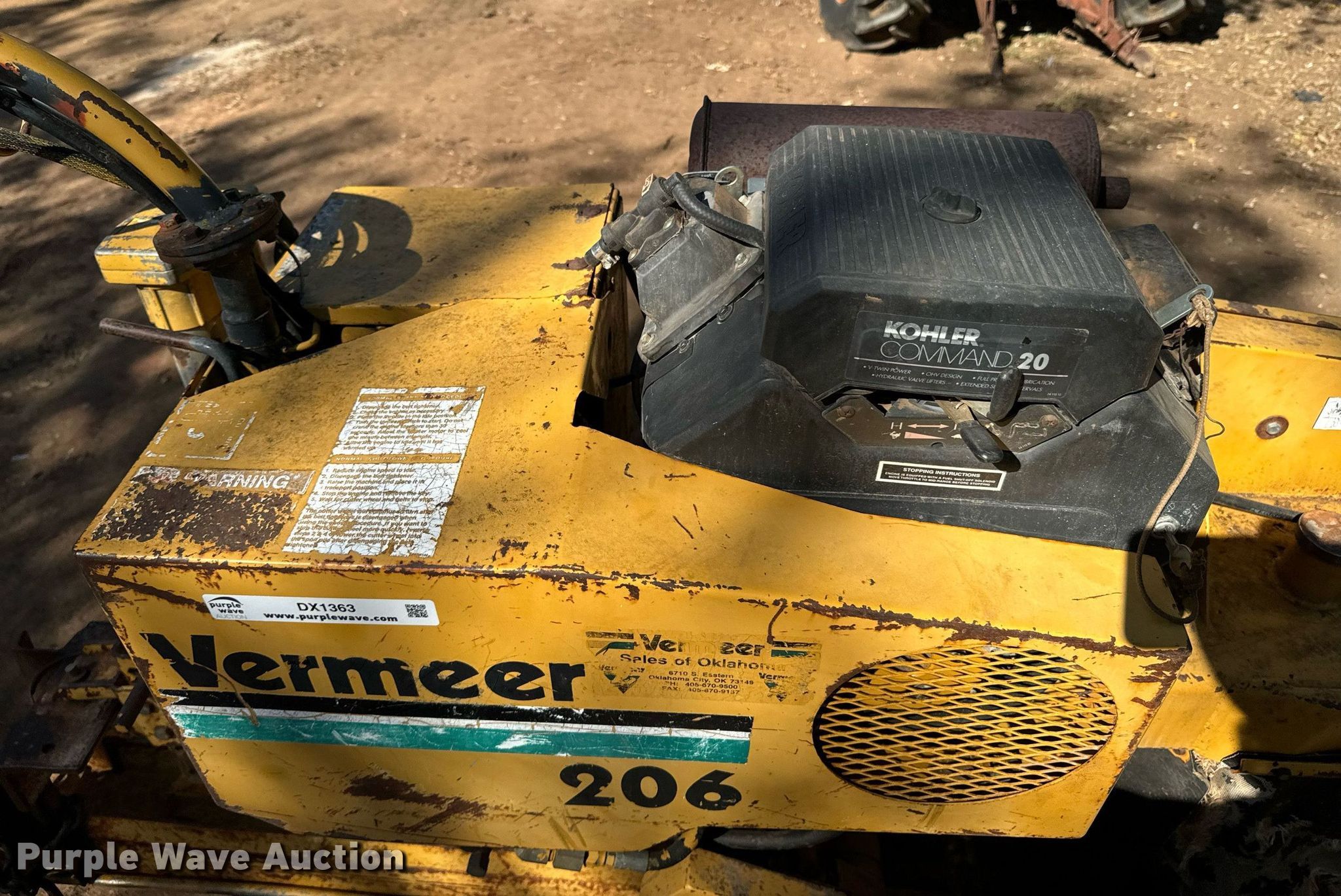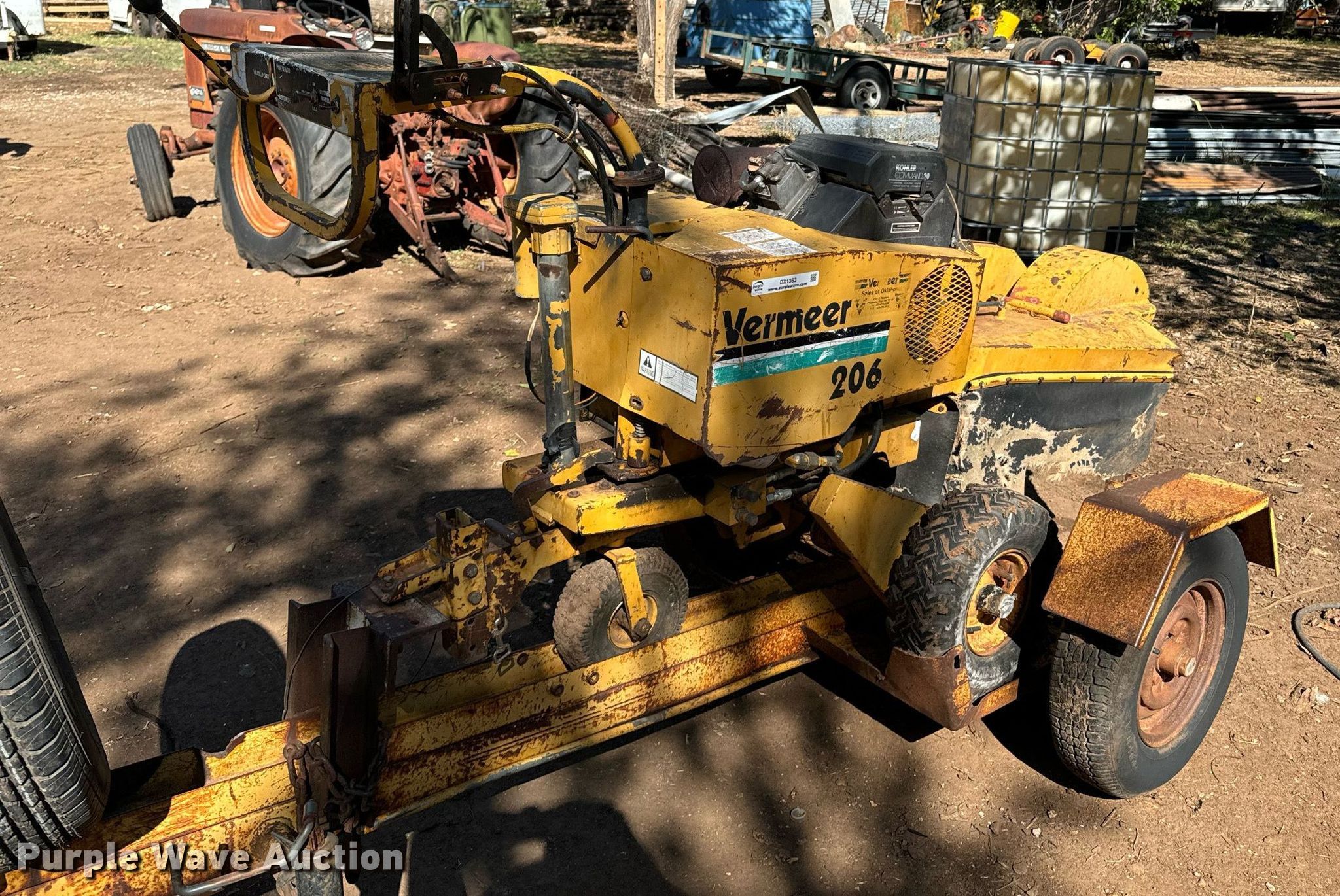 1993 Vermeer 206 stump grinder. Serial: 1VRC07195P1002060. Engine Kohler Command 20, Cylinders: 2, Fuel type: Gas. Transmission Hydrostatic. Features Cutting head diameter: 16" Bolt-on teeth. Tires Size: 5.70-8. Trailer 1993 Rayco Manufacturing, Inc., VIN: 1R9030911PW210204, 9' L x 58" W, Ball hitch size: 2", Axles: Single, Tire size: 175/80R13. This is worksite support equipment and will not come with a title. Transfer of ownership documentation will be a bill of sale. Fairfax, OK 74637