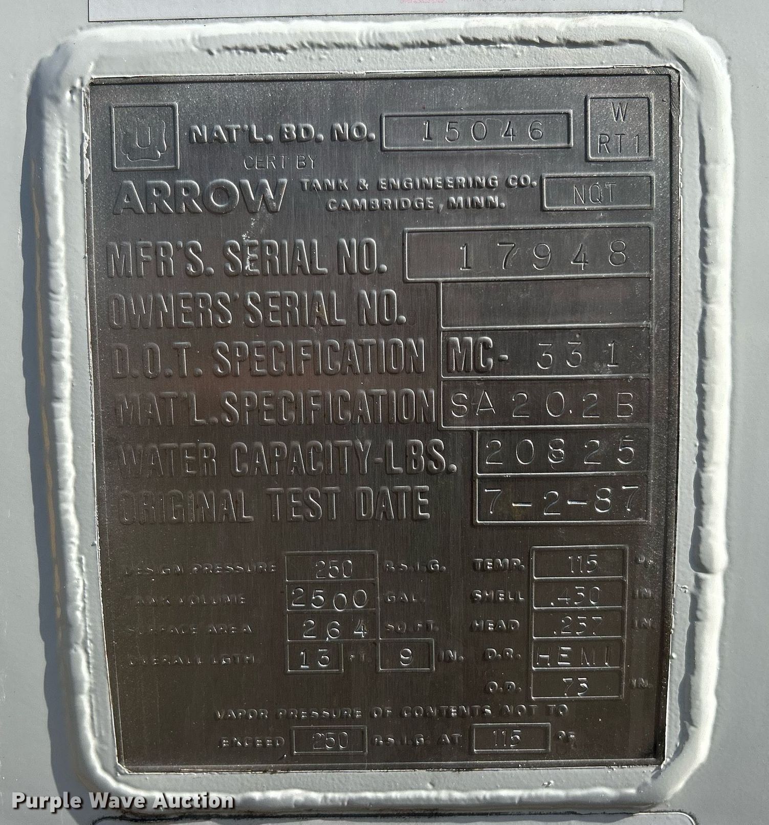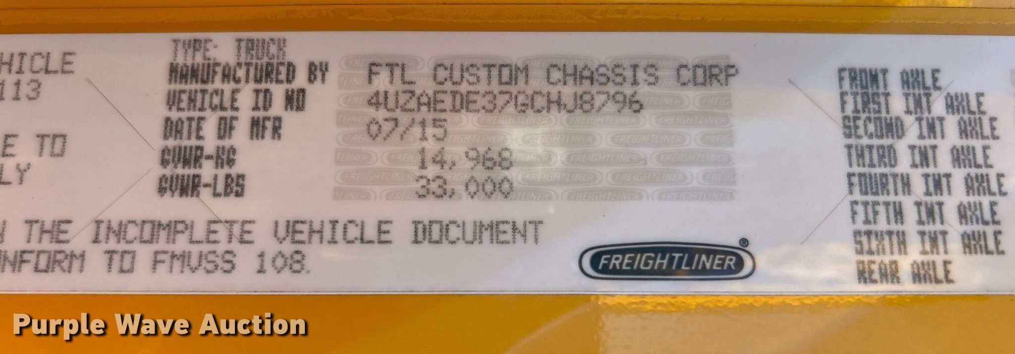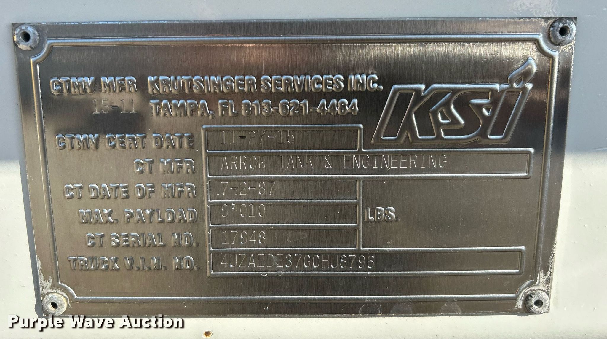2016 Freightliner S2G propane delivery truck. Miles: 145,447 on odometer, Engine hours: 12,307 on meter, VIN: 4UZAEDE37GCHJ8796. Engine Displacement: 8.0L, Cylinders: 8, Fuel type: LPG, HP: 350. Transmission Automatic. Chassis Axles: Single, Suspension: Spring, Brakes: Air, PTO, GVWR: 33,000 lbs. Interior AC, Heat, Cruise control. Features Bed / tank Arrow Tank & Engineering, Serial: 17948, 20' 1" L x 90" W, Compartments: 1, Hose reels: 1, Nozzles, Metered pumps: 1. Tires Size: 11R22.5. Notes Dash warning indicator: Check engine, Windshield chipped or cracked. Oklahoma title. Title distribution may be delayed up to 14 days from verification of funds. Collinsville, OK 74021