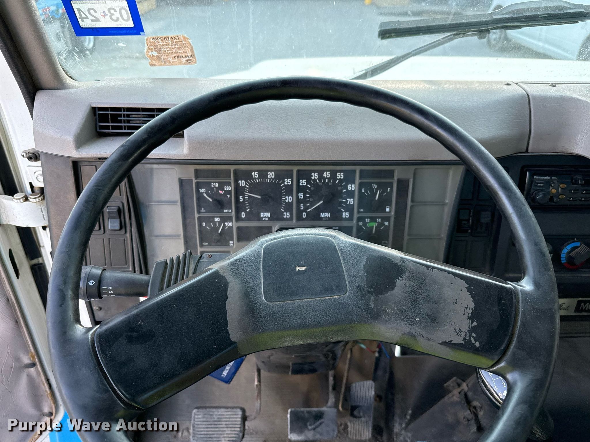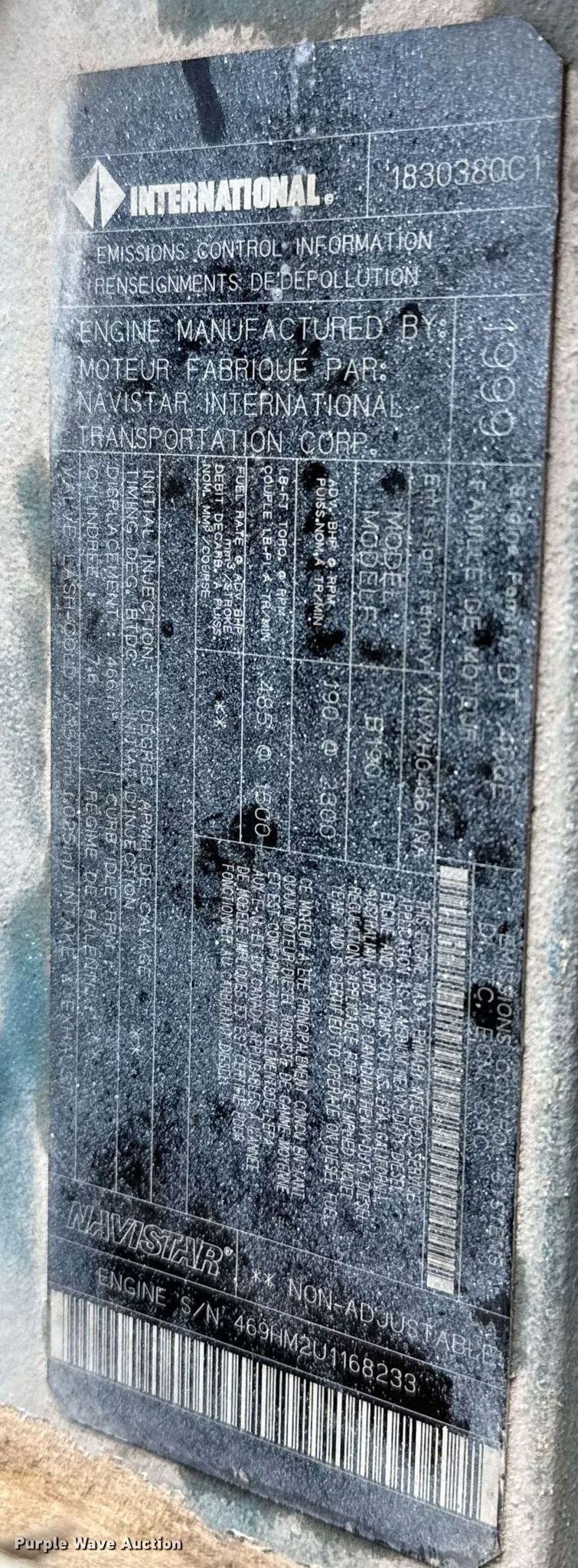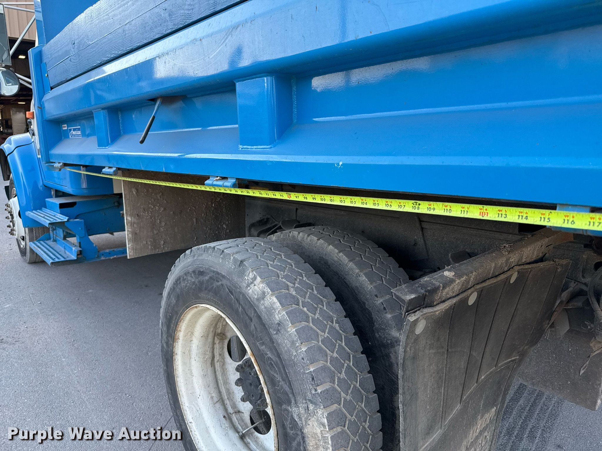 2000 International 4700 dump truck. Miles: 363,444 on odometer, VIN: 1HTSCAAM6YH243335, Unit #: 2116. Engine International B190, Serial: 469HM2U1168233, Displacement: 7.6L, Cylinders: 6, Fuel type: Diesel, HP: 190. Transmission Manual, Speed: 7. Chassis Axles: Single, Suspension: Spring, Brakes: Hydraulic, PTO, Wheelbase: 152". Interior Heat, Brake controller. Features Dump bed American, 11' L x 8' W, Side height: 16", Side board height: 9", Bed type: Steel, Ram: Single, End gate: Manual. Tires Front: 255/70R22.5, Rear: 9R22.5. Notes Windshield chipped or cracked. Texas title. Title distribution may be delayed up to 30 days from verification of funds. Wilbert Funeral Services. San Antonio, TX 78222