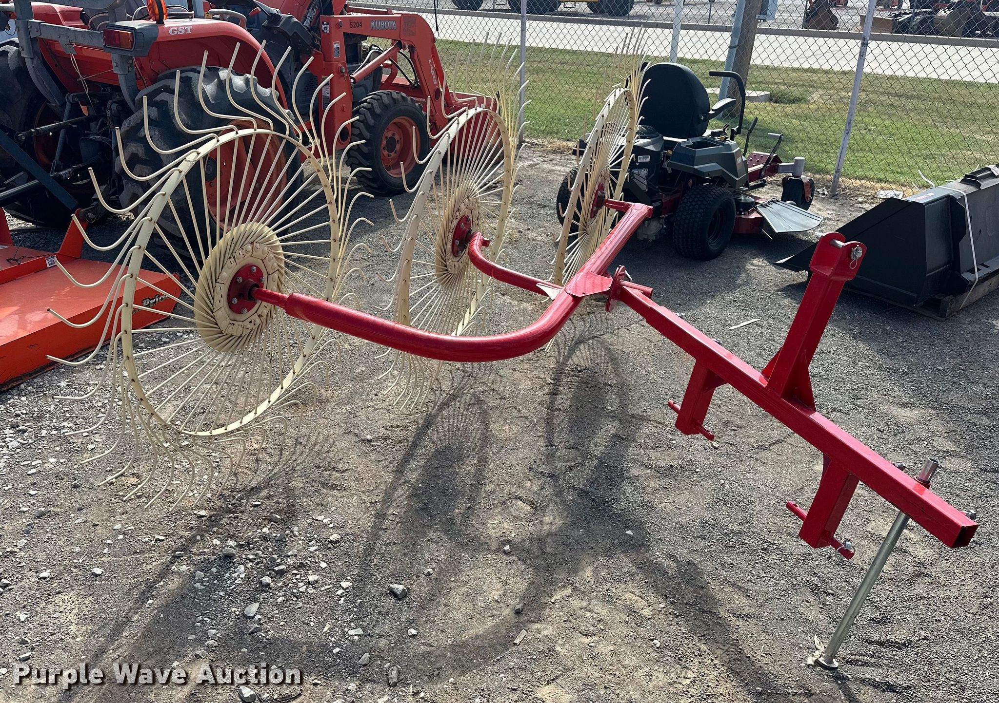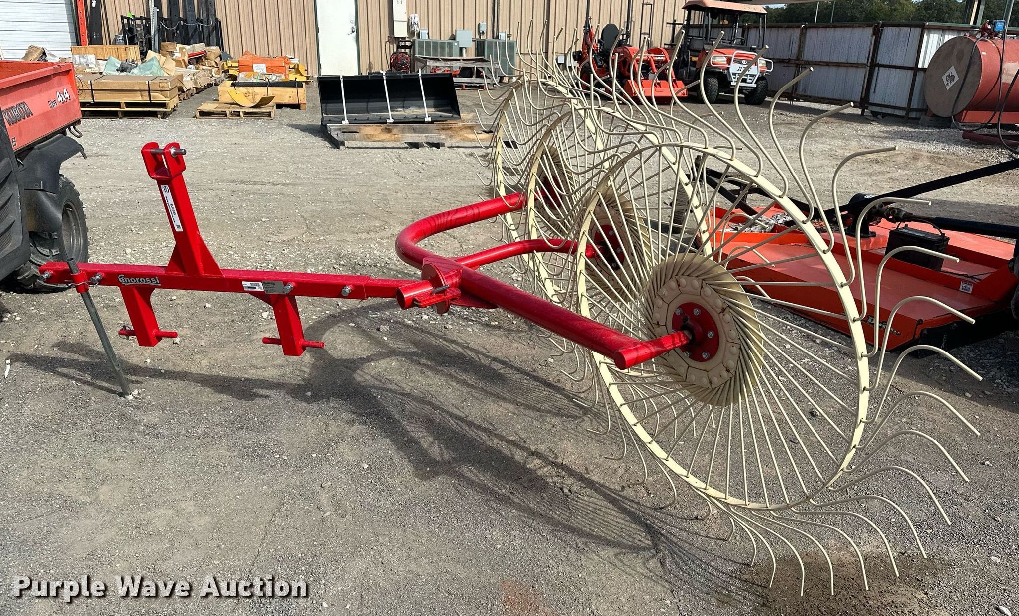 2021 Enorossi RO-3C hay rake. Serial: N17590R10-03. Features Wheels: 3 Diameter: 56", Ground driven, Hitch: Three point. Great Plains Kubota. Duncan, OK 73533