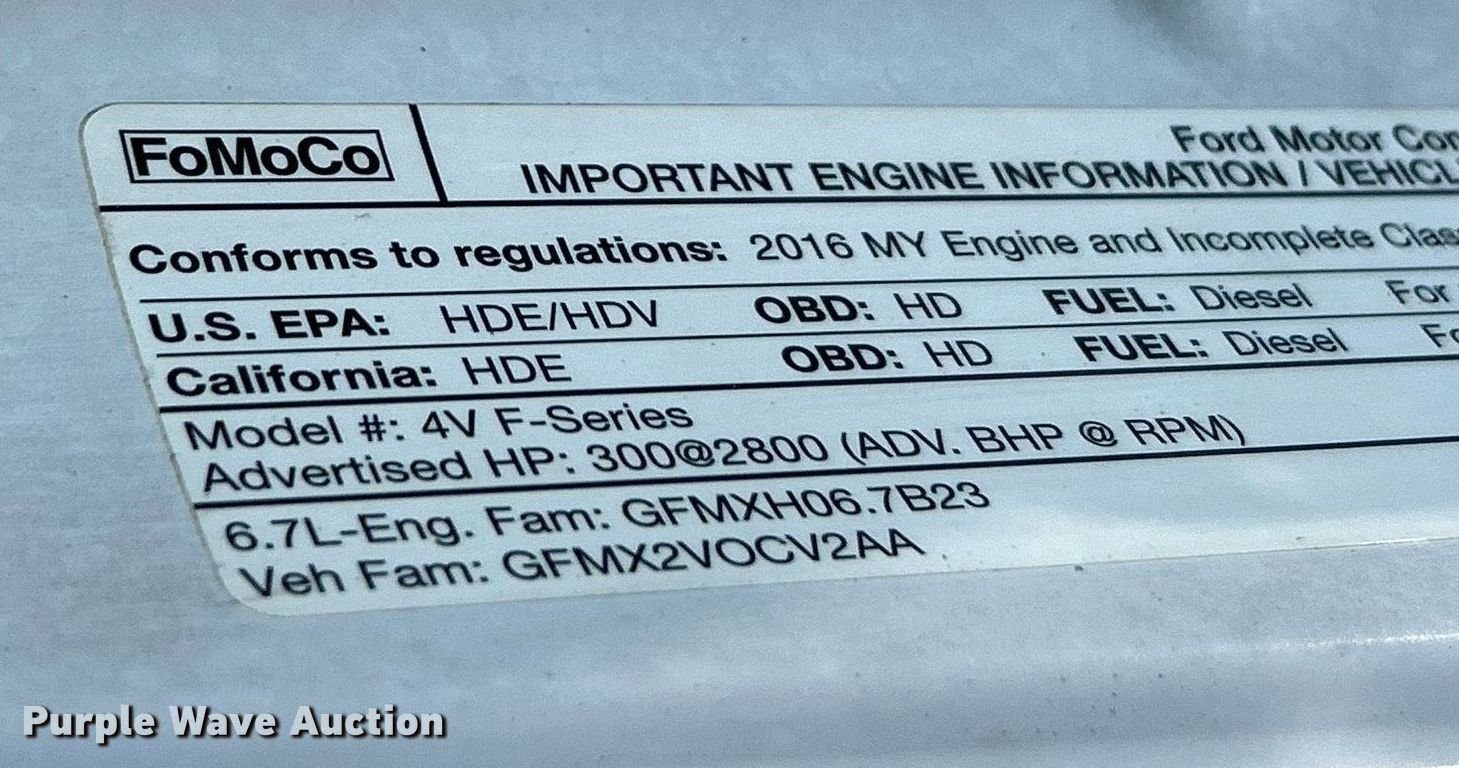 2016 Ford F550 XL Super Duty utility / service truck. Miles: 102,438 on odometer, VIN: 1FD0W5HT7GEA92243. Engine Displacement: 6.7L, Cylinders: 8, Fuel type: Diesel. Transmission Automatic. Chassis Four wheel drive, Axles: Single, Suspension: Spring, Brakes: Hydraulic, GVWR: 19,500 lbs. Interior AC, Heat, Cruise control, Auxiliary controls, Brake controller. Features Bed Knapheide, 11' L x 87" W. Tires Size: 335/80R20. Notes Dash warning indicator: Airbag, Airbag issues, will be fixed prior to auction date. Texas title. Seller is a Missouri licensed motor vehicle dealer. Title will be assigned and distributed by the dealer. Please contact the seller for distribution questions. Title distribution may be delayed up to 30 days from verification of funds. Fruendly Auto Source Inc.. Moscow Mills, MO 63362