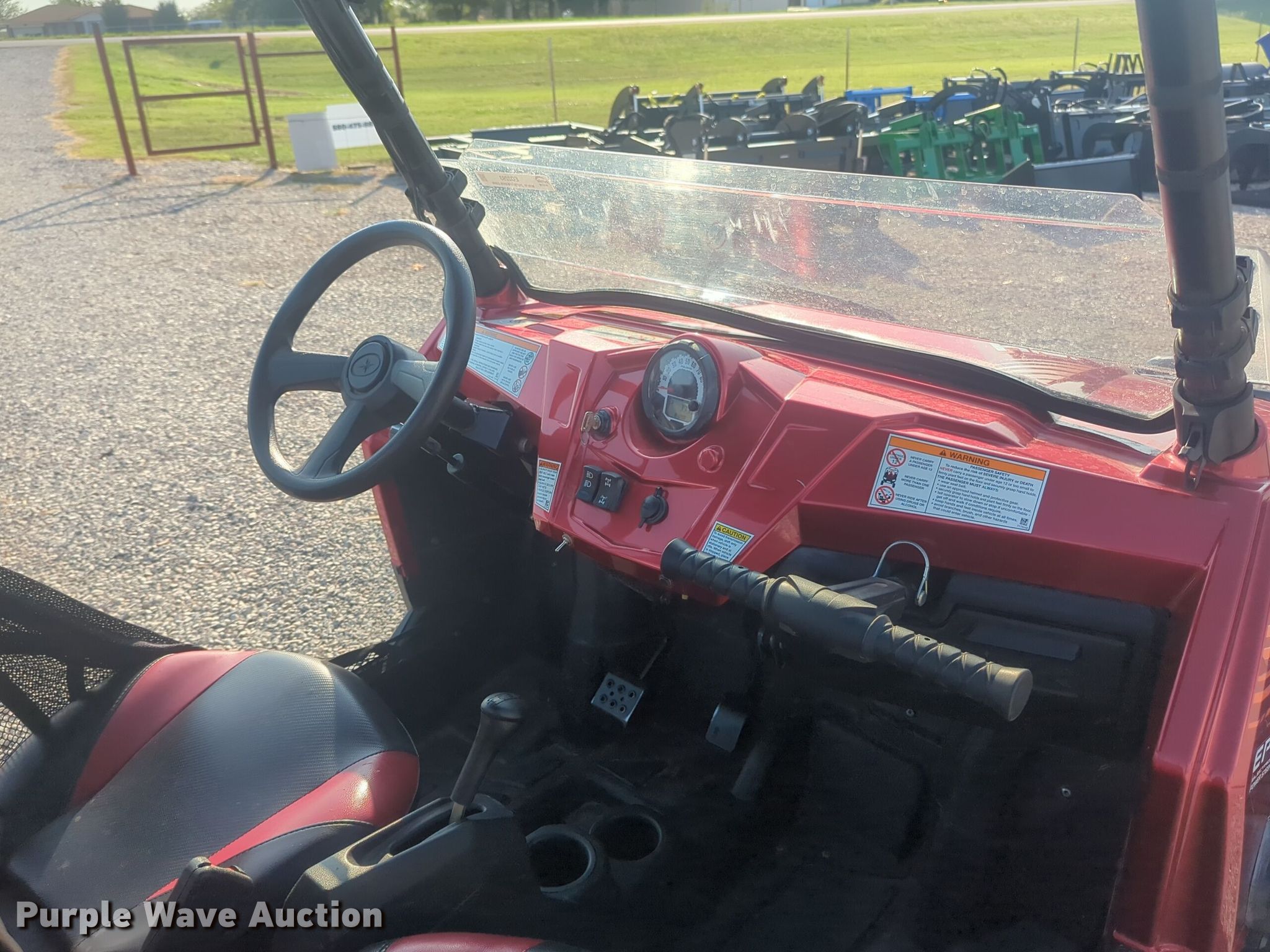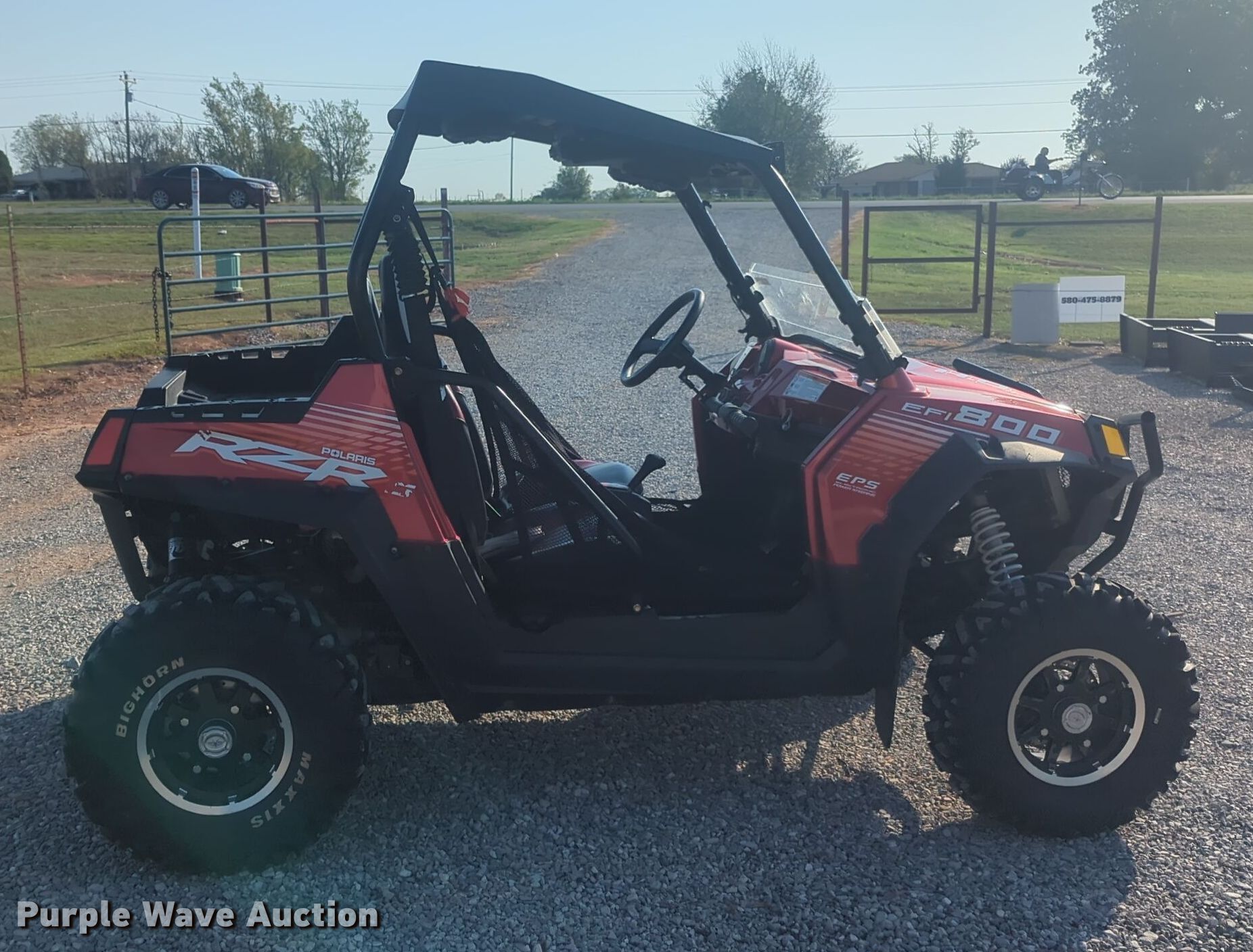 2013 Polaris RZR 800 utility vehicle. Miles: 4,528 on odometer, Hours: 334 on meter, VIN: 4XAVE7EA8DB157147. Engine Cylinders: 1, Fuel type: Gas, Electric start. Transmission Automatic. Chassis Four wheel drive/ All wheel drive. Features Grille guard, 24" L x 42" W. Tires Front: 26x9.00-12, Rear: 26x12R12. Transfer of ownership documentation will be a bill of sale. Marlow, OK 73055