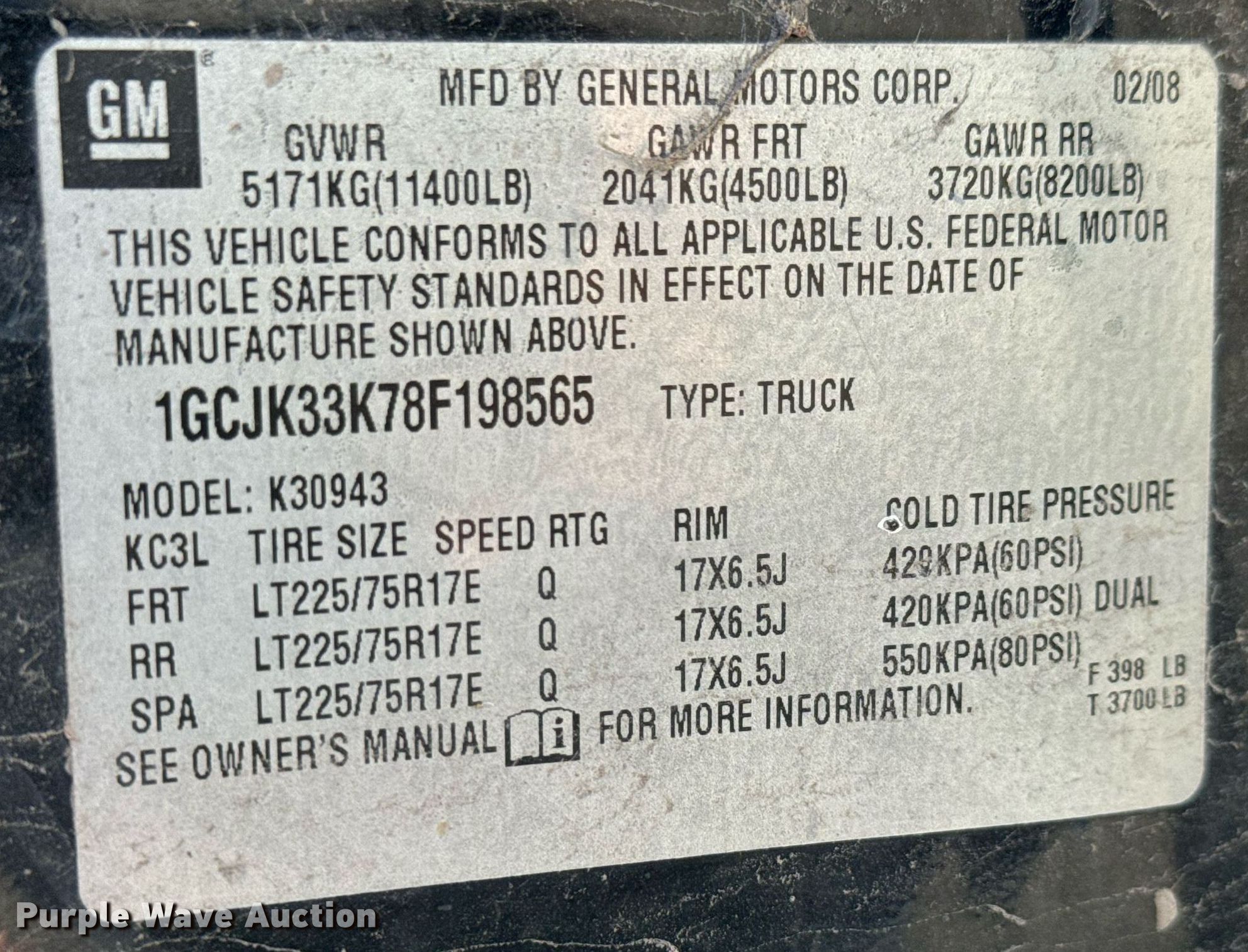 Purple Wave is selling a used 3/4 or 1 Ton Pickup or Van in Kansas. This item is a 2008 Chevrolet Silverado 3500HD Crew Cab flatbed pickup truck with the following: Miles: 165,340 on odometer, VIN: 1GCJK33K78F198565