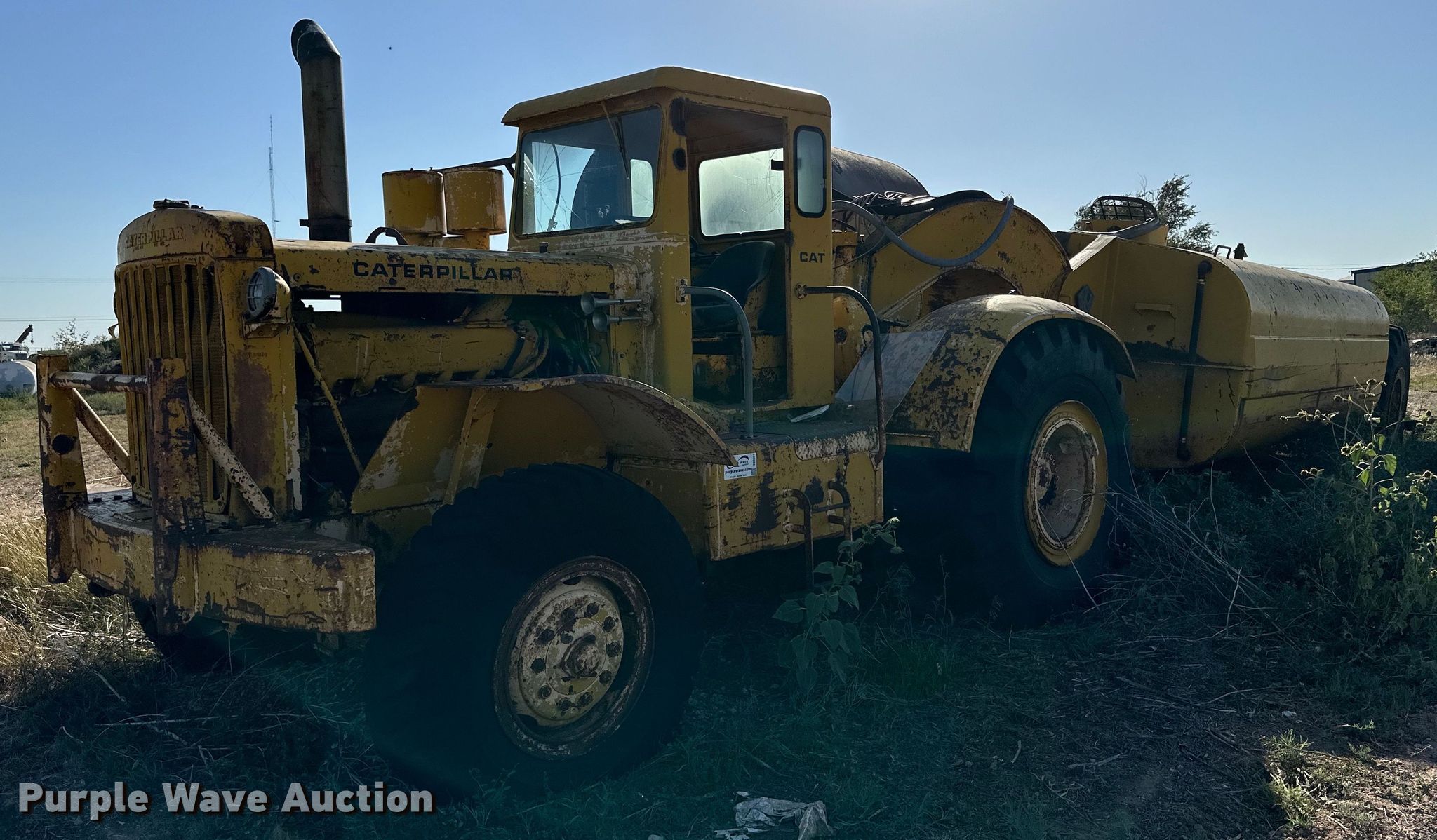 Caterpillar water wagon. Hours: Unknown, Serial: 67C968. Engine Cylinders: 6, Fuel type: Diesel. Transmission Manual, Speed: 5. Features Water tank Spray bar: Rear, In-cab spray controls. Tires Front: 14.00-24, Rear: 29.5-29. Notes Non-operational unit. Title distribution may be delayed up to 14 days from verification of funds. Holmes Construction. Amarillo, TX 79124