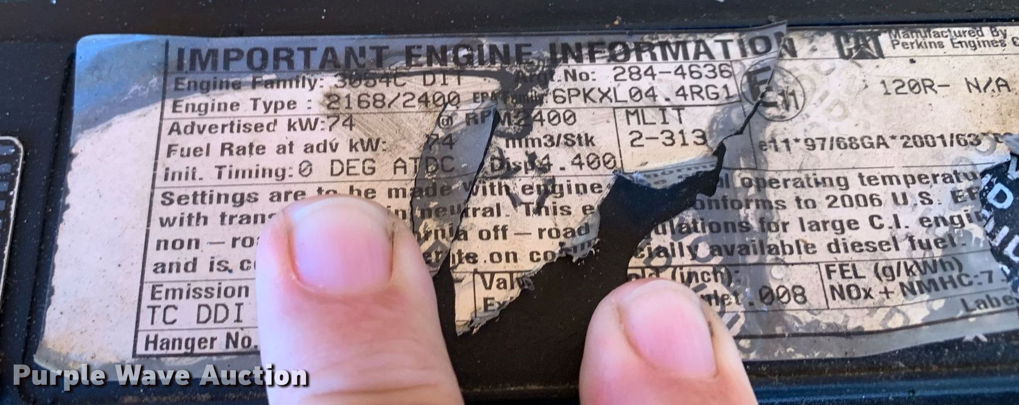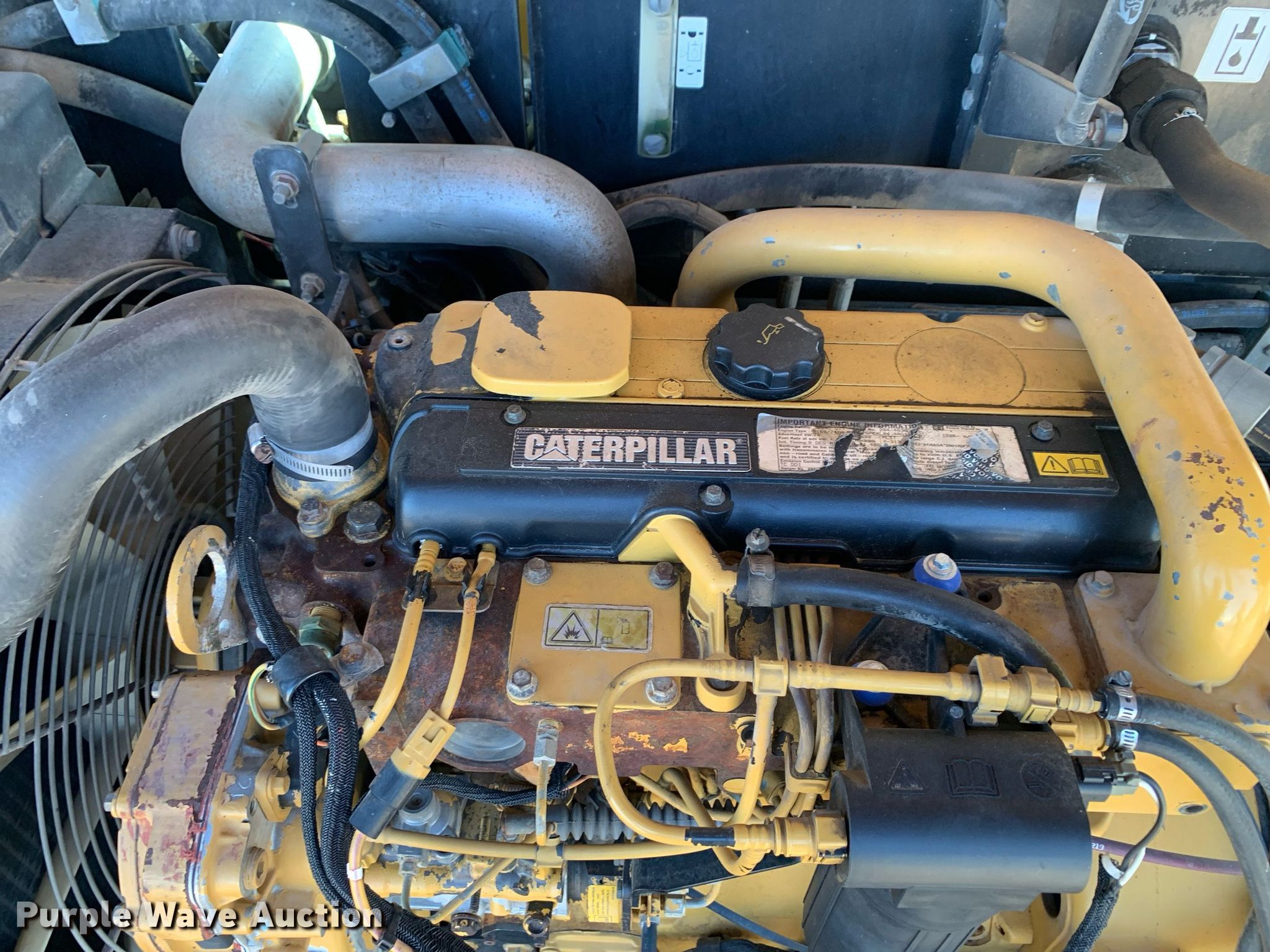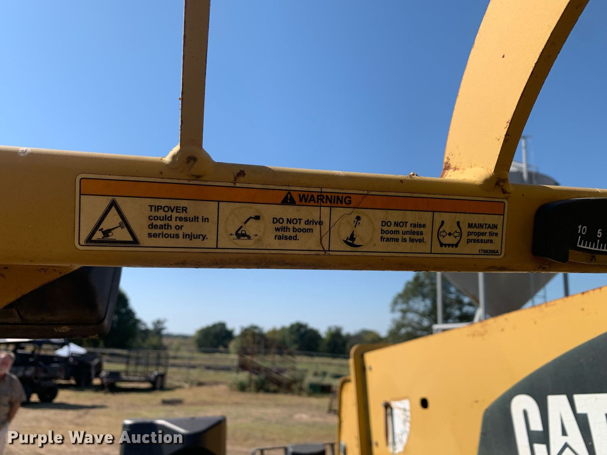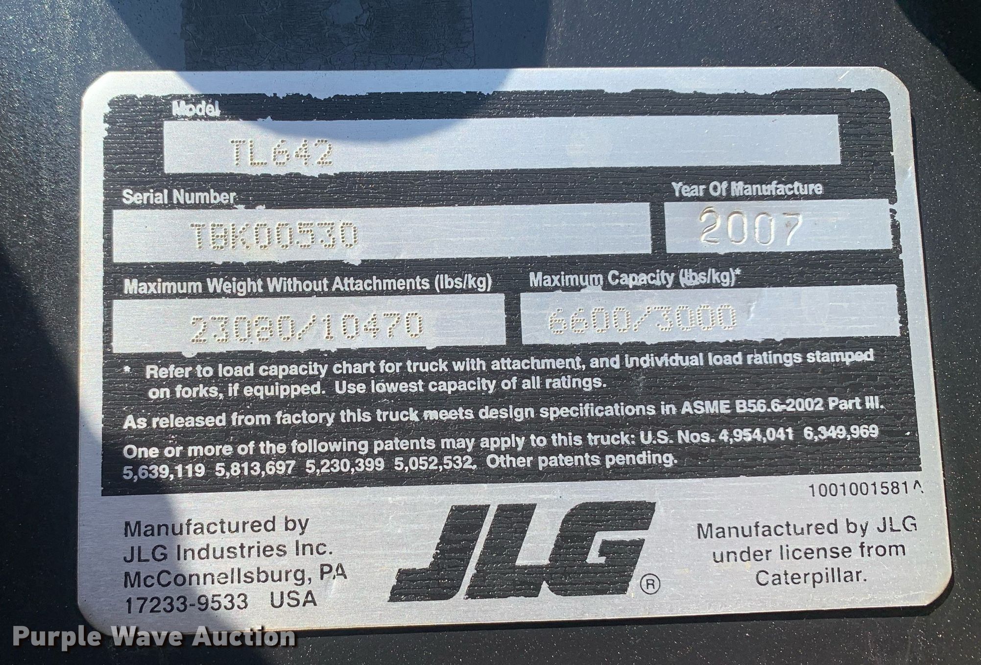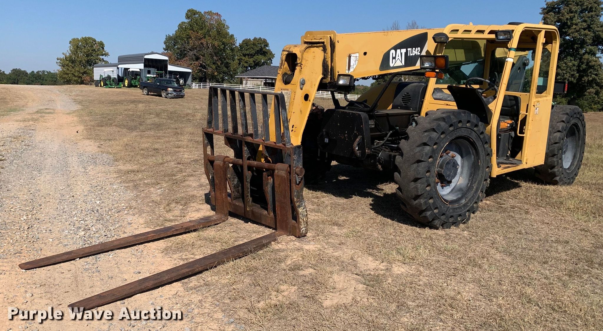 2007 Caterpillar TL642 telehandler. Hours: 4,687 on meter, Serial: TBK00530. Engine Caterpillar 3054 DIT, Displacement: 4.4L, Cylinders: 4, Fuel type: Diesel, kW: 74. Transmission Powershift, 4F - 4R, Four wheel drive. Operators station Canopy, Steering: Crab, Four wheel. Features Maximum lift capacity: 6,500 lbs, Maximum lift height: 42', Boom stages: 3, Fork length: 72", Hydraulic leveling, Auxiliary hydraulics. Tires Size: 13.00-24, Solid. Atoka, OK 74525