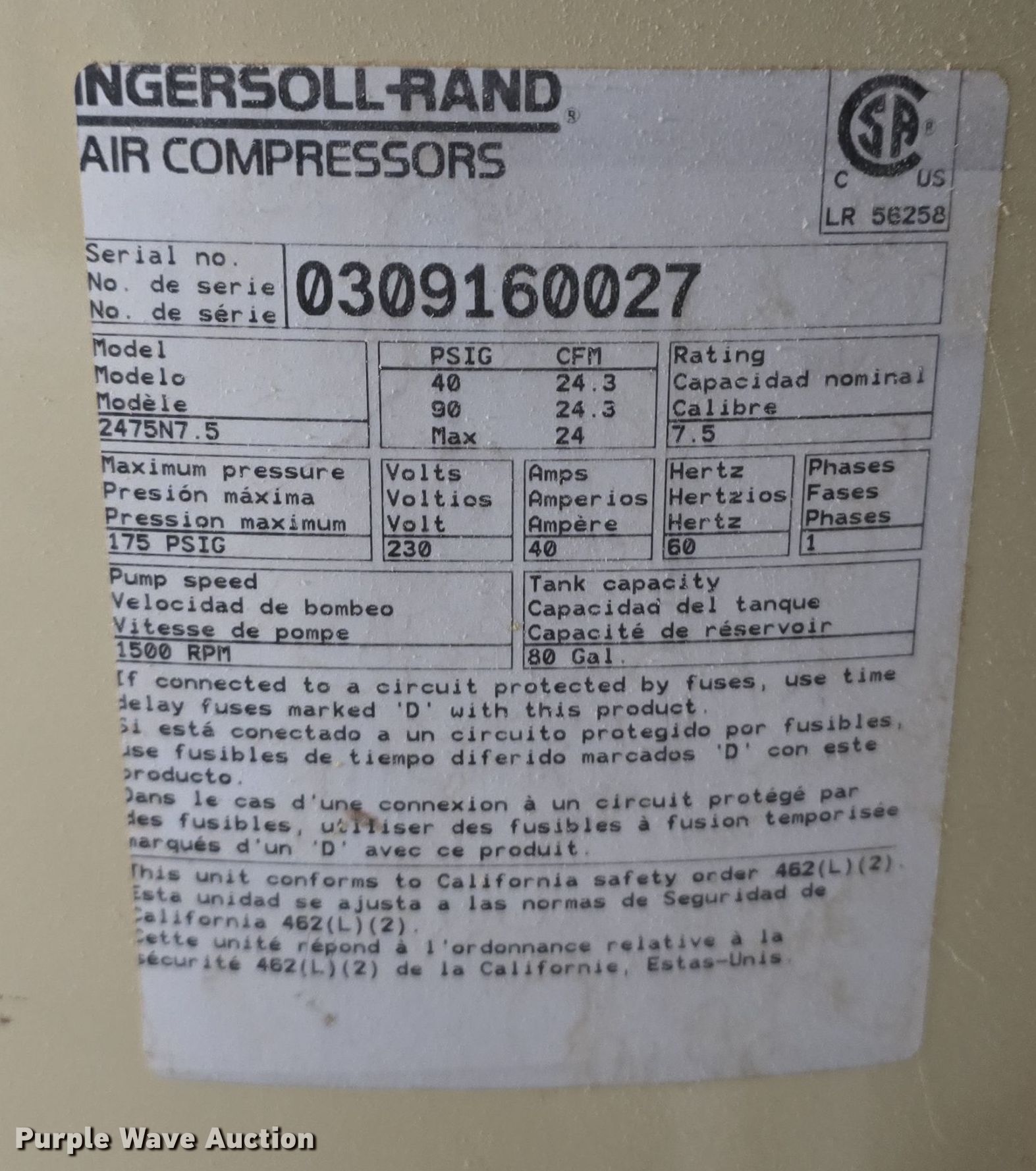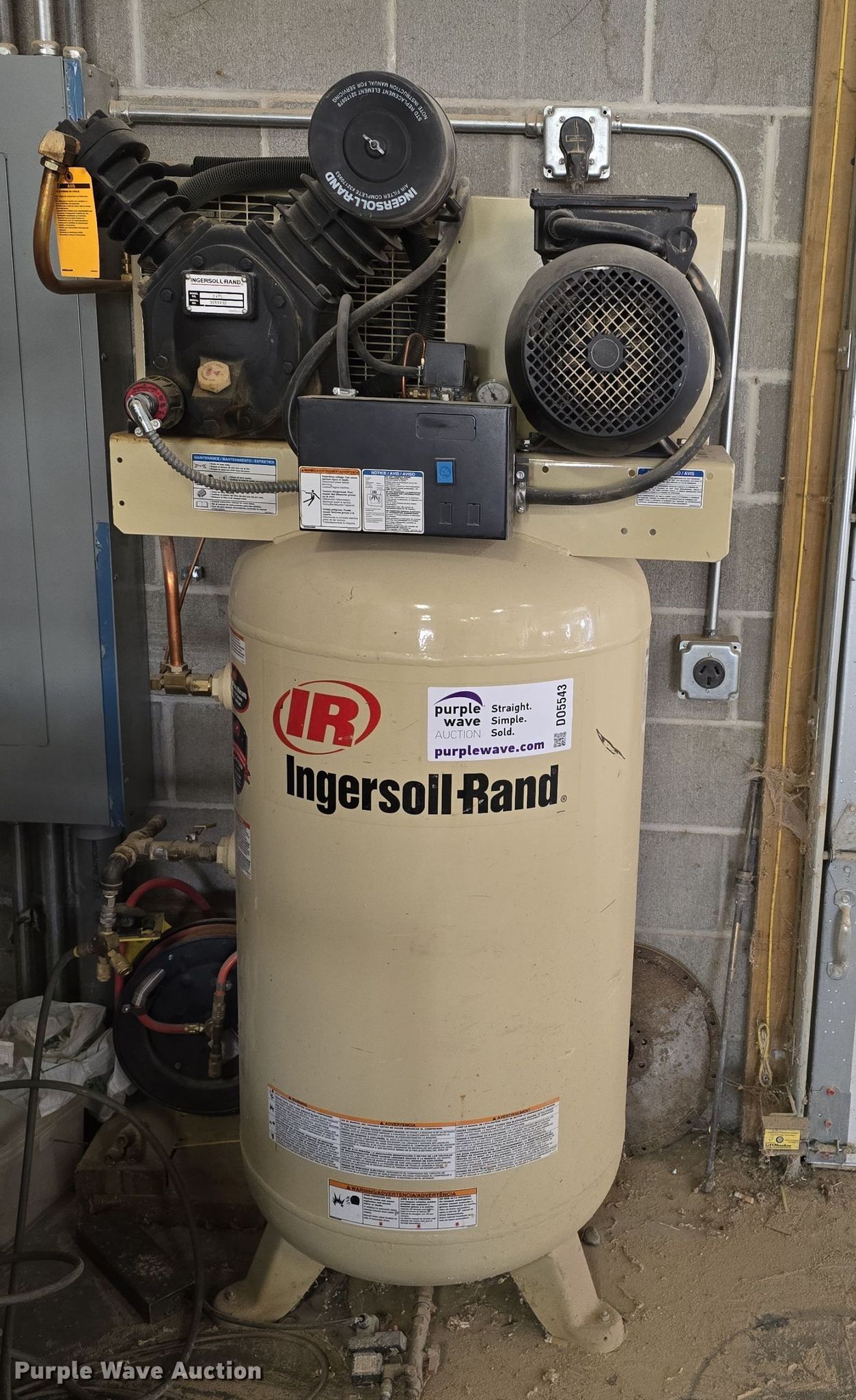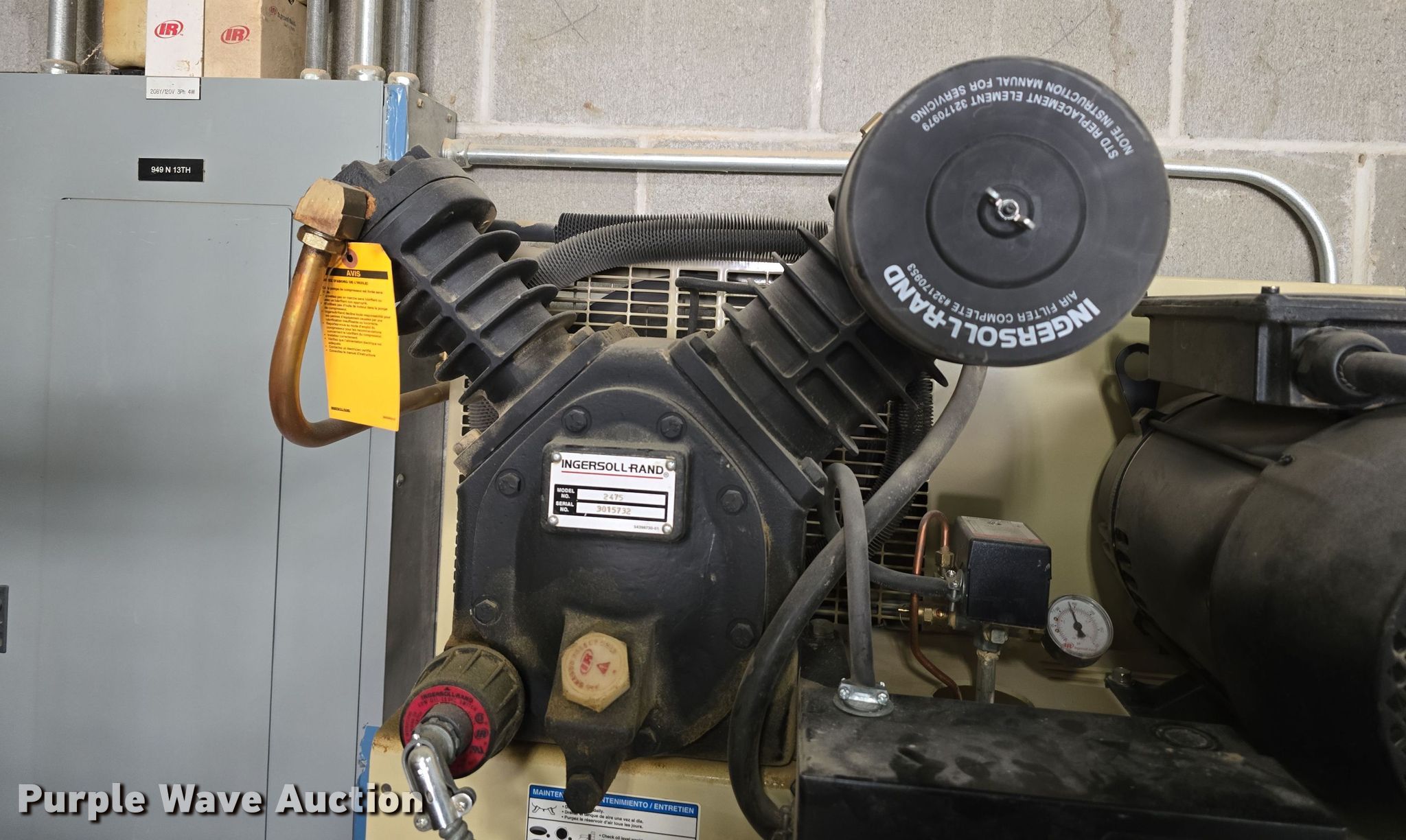Purple Wave is selling a used Air Compressor in Nebraska. This item is a Ingersoll Rand 2475N7.5 air compressor with the following: Serial: 0309160027