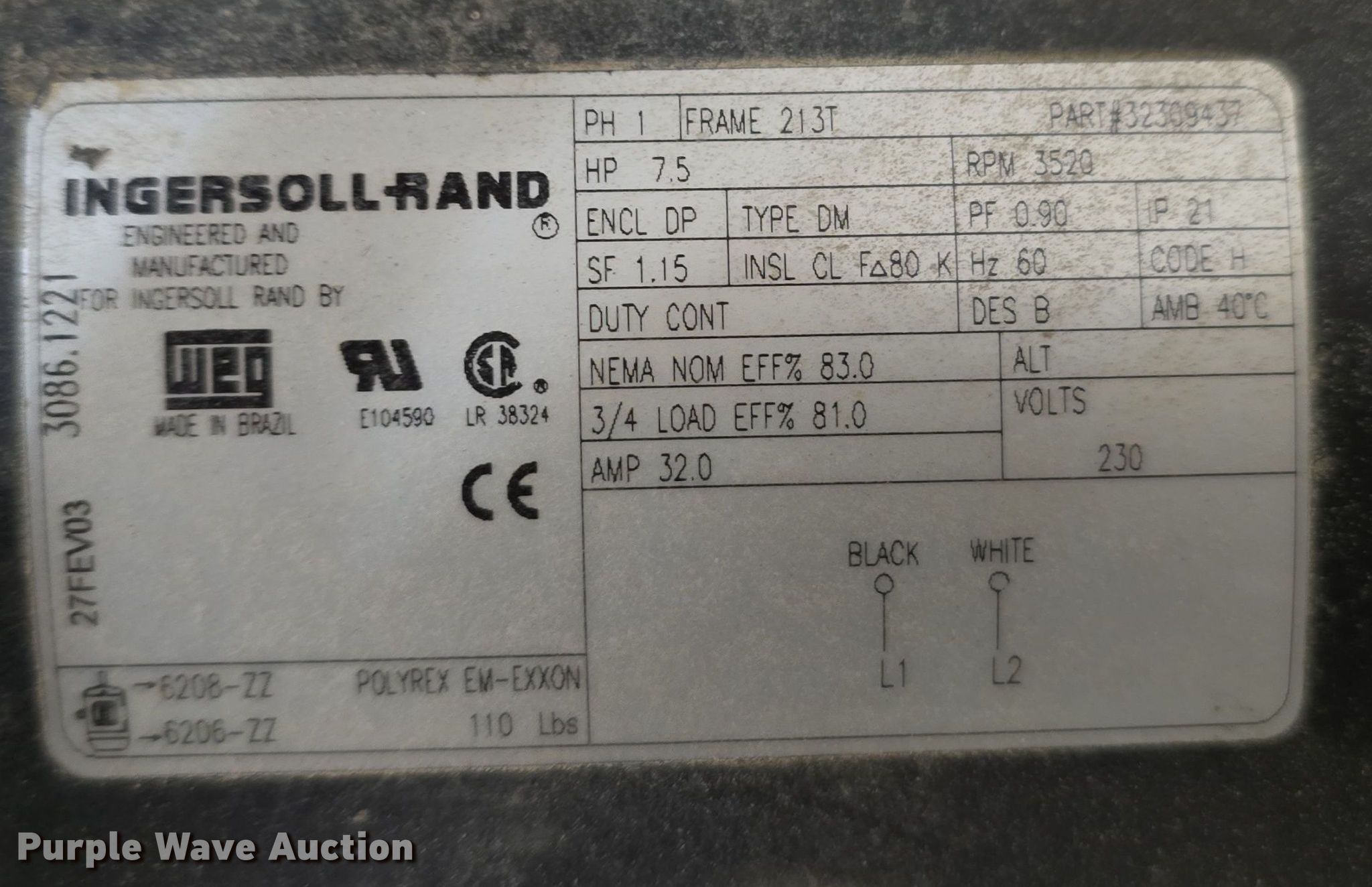Ingersoll Rand 2475N7.5 air compressor. Serial: 0309160027. Electric Motor Weg, HP: 7.5, Volts: 230, Phase: Single. Features Air compressor Ingersoll Rand 2475, CFM: 24, PSI: 175, Tank capacity: 80 gallons. Fort Calhoun, NE 68023