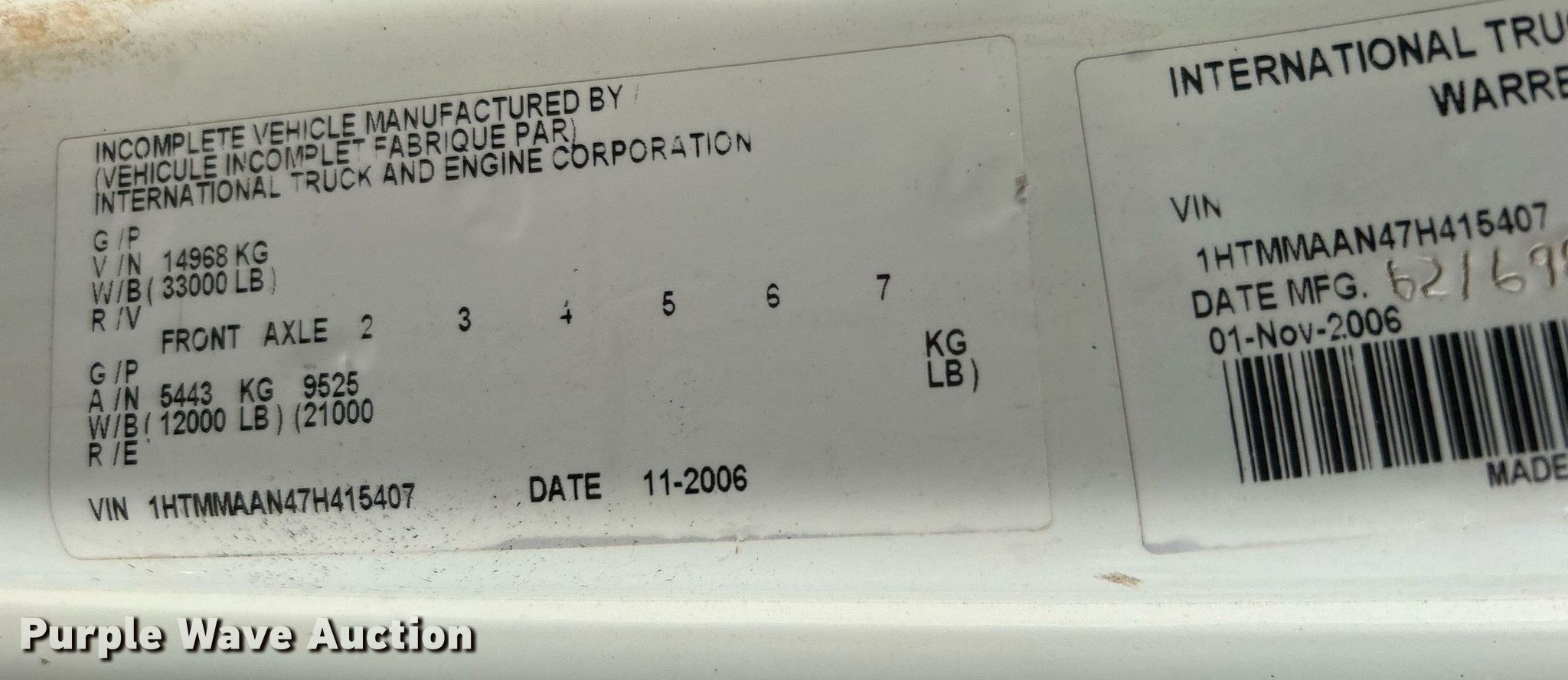 2007 International 4300 wireline truck. Miles: 173,892 on odometer, Hours: 10,137 on meter, VIN: 1HTMMAAN47H415407. Engine Navistar DT466, Displacement: 7.6L, Cylinders: 6, Fuel type: Diesel. Transmission International 6 Plus, Manual, Speed: 7. Chassis Axles: Single, Suspension: Spring, Brakes: Air, PTO, GVWR: 33,000 lbs. Interior AC, Heat. Features Bed Earhart Owen Industries 800, Serial: 800-772, Length: 16', Width: 89", Winch. Tires Size: 11R22.5. Notes Dash warning indicator: ABS, Check AC, Windshield chipped or cracked, Non-operational fuel gauge, Passenger door exterior handle broken. Oklahoma title. Title distribution may be delayed up to 14 days from verification of funds. Merriman Trucking. Cleveland, OK 74020