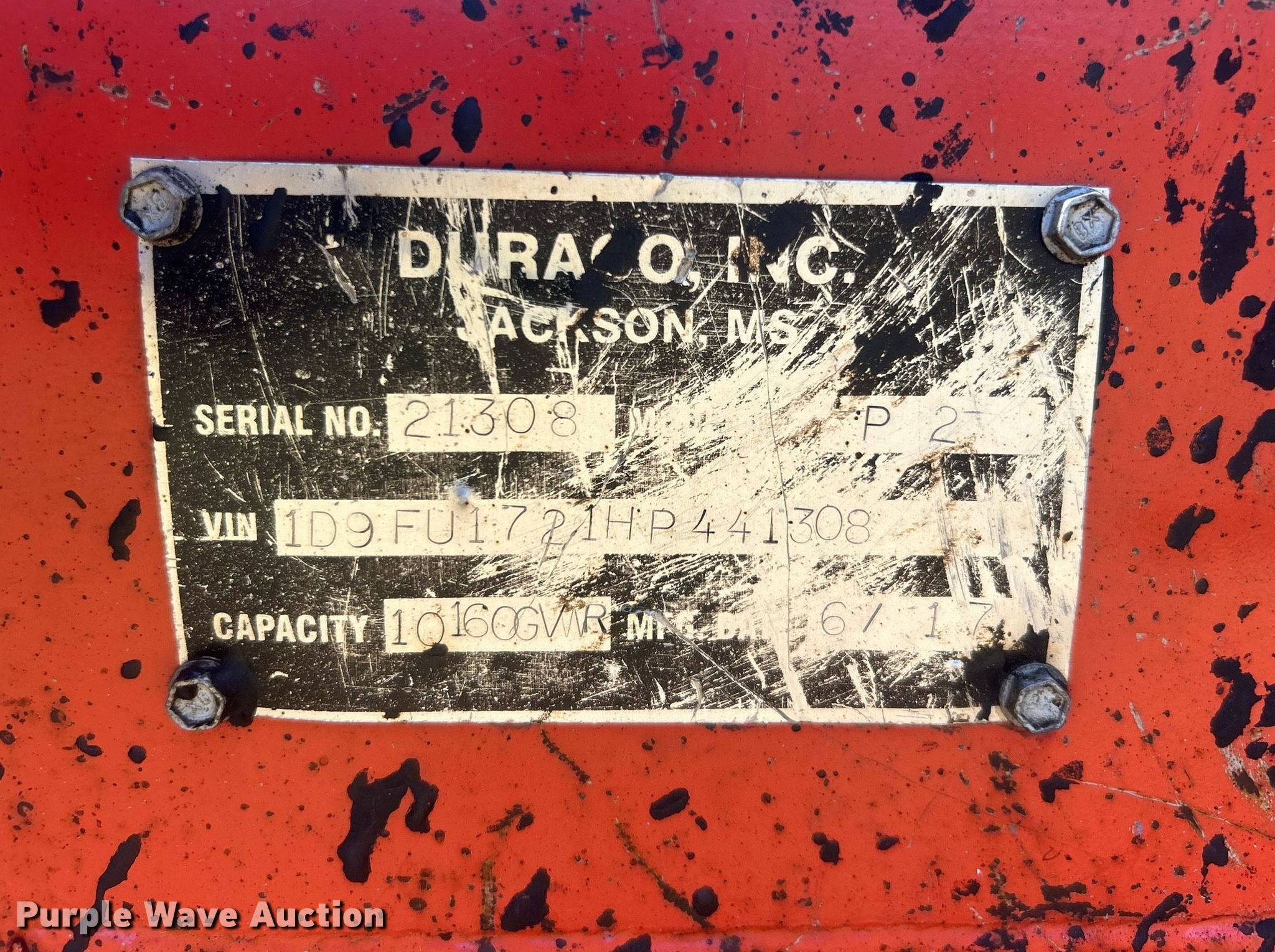 Purple Wave is selling a used Pot Hole Patcher in Oklahoma. This item is a 2017 DuraCo DuraPatcher P2 spray injection pothole patcher with the following: VIN: 1D9FU1721HP441308