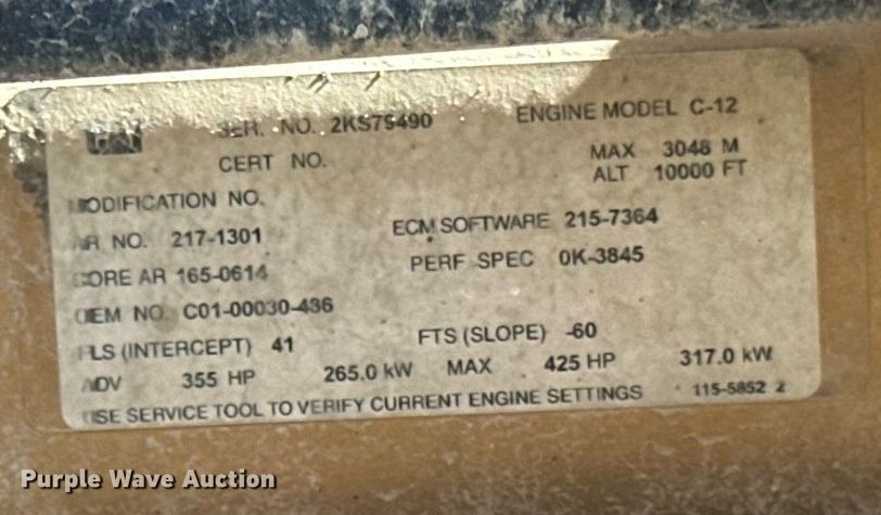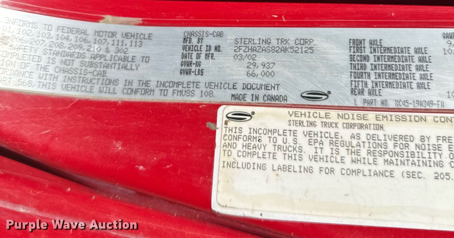 2002 Sterling LT9511 ready mix truck. Miles: 400,738 on odometer, Hours: 27,542 on meter, VIN: 2FZHAZAS82AK52125. Engine Caterpillar C12, Displacement: 12.0L, Cylinders: 6, Fuel type: Diesel. Transmission Eaton Fuller Roadranger RTO-9 MLL, Manual, Speed: 11. Chassis Axles: 4, Pusher axle Steerable, Tag axle Steerable, Differential lock: Full, Suspension: Spring over walking beam, Brakes: Air, PTO, GVWR: 80,000 lbs FAWR: 20,000 lbs, IAWR: 23,000 lbs, RAWR: 23,000 lbs, Lift axle GAWR: 11,020 lbs. Interior AC, Heat, Heated mirrors, Power windows, Cruise control. Features Mixer McNeilus 11 cubic yard mixer, Serial: 62716-09053, Capacity: 11 cu.yd., Discharge: Rear, In-cab controls, Rear drum controls, Water tank capacity: 15 gallons, Chute Extensions: 3, Chute type: Steel.. Tires Front: 425/65R22.5, Rear: 11R22.5, Lift axle: 255-70R22.5. Notes Dash warning indicator: Engine warning, Dead battery. South Dakota title. Consolidated Ready Mix Inc.. Bellingham, MN 56212