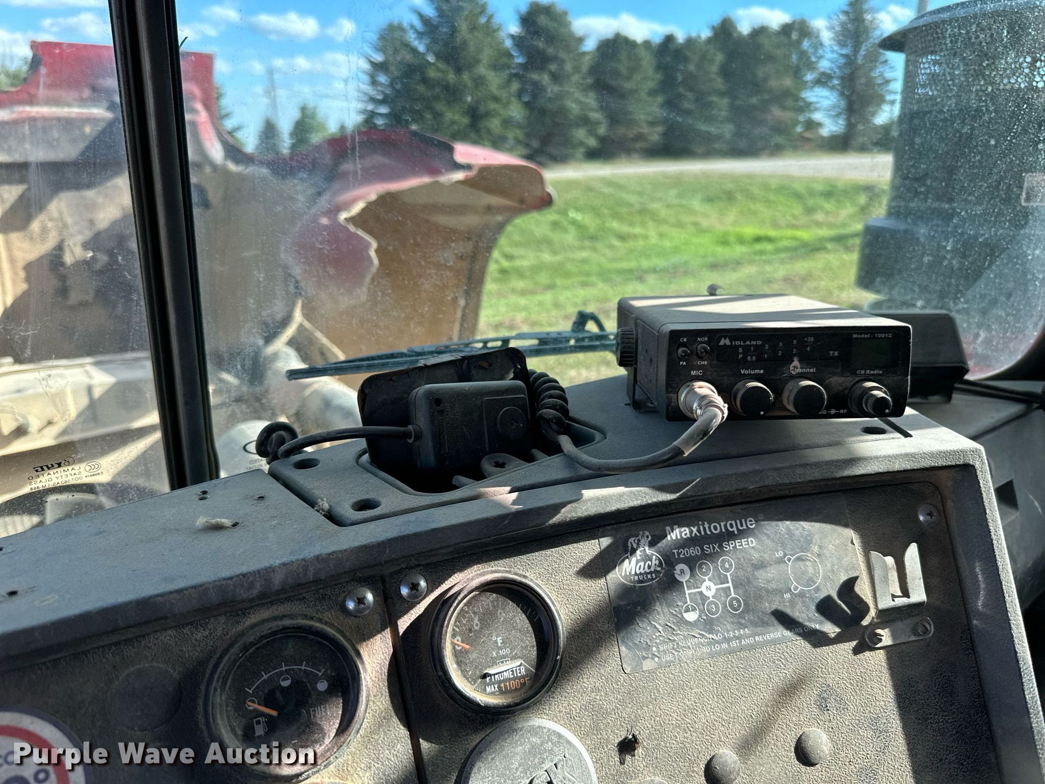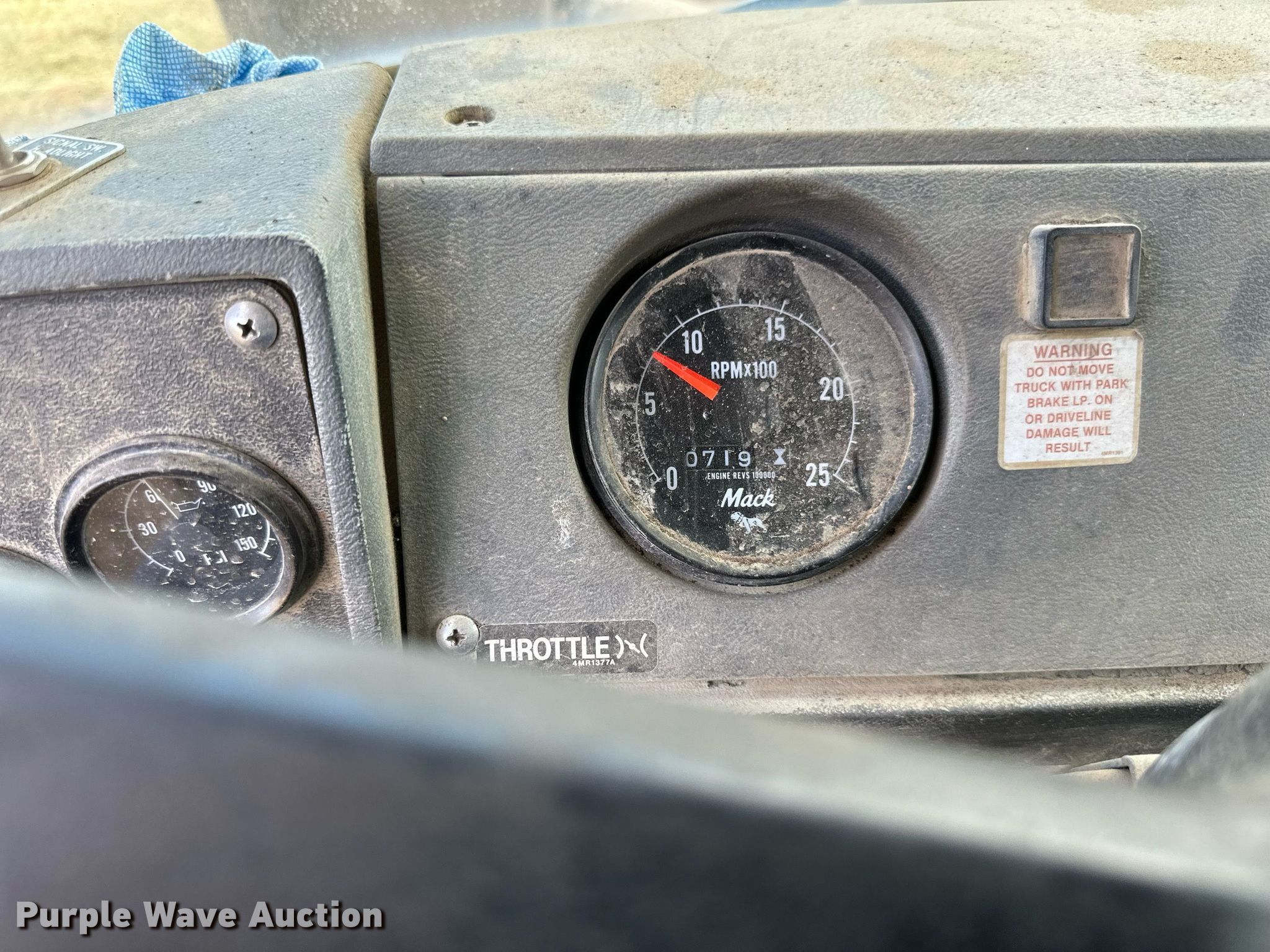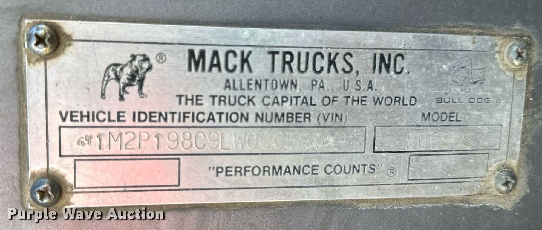 1990 Mack RD690S dump truck. Miles: 16,726 on odometer, Hours: 719 on meter, VIN: 1M2P198C9LW006584. Engine Displacement: 11.0L, Cylinders: 6, Fuel type: Diesel. Transmission Mack T2060, Manual, Speed: 6. Chassis Axles: Triple, Suspension: Camelback, Brakes: Air, PTO. Interior Heat. Features Dump bed 16' L x 94" W, Side height: 44", Side board height: 10", Bed type: Steel, Ram: Single, End gate: Air operated. Tires Front: 385\65R22.5, Rear: 11R22.5, Lift axle: 11R22.5. South Dakota title. Consolidated Ready Mix Inc.. Bellingham, MN 56212