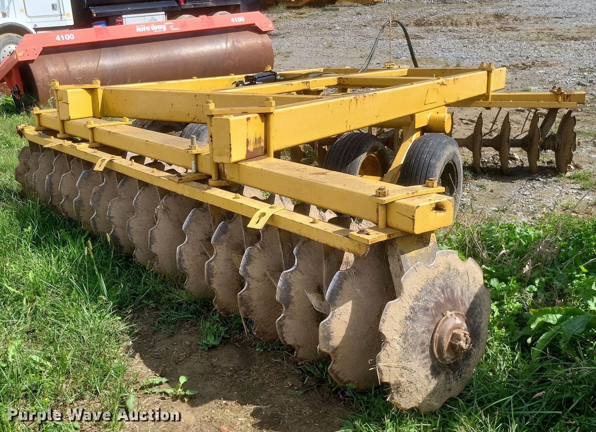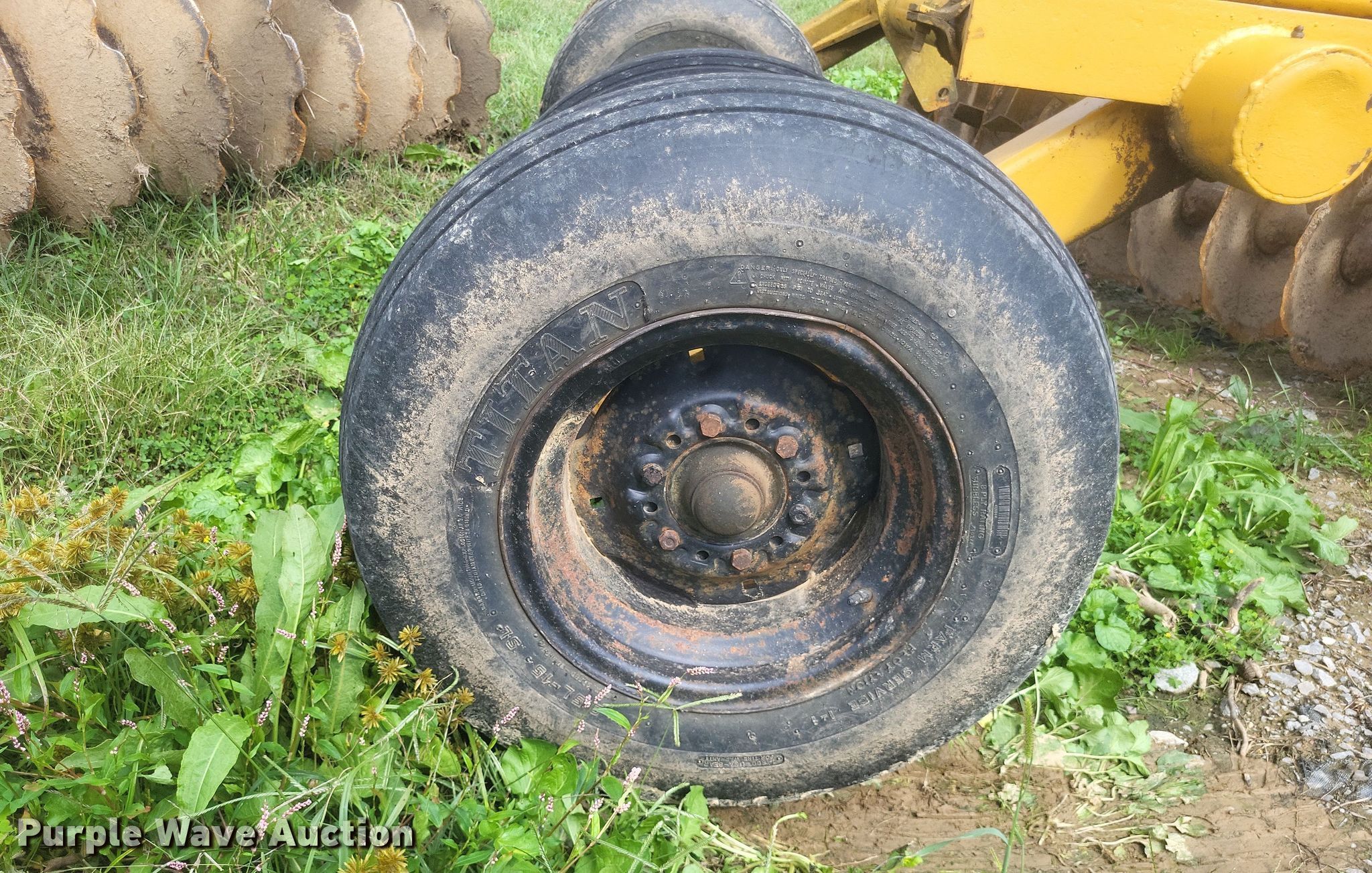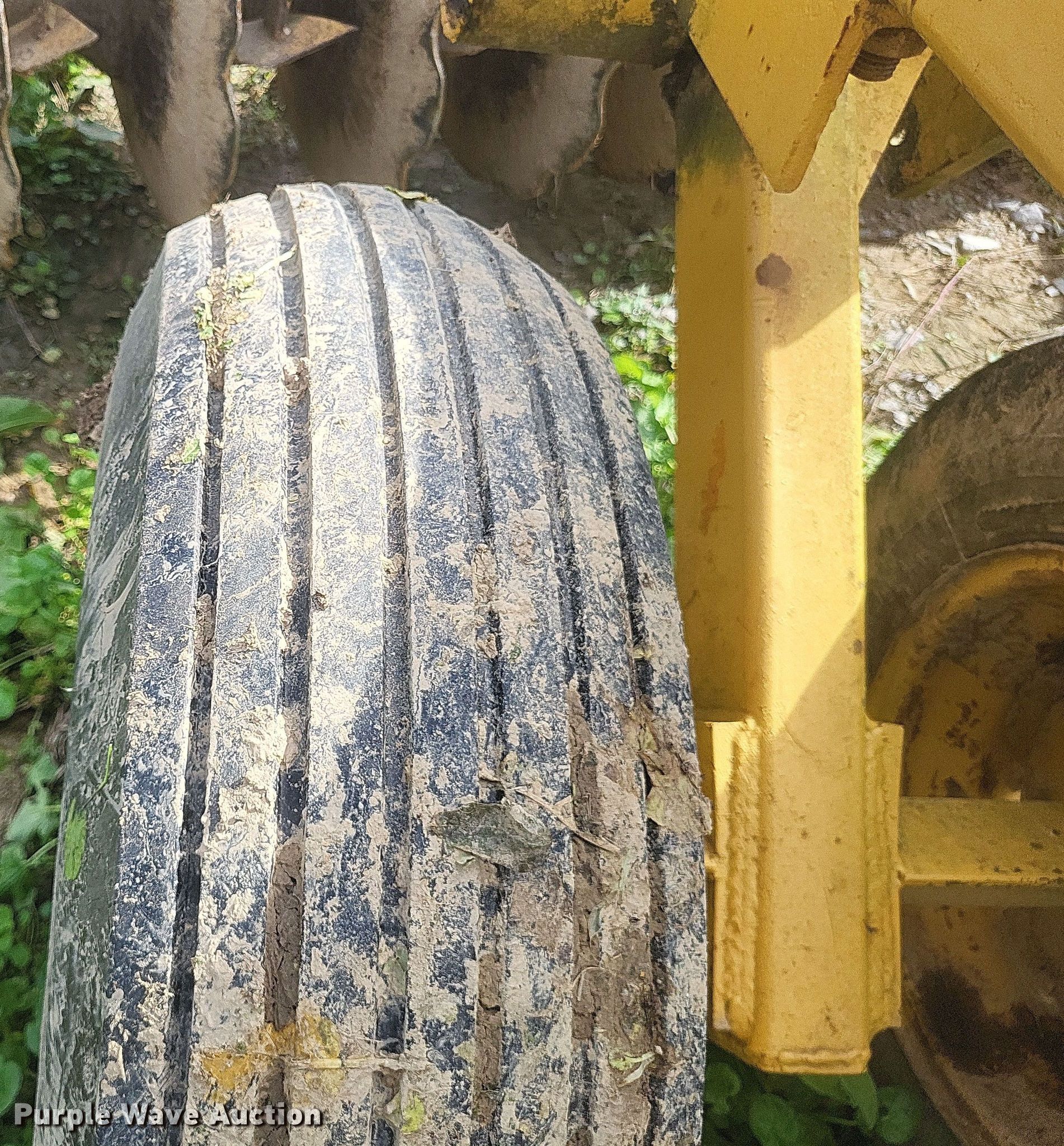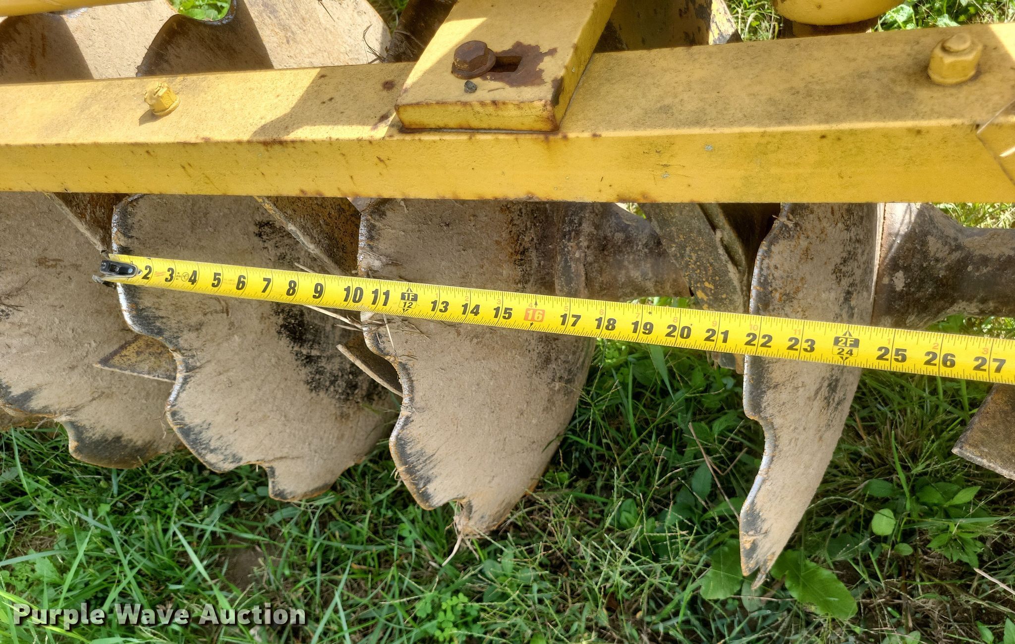 Cook disk. Overall width: 13'. Features Front blades Diameter: 24", Spacing: 10", Rear blades Diameter: 24", Spacing: 10", Disk scrapers, Operation Hydraulic lift. Tires Tire size: 9.5L-15. Oak Hill Equipment, LLC. Ewing, IL 62836