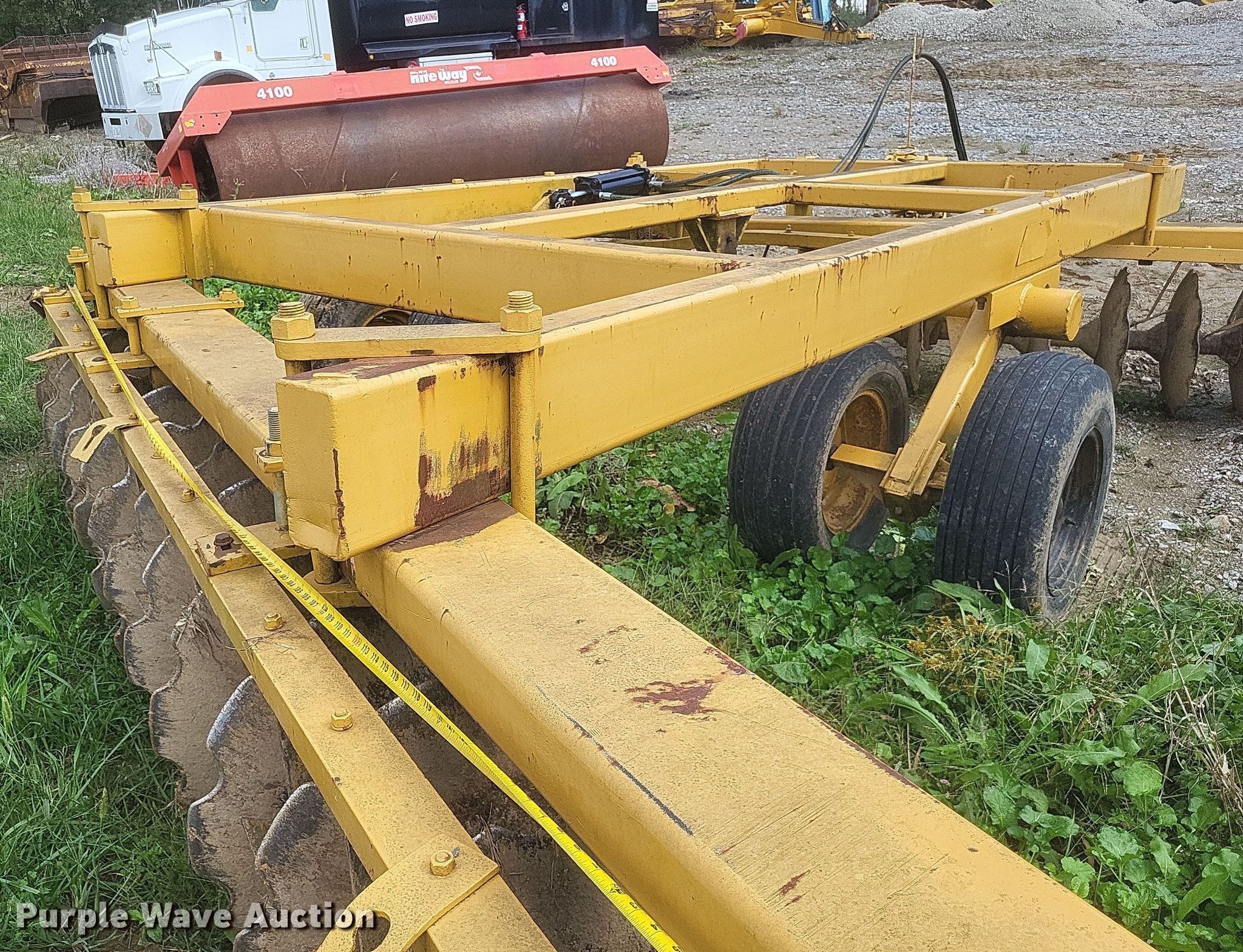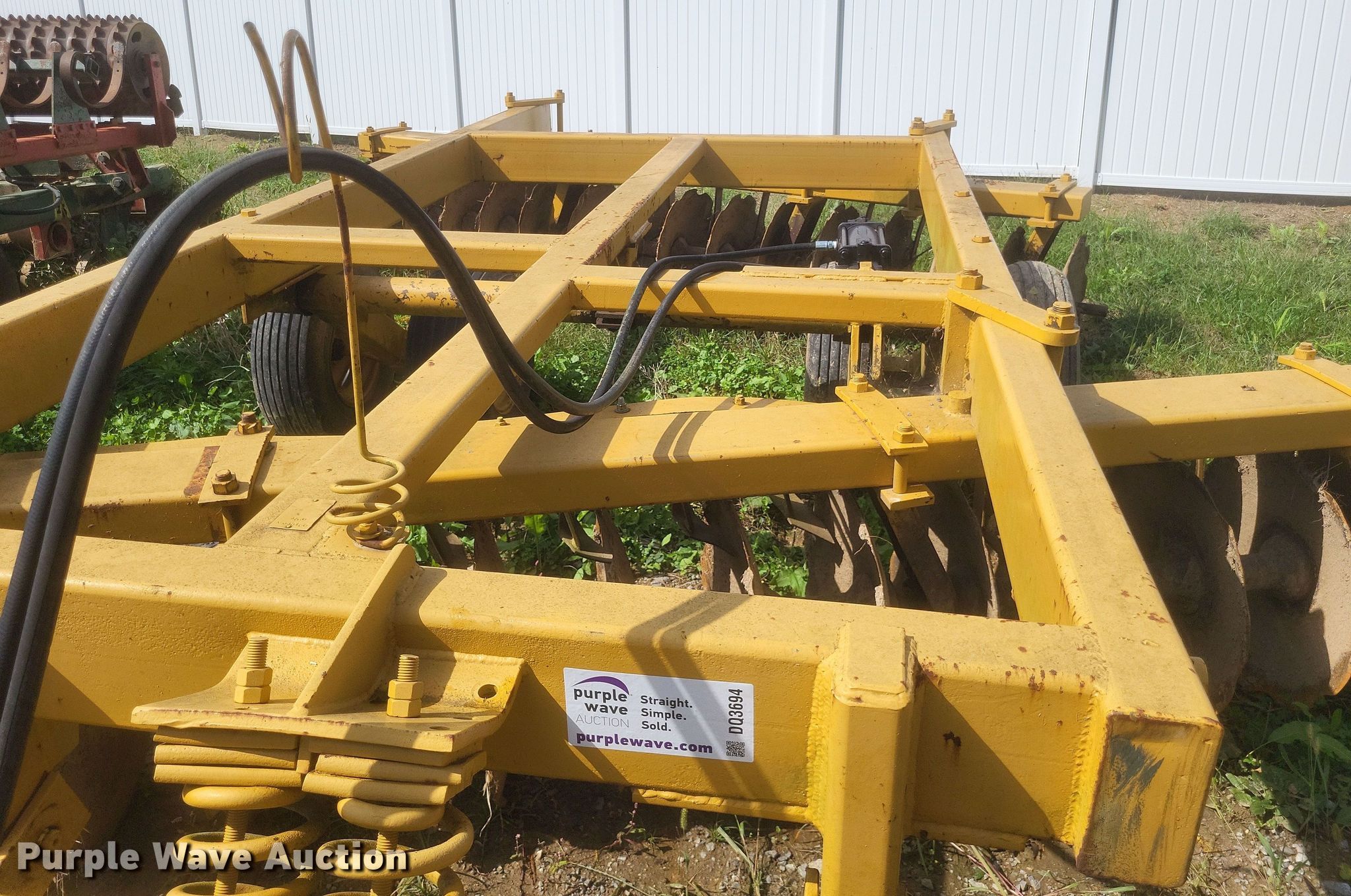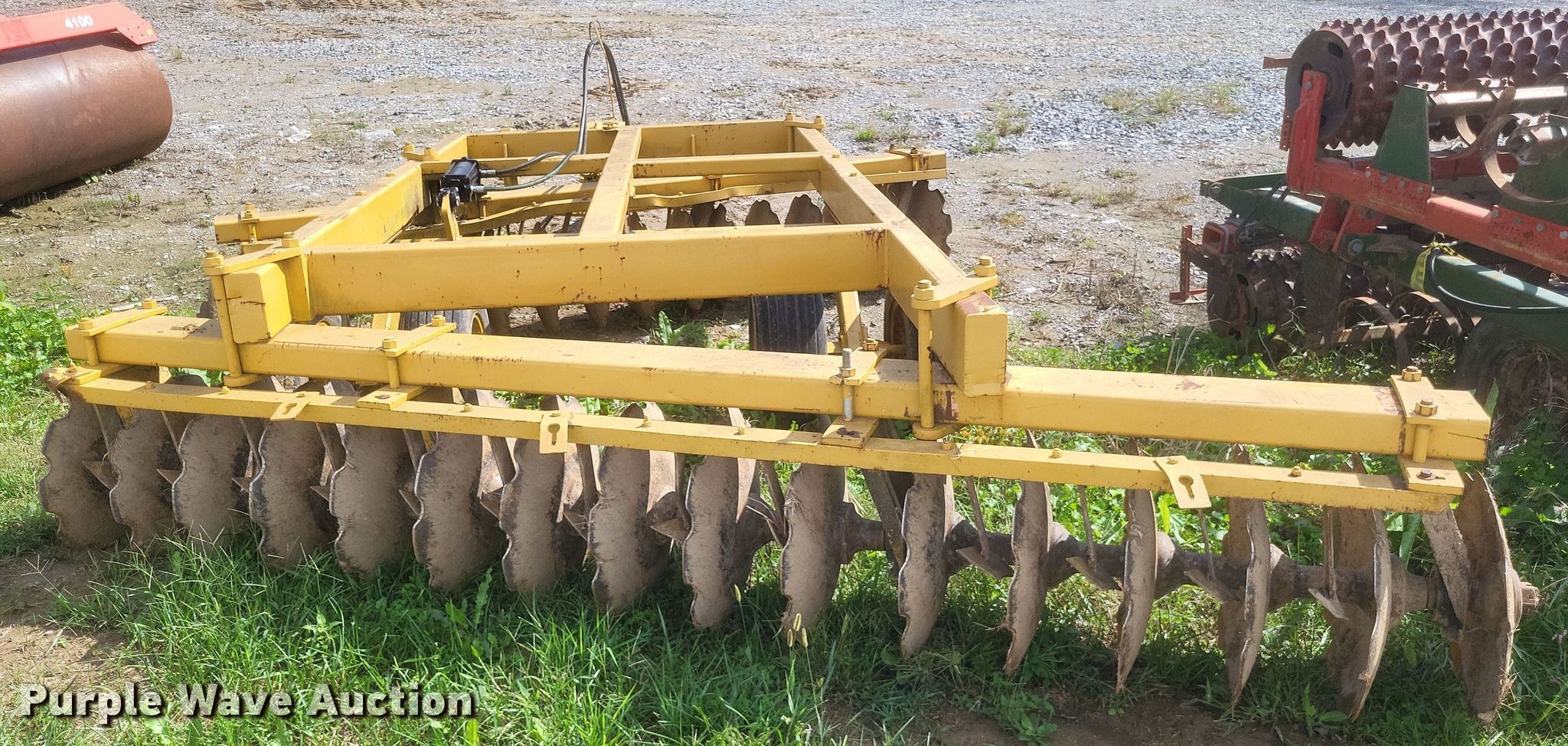 Cook disk. Overall width: 13'. Features Front blades Diameter: 24", Spacing: 10", Rear blades Diameter: 24", Spacing: 10", Disk scrapers, Operation Hydraulic lift. Tires Tire size: 9.5L-15. Oak Hill Equipment, LLC. Ewing, IL 62836