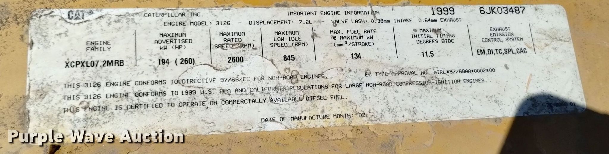 1999 Caterpillar 950G wheel loader. Hours: 17,208 on meter, Miles or hours may vary, unit still in use, Serial: 5FW00896, Unit #: T12. Engine Caterpillar 3126, Displacement: 7.2L, Cylinders: 6, Fuel type: Diesel, HP: 260. Transmission Powershift, 4F - 4R. Operators station Enclosed cab, AC, Heat, Bucket controls: Two-lever. Features Quick coupler: Hydraulic, Bucket Caterpillar, Width: 113", Cutting edge: Bolt-on, Forks Caterpillar, Length: 72". Tires Size: 23.5-25. Notes Glass cracked, Right side door missing. R3 Contractors. Anaheim, CA 92801