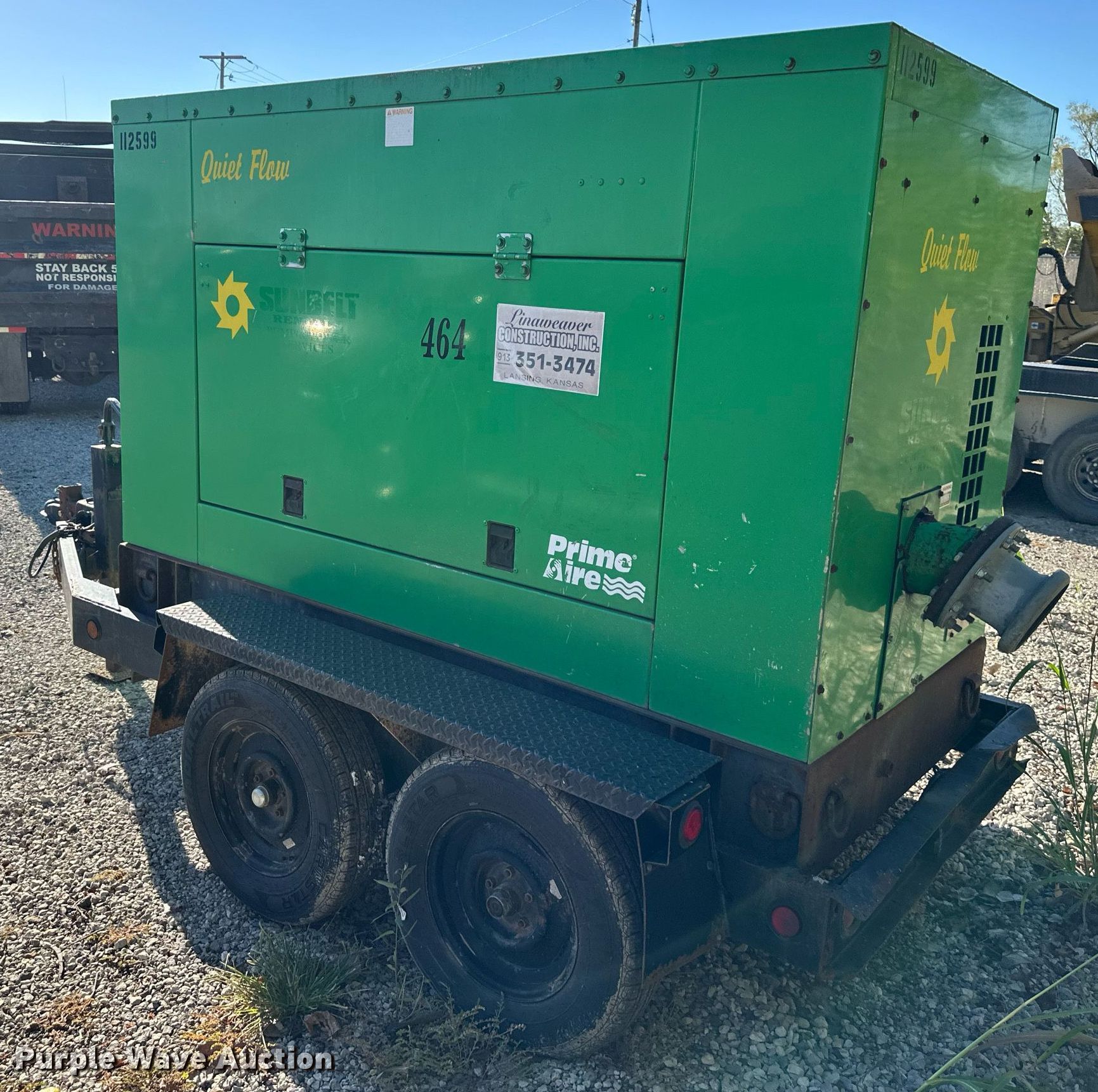 Gorman Rupp Prime Aire Quiet Flow irrigation pump. Hours: 13,496 on meter, VIN: 16MPF09276D047084. Engine John Deere, Displacement: 4.5L, Cylinders: 4, Fuel type: Diesel. Features 6" pump. Tires Front: 205/75R14. Linaweaver Construction, Inc.. Lansing, KS 66043