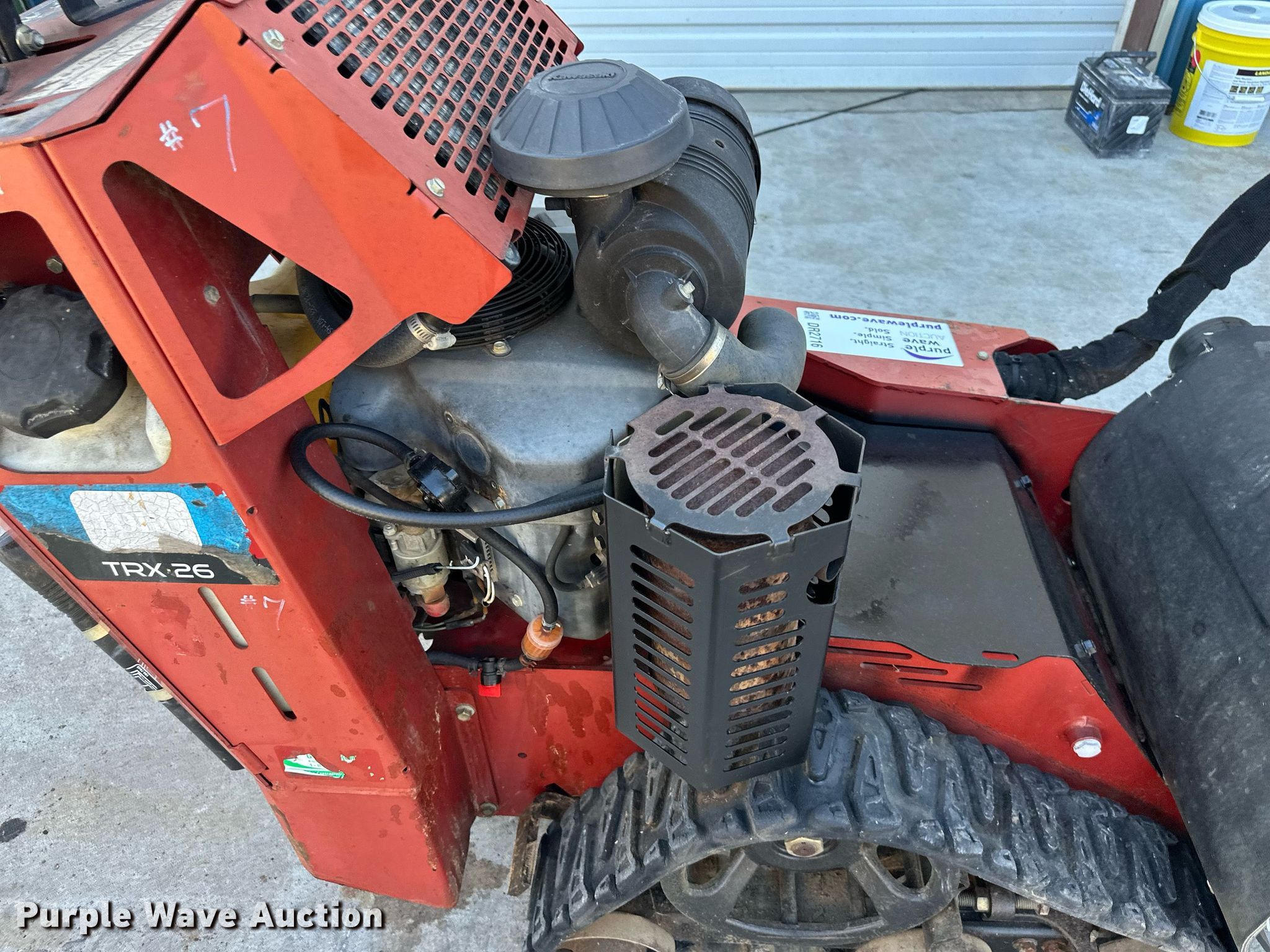 Toro TRX26 trencher. Hours: 369 on meter, Serial: 22974-314000187. Engine Kawasaki, Cylinders: 2, Fuel type: Gas. Transmission Hydrostatic:. Features Trencher Estimated dig depth: 48", Cutting width: 5", Teeth: Dirt, Manual crumber. Tracks Width: 6", Rubber. Tonganoxie, KS 66086