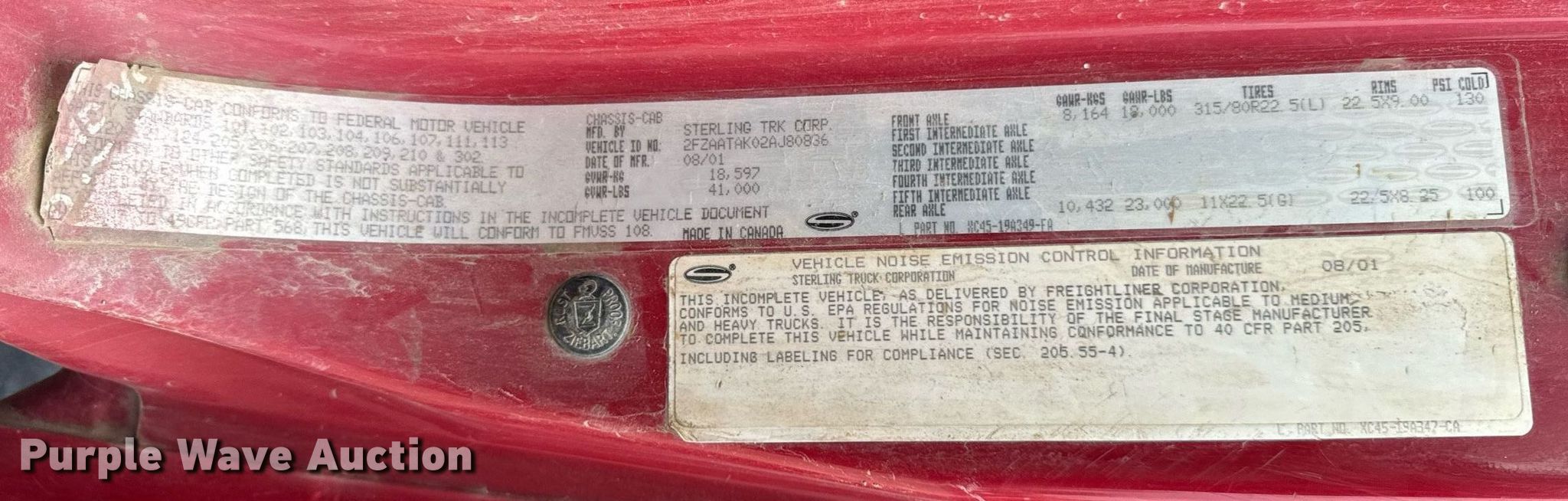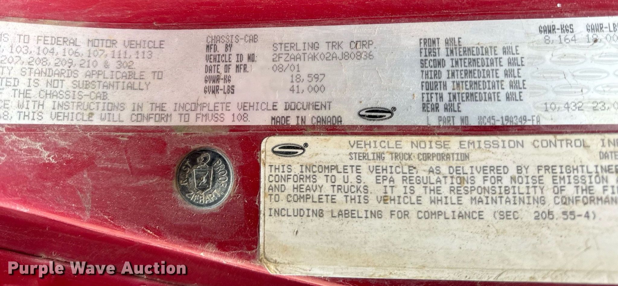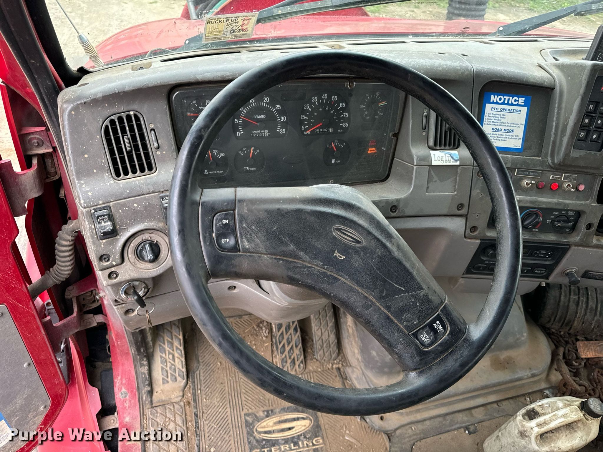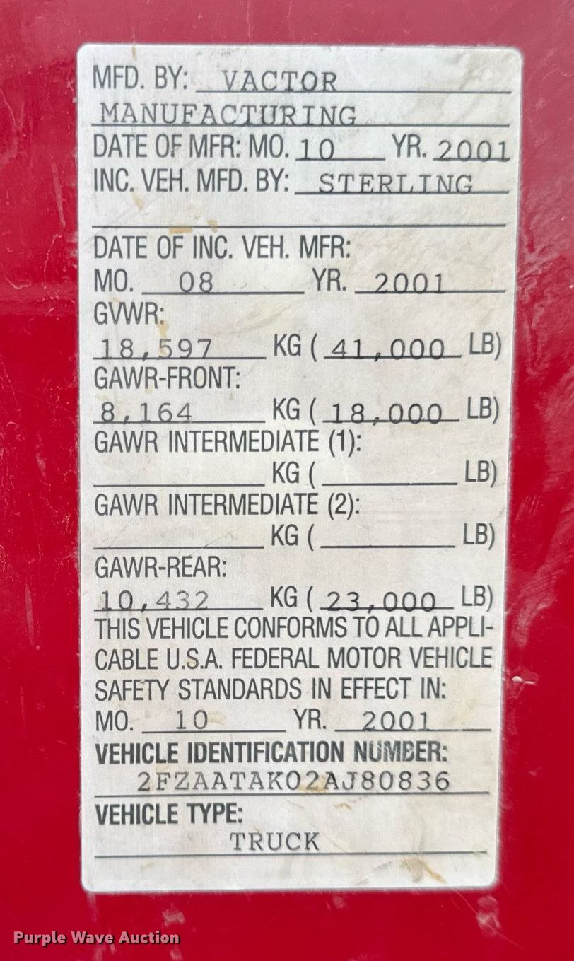 2002 Sterling L-Line hydrovac truck. Miles: 63,902 on odometer, Hours: 12,723 on meter, VIN: 2FZAATAK02AJ80836. Engine Caterpillar 3126, Displacement: 7.2L, Cylinders: 6, Fuel type: Diesel. Transmission Automatic. Chassis Axles: Single, Suspension: Spring, Brakes: Air, PTO, GVWR: 41,000 lbs. Interior AC, Heat, Cruise control. Features Tank bed Vactor 2110, Rear outlet: 6", Engine John Deere Powertech, Displacement: 4.5L, Cylinders: 4, Fuel type: Diesel, Hose reel Front, Diameter: 1", Length: 600', Telescopic boom Diameter: 8", Remote control. Tires Front: 315/80R22.5, Rear: 11R22.5. Notes Dash warning indicator: Engine warning stop engine, Unknown operating condition of hose reel, Non-operational water pump. Illinois title. Title distribution may be delayed up to 14 days from verification of funds. Len Cox & Sons Excavating. Romeoville, IL 60446
