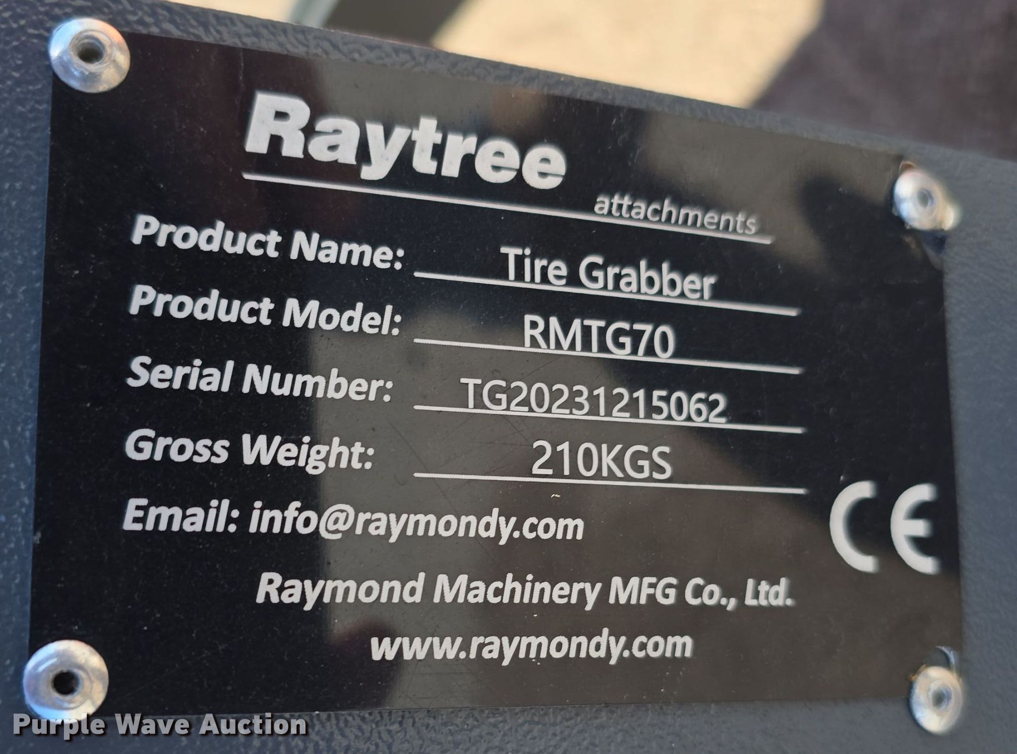 2023 RayTree Attachments RMTG70 skid steer tire grabber. Serial: TG20231215062, Tire diameter capacity: 50" to 70". Notes Unused. Jordan Machinery/ S & N Auto Sales. Waterloo, NE 68069