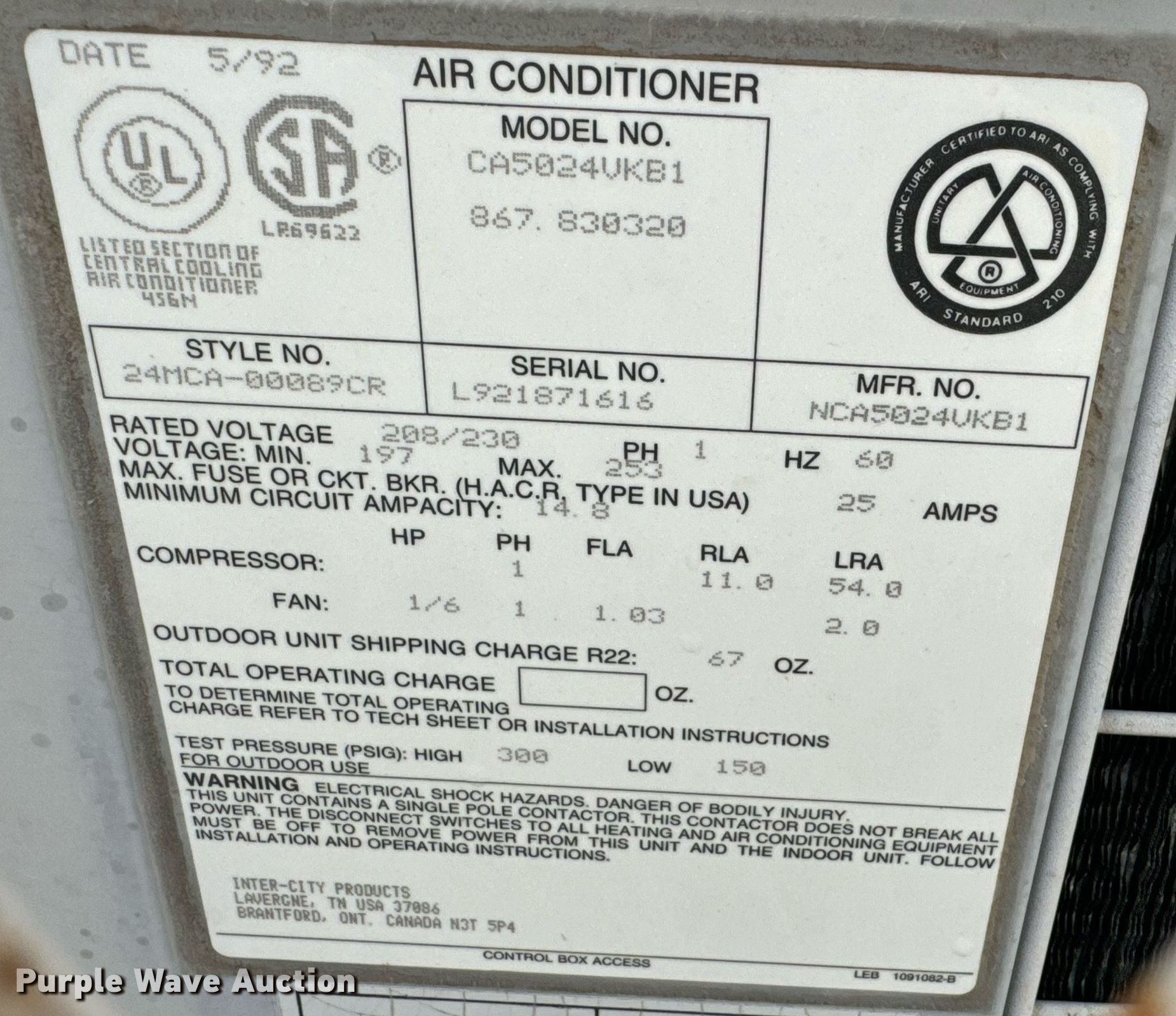 1993 Pelsue Metro XL A/C generator. Hours: 2,151 on meter, VIN: 1P9UM1018P1139007. Engine Kohler 10EC61, Serial: 294733, Cylinders: 3, Fuel type: LPG, kW: 1. Electric Motor Dayton, HP: 1.5, Volts: 115/230, Phase: Single. Features Generator Kohler 10, kVA: 1, kW: 10, Phase: Single, Electric start, Skid mounted, Air conditioner Ari Standard CA5024VKB1, Serial: L921871616, Volts: 208/230, Phase: Single. Trailer 1993 Pelsue, Suspension: Spring, Brakes: Electric, Axles: Single, Tire size: P235/75R15, GVWR: 4,200 lbs, GAWR: 4,000 lbs. Notes Unknown operating condition. This is worksite support equipment and will not come with a title. Transfer of ownership documentation will be a bill of sale. Nowata, OK 74048