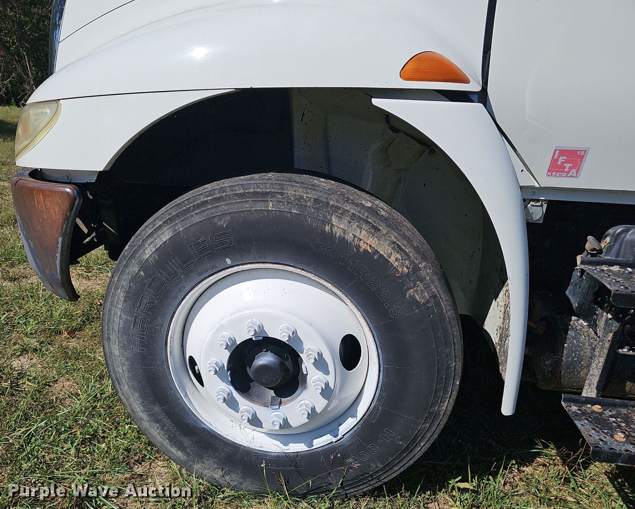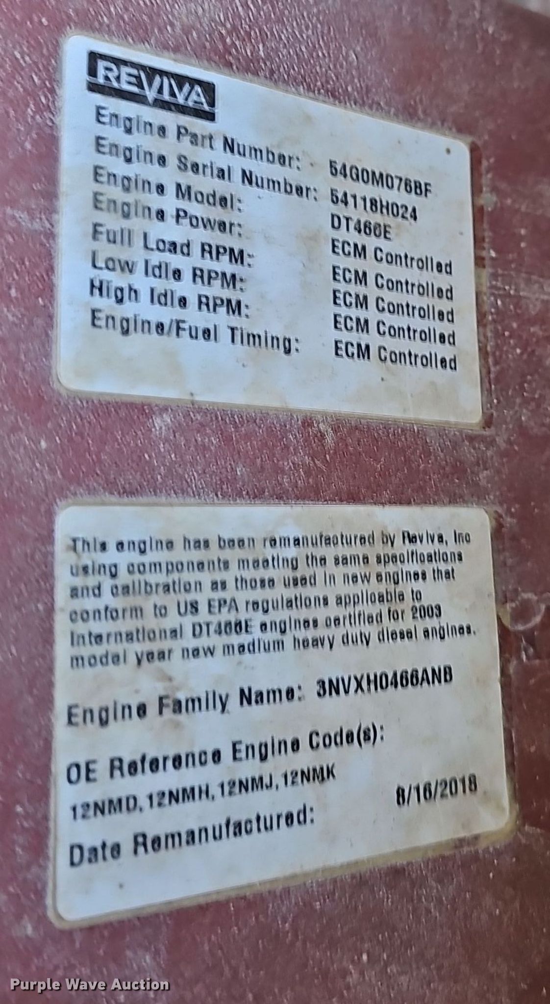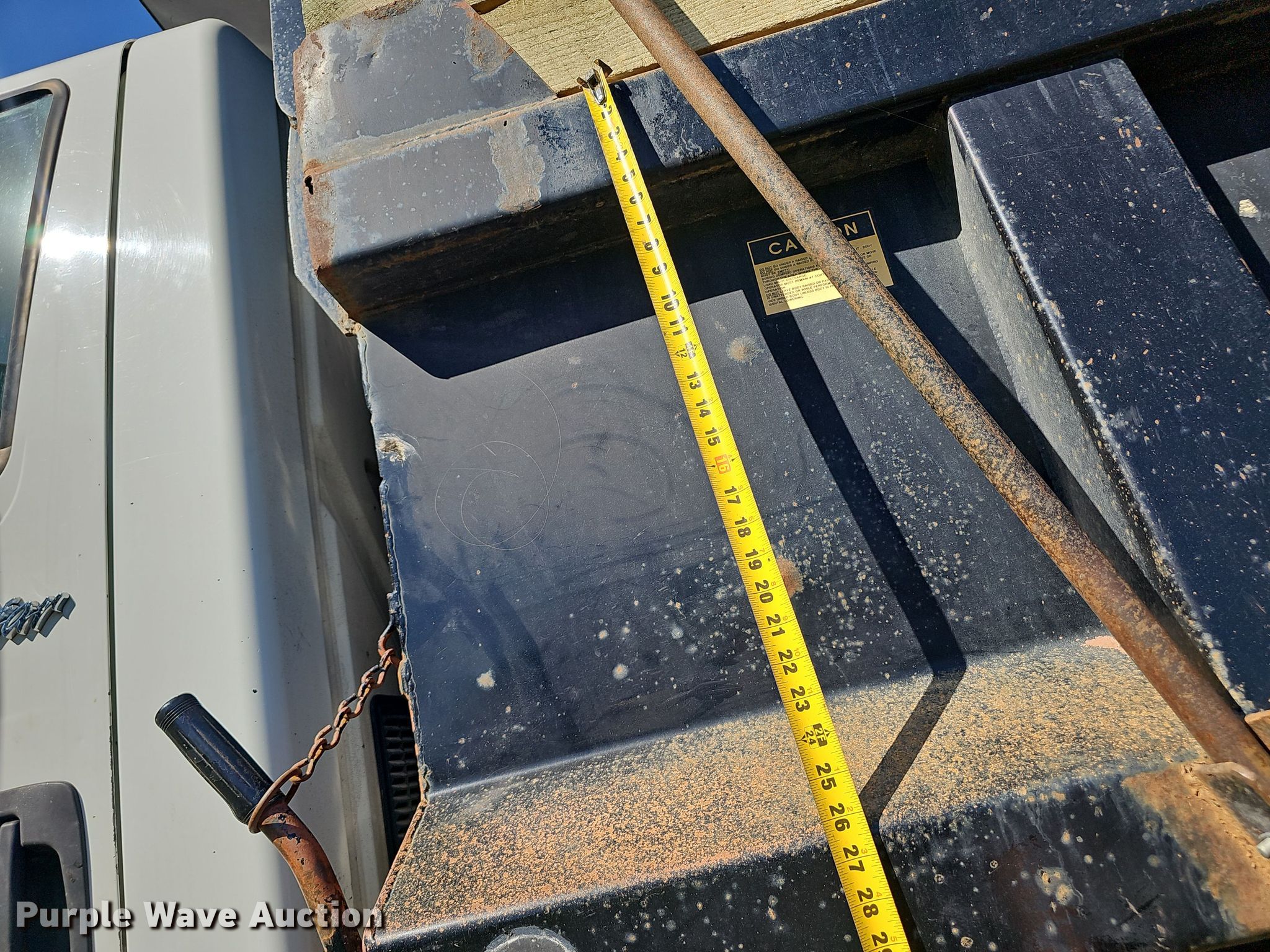 2003 International 4300 dump truck. Miles: 154,856 on odometer, VIN: 1HTMMAAN33H567463. Engine International DT466, Displacement: 7.6L, Cylinders: 6, Fuel type: Diesel. Transmission Eaton Fuller, Manual, Speed: 6. Chassis Axles: Single, Suspension: Spring, Brakes: Air, PTO. Interior AC, Heat, Cruise control. Features Dump bed McClaim 402U, Capacity: 6.9 cu.yd., 10' L x 96" W, Side height: 30", Side board height: 12", Bed type: Steel, Roll tarp Manual, Ram: Single, End gate: Manual. Tires Front: 11R22.5, Rear: 295/75R22.5, 11R22.5. Notes Dash warning indicator: Check engine, ABS, Check AC. Missouri title. Ozark, MO 65721