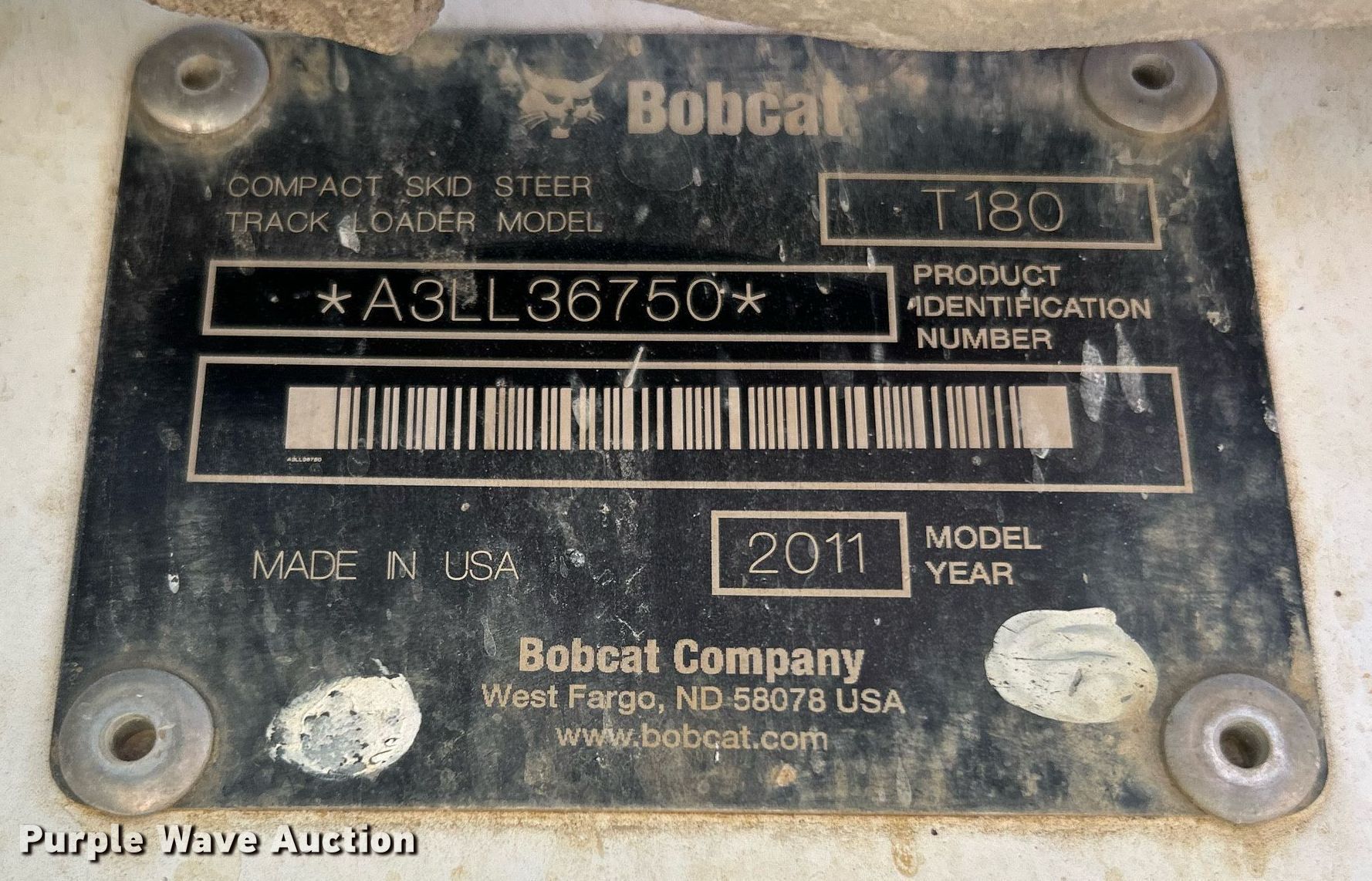 2011 Bobcat T180 tracked skid steer loader. Hours: 3,918 on meter, Serial: A3LL36750. Engine Kubota V2607-T, Cylinders: 4, Fuel type: Diesel, HP: 66. Transmission Hydrostatic. Operators station Bucket control: Hand, Electronic Monitoring System panel. Features Auxiliary hydraulics, Quick coupler: Manual, Bucket Width: 67", Teeth: Bolt-on. Tracks Width: 12". Buchheit Concrete. Weldon Spring, MO 63304