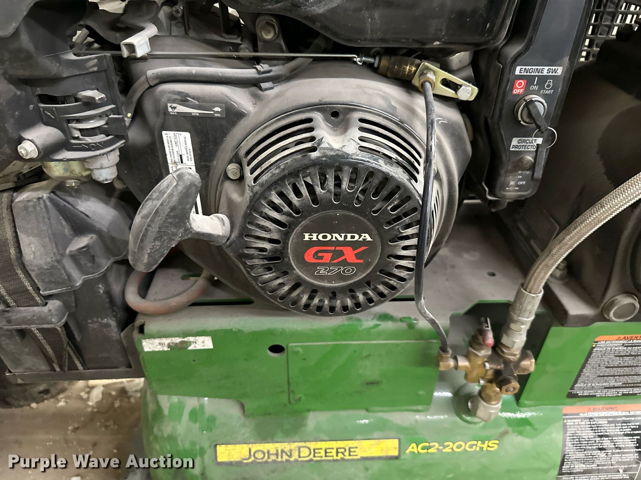 Purple Wave is selling a used Air Compressor in Missouri. This item is a John Deere AC2-20GHS air compressor with the following: Honda GX270, Displacement: 270 C.I.D., Cylinders: 1, Fuel type: Gas