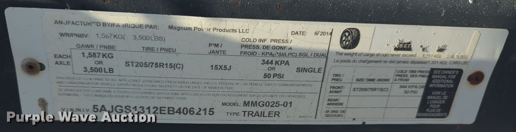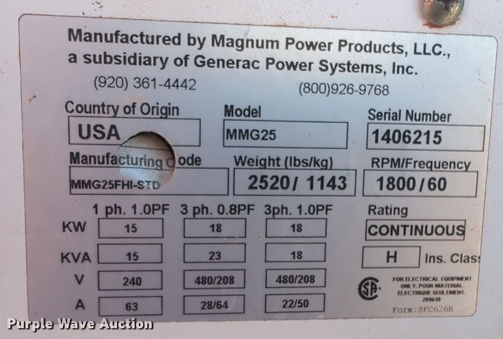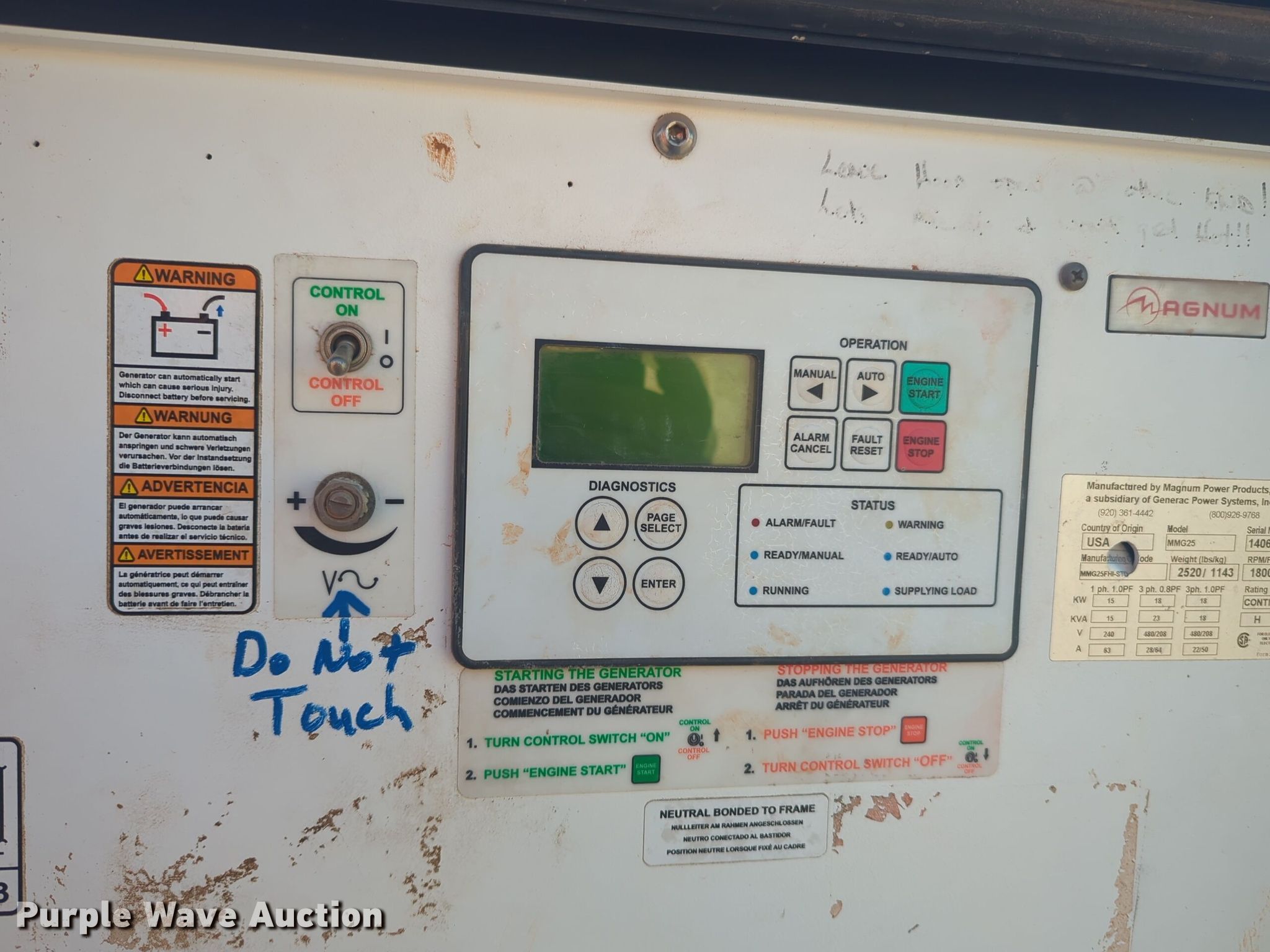Purple Wave is selling a used Generator Set in Oklahoma. This item is a 2014 Magnum MMG25 generator with the following: Hours: 14,923 on meter, VIN: 5AJGS1312EB406215, Serial: 1406215