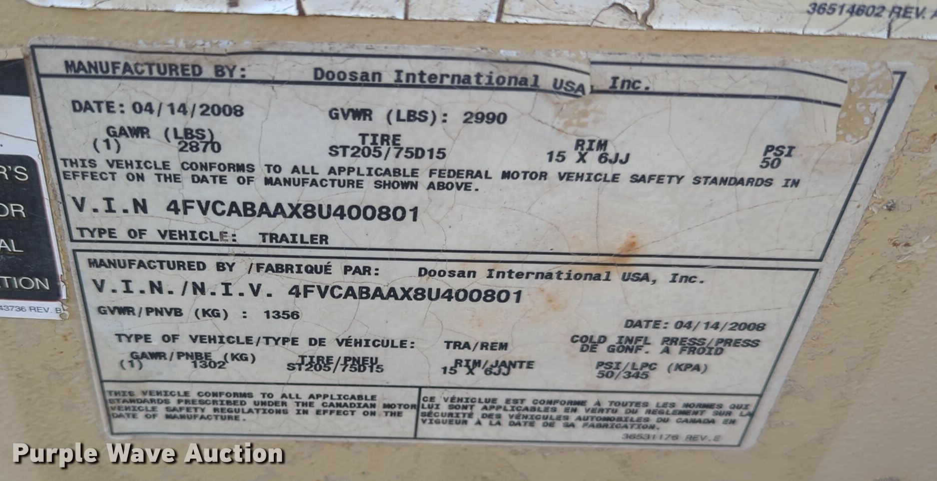 Purple Wave is selling a used Air Compressor in Oklahoma. This item is a 2008 Doosan P185WJD air compressor with the following: Hours: 1,737 on meter, VIN: 4FVCABAAX8U400801, Serial: 4008011UDSD08