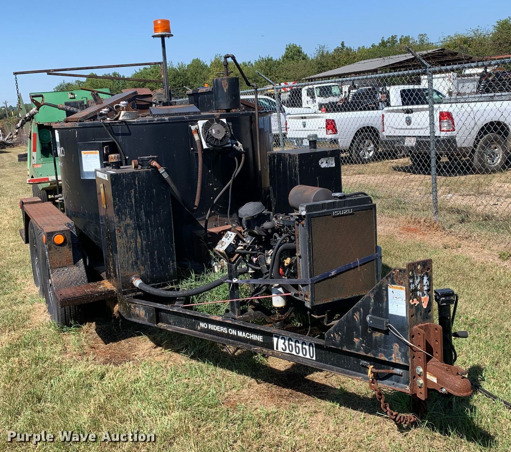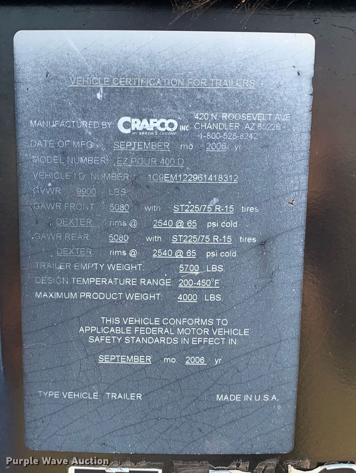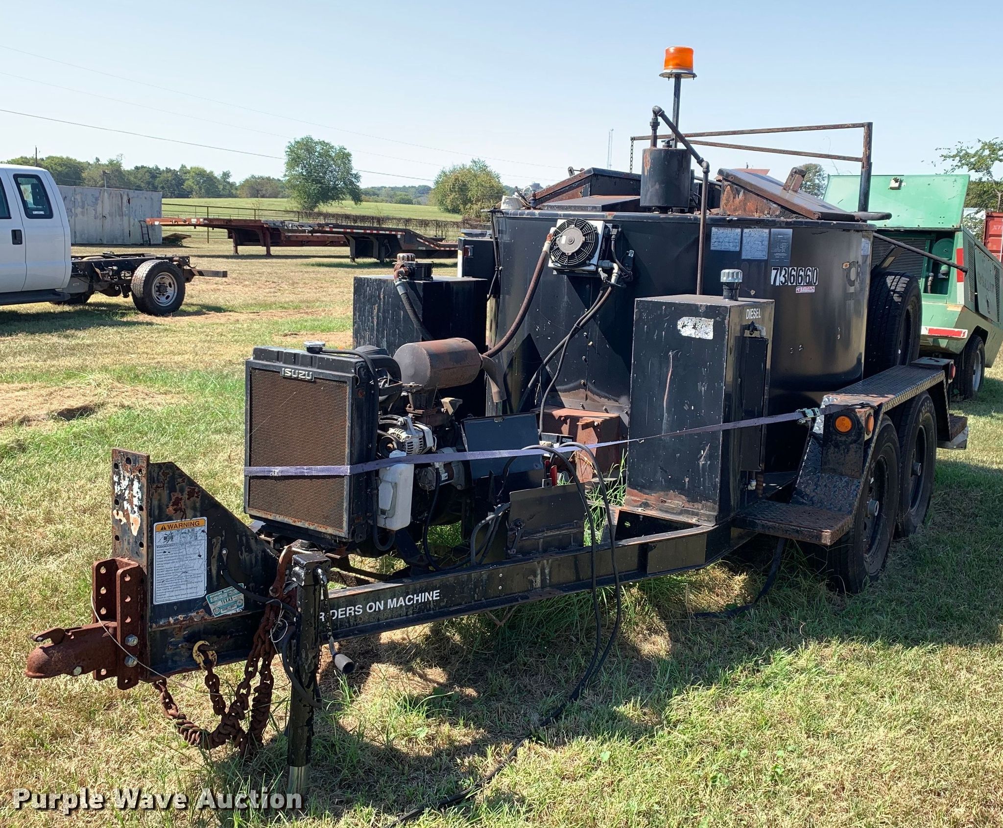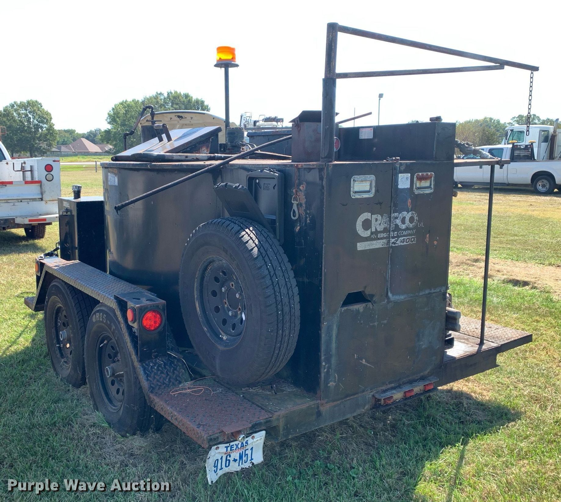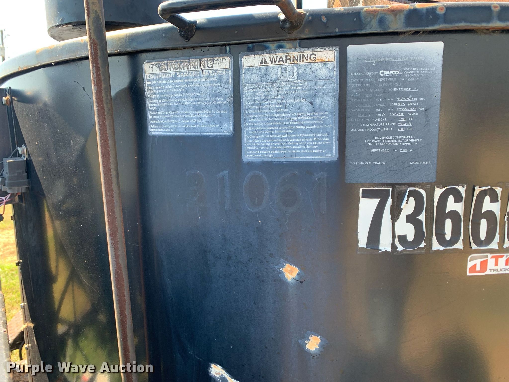 2006 Crafco EZ 400 D melter applicator. Hours: 1,299 on meter, VIN: 1C9EM122961418322, Unit #: 736660. Engine Isuzu 3CB1-CZP01, Serial: 001883, Displacement: 1.116L, Cylinders: 3, Fuel type: Diesel. Trailer Ball hitch: 2 5/16", Landing gear: Single, Axles: Tandem, GVWR: 9,000 lbs. Tires Size: ST235/85R16. This is worksite support equipment and will not come with a title. Transfer of ownership documentation will be a bill of sale. Titan Truck & Equipment Co. LLC. Bullard, TX 75757