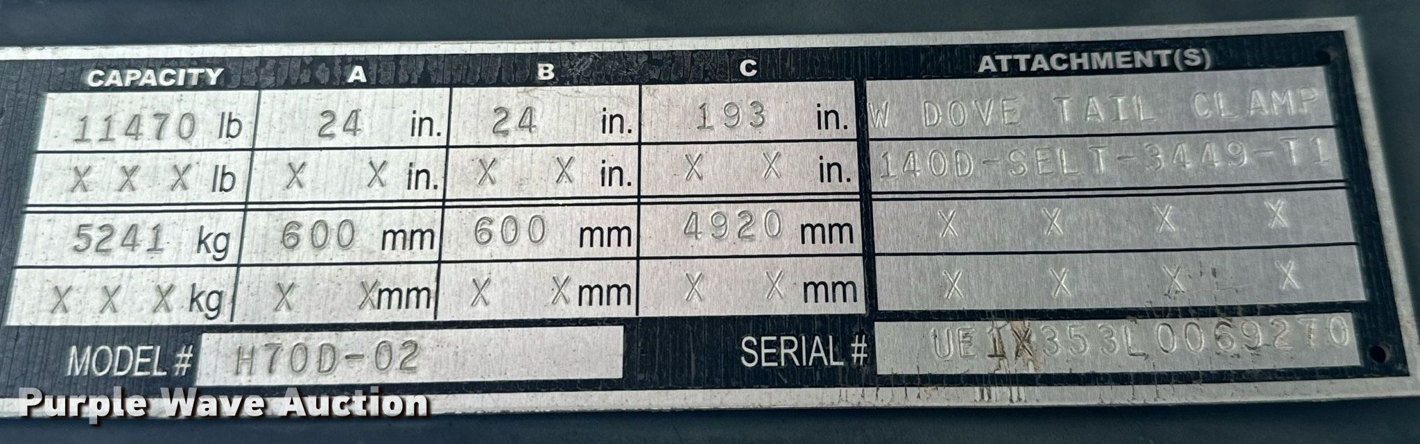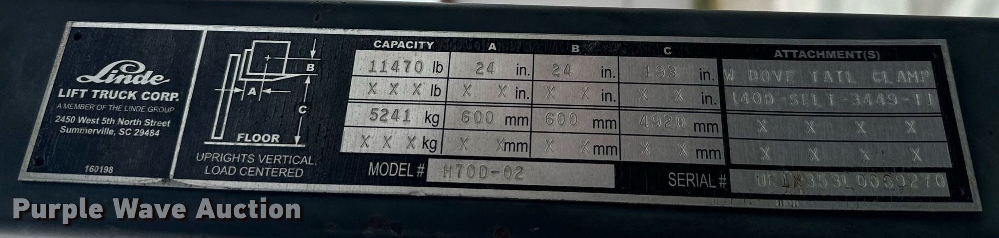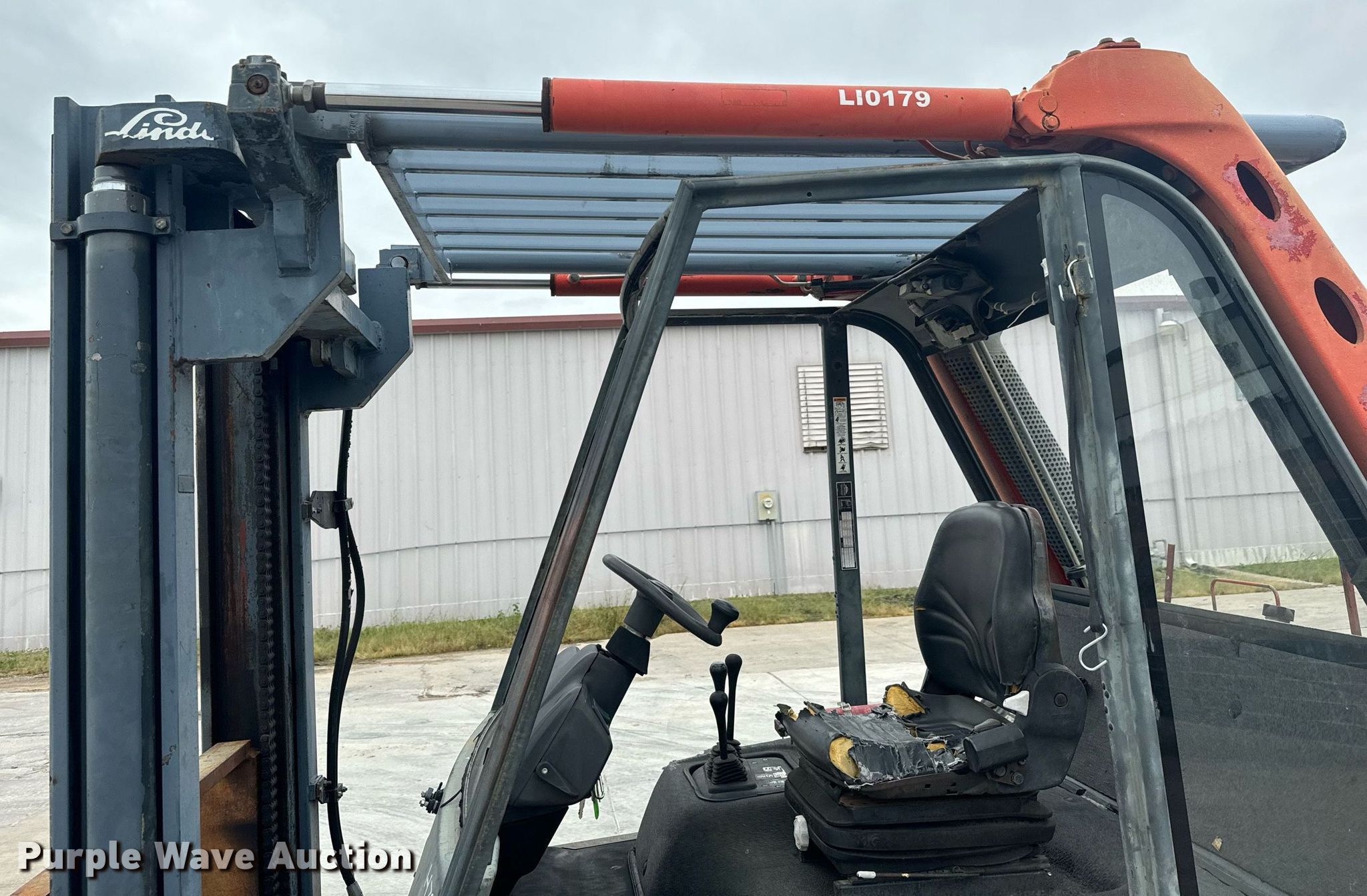 2000 Linde H70D forklift. Hours: 8,398 on meter, Serial: UE1X353L0069270, Unit #: LI0179. Engine Deutz, Cylinders: 6, Fuel type: Diesel. Transmission Hydrostatic. Operators station Canopy. Features Maximum lift capacity: 13,225 lbs, Maximum lift height: 193", Mast stages: 2, Mast tilt, Fork length: 96", Fork positioner. Tires Front: 355/65-15, Rear: 8.25-15, Solid. Lift Parts Service LLC. Wichita, KS 67215