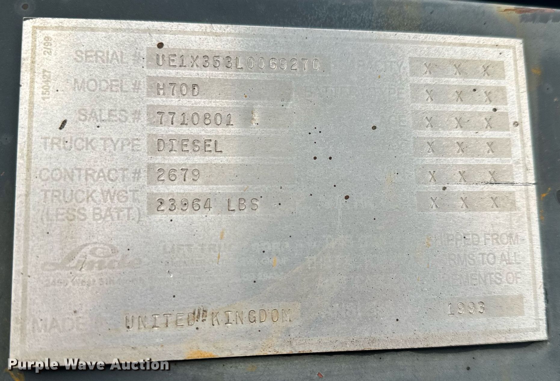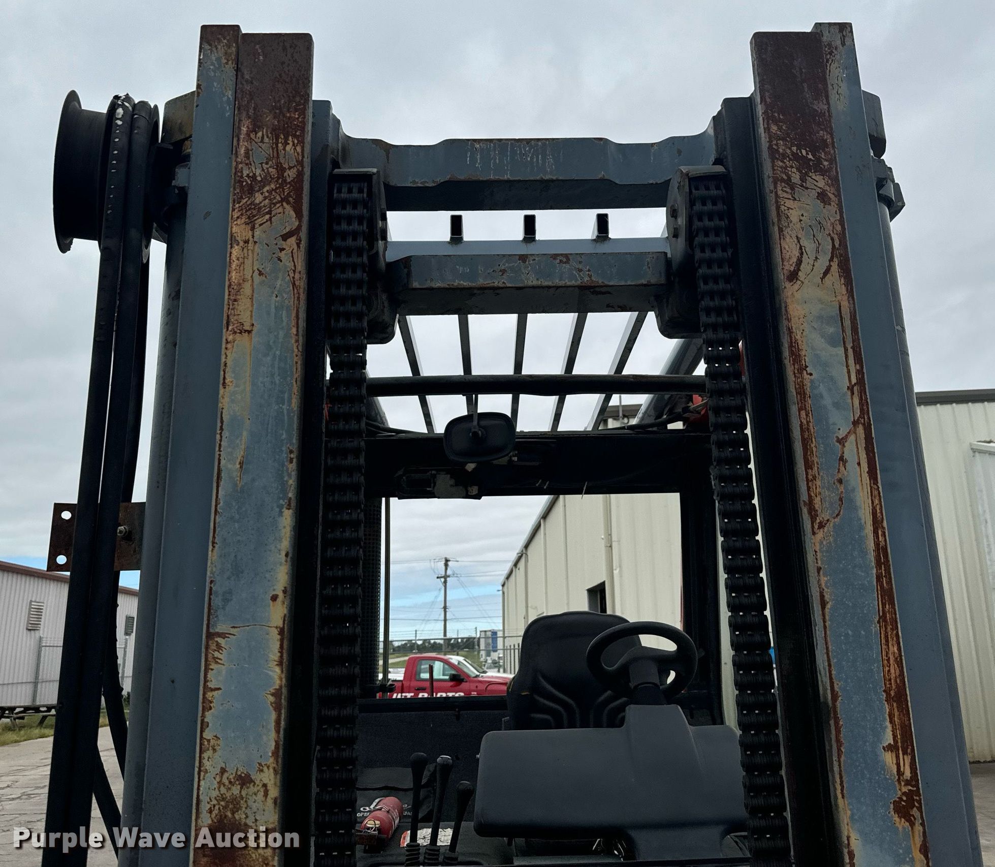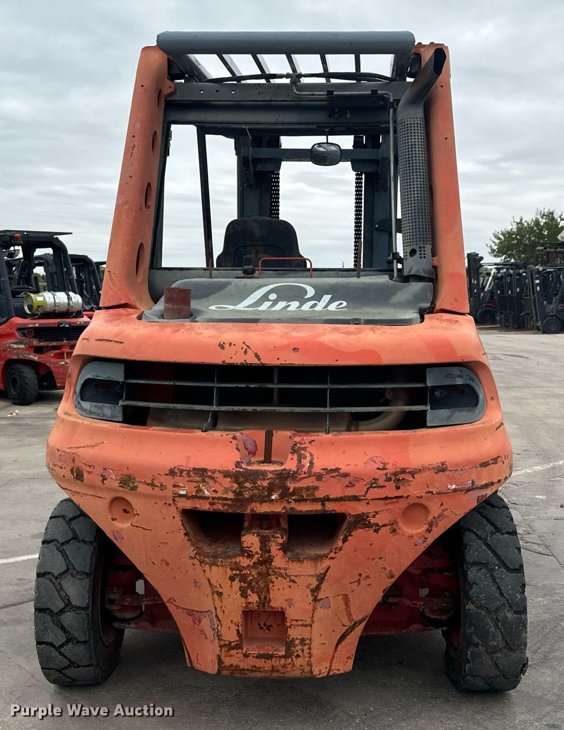 2000 Linde H70D forklift. Hours: 8,398 on meter, Serial: UE1X353L0069270, Unit #: LI0179. Engine Deutz, Cylinders: 6, Fuel type: Diesel. Transmission Hydrostatic. Operators station Canopy. Features Maximum lift capacity: 13,225 lbs, Maximum lift height: 193", Mast stages: 2, Mast tilt, Fork length: 96", Fork positioner. Tires Front: 355/65-15, Rear: 8.25-15, Solid. Lift Parts Service LLC. Wichita, KS 67215