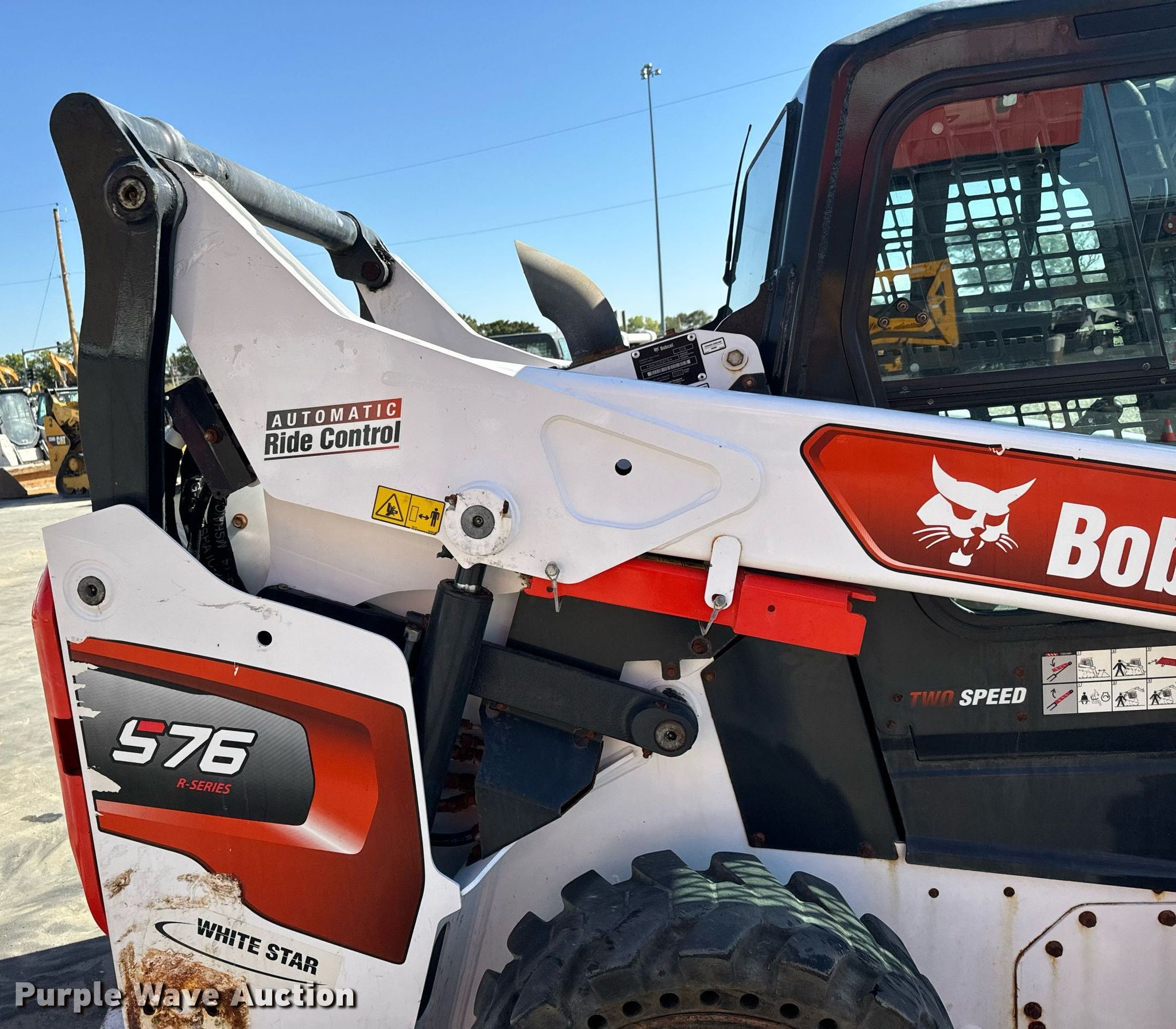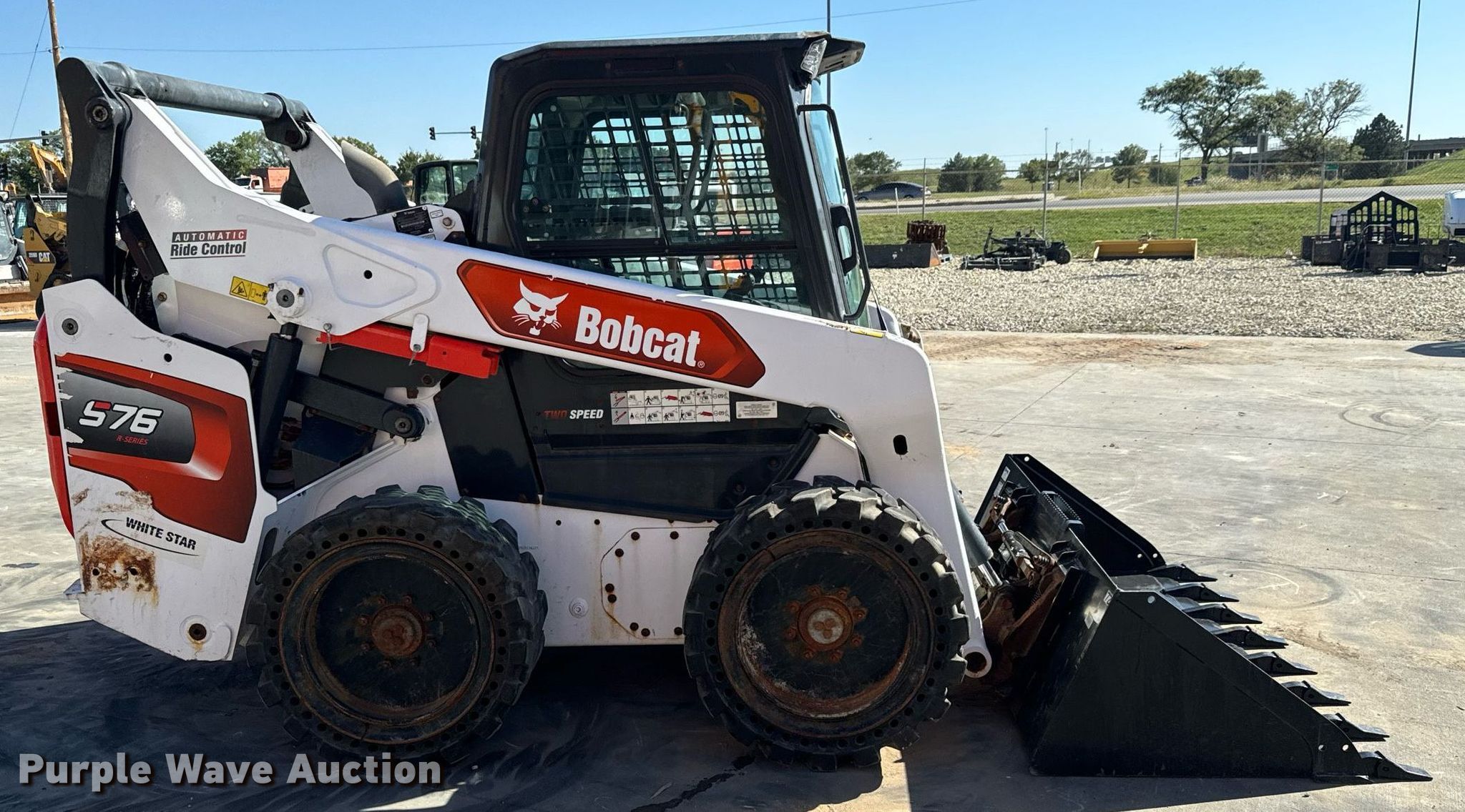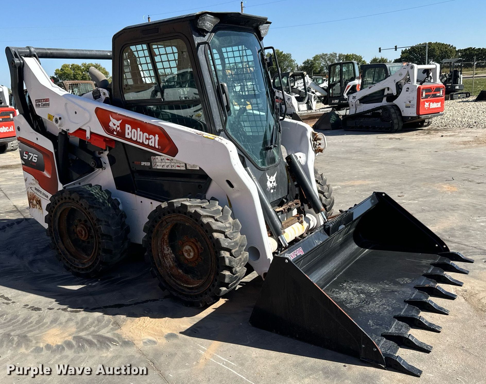 2022 Bobcat S76 skid steer loader. Hours: 969 on meter, Serial: B4CD15676. Engine Bobcat, Cylinders: 4, Fuel type: Diesel. Transmission Hydrostatic, Two speed travel. Operators station Enclosed cab, AC, Heat, Bucket control: Hand, Pattern changer, Electronic Monitoring System panel. Features Auxiliary hydraulics, Auxiliary electrical outlet, Quick coupler: Hydraulic, Bucket Virnig, Width: 72", Teeth: 8. Tires Size: 33x12-20, Solid. White Star Machinery. Wichita, KS 67219