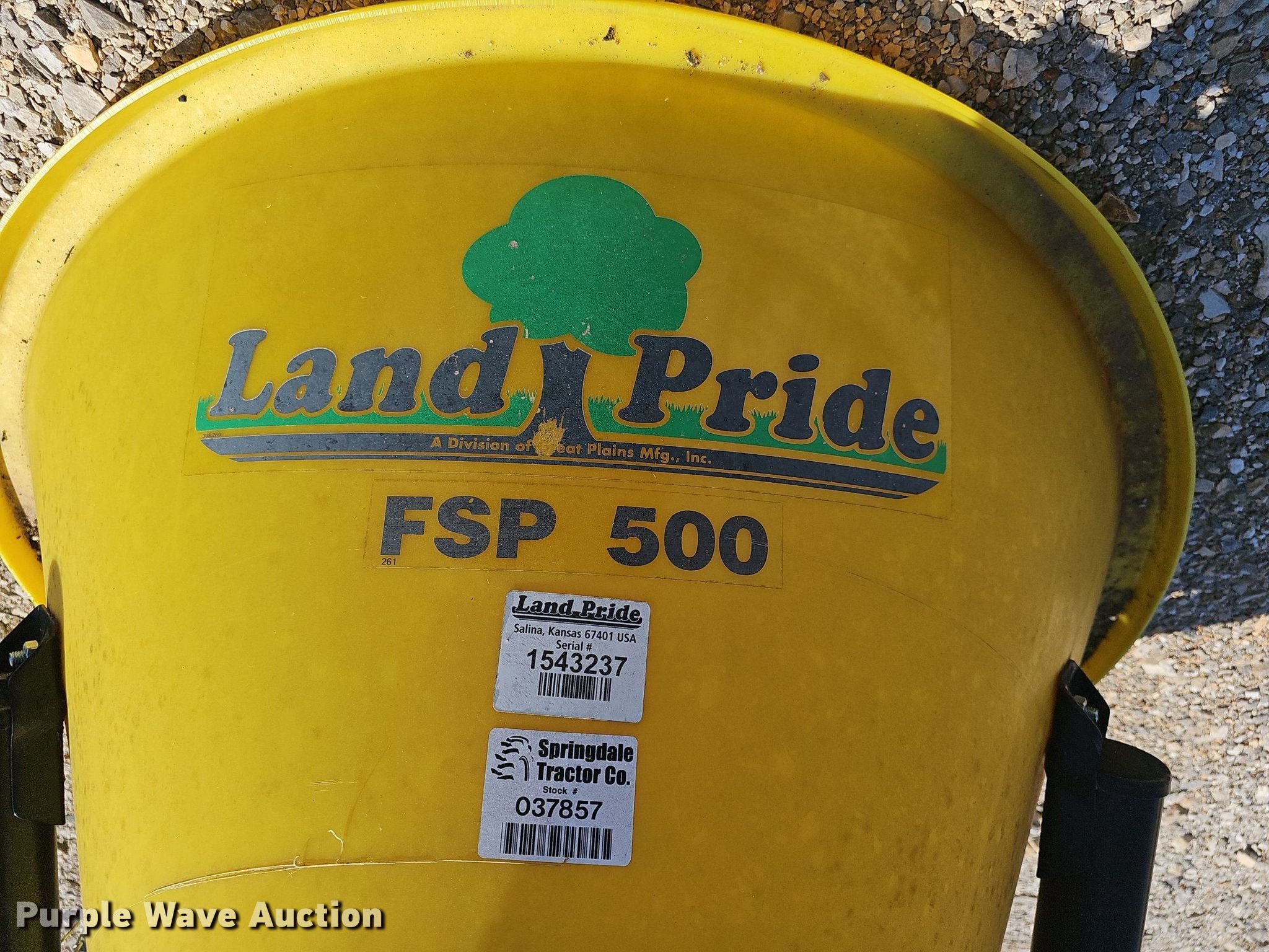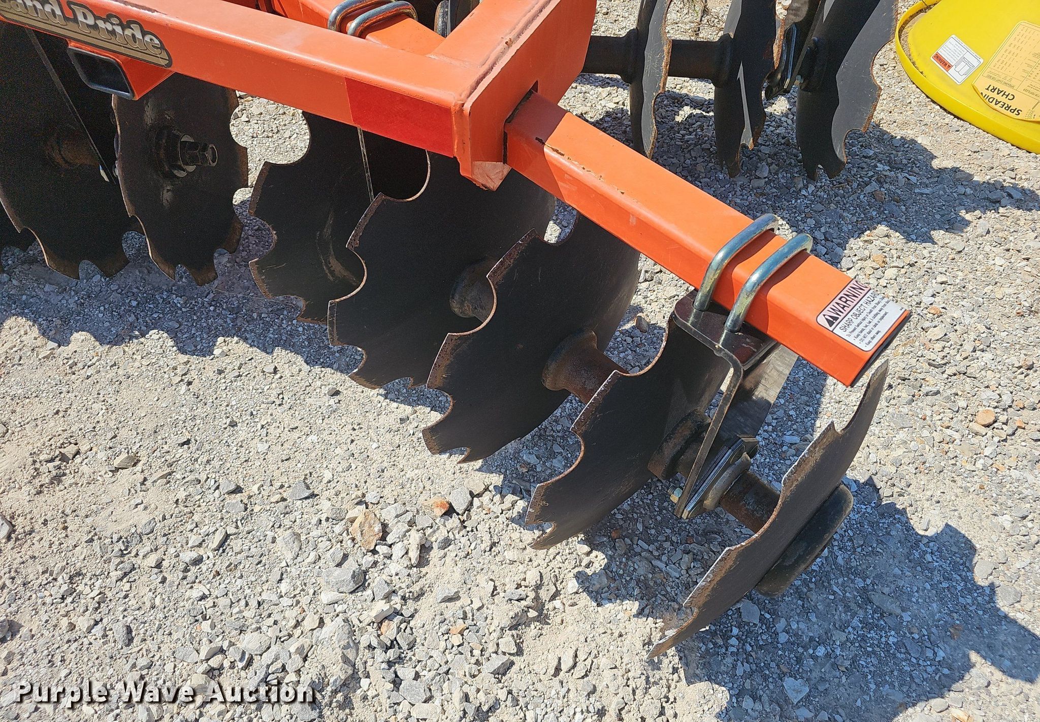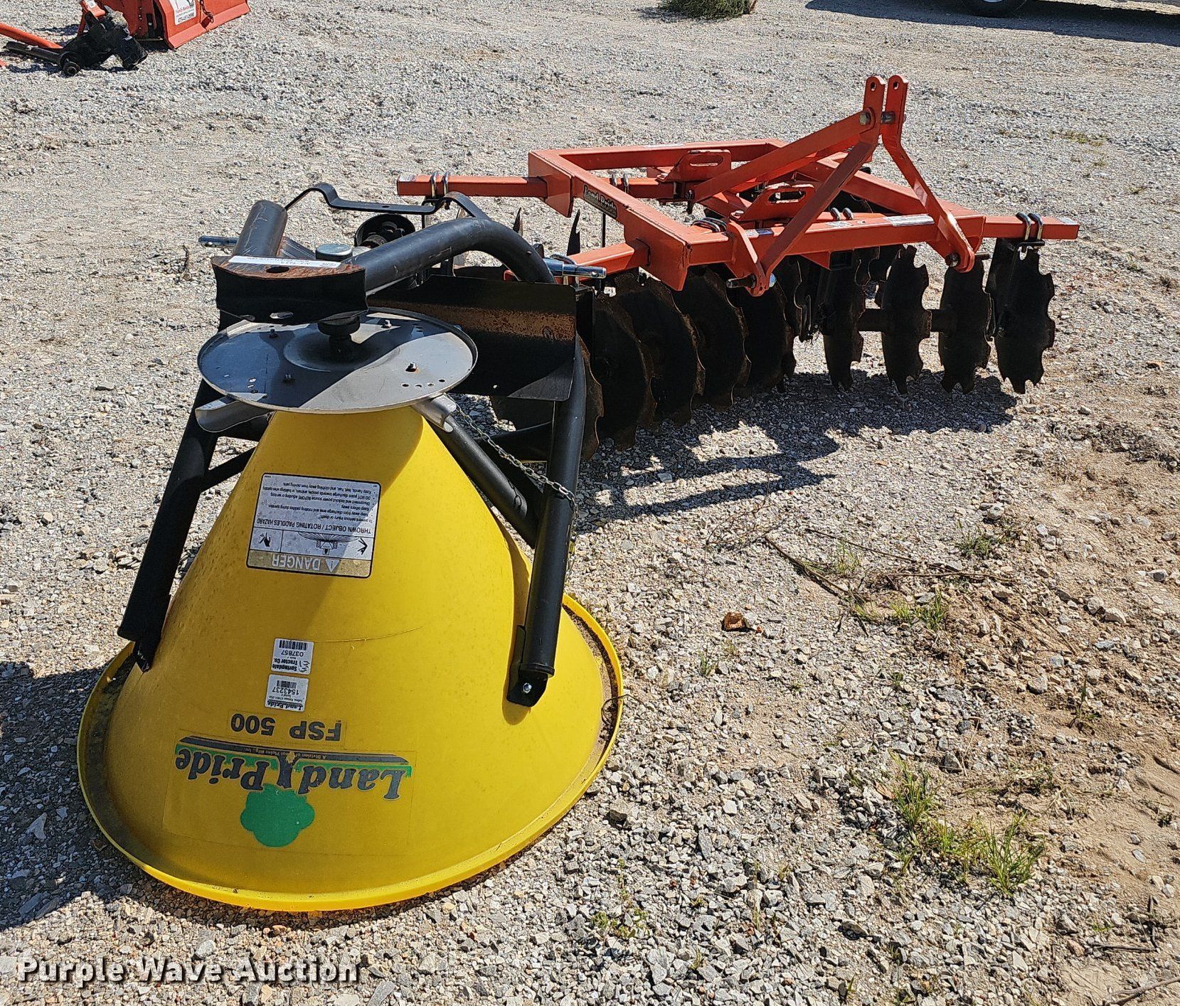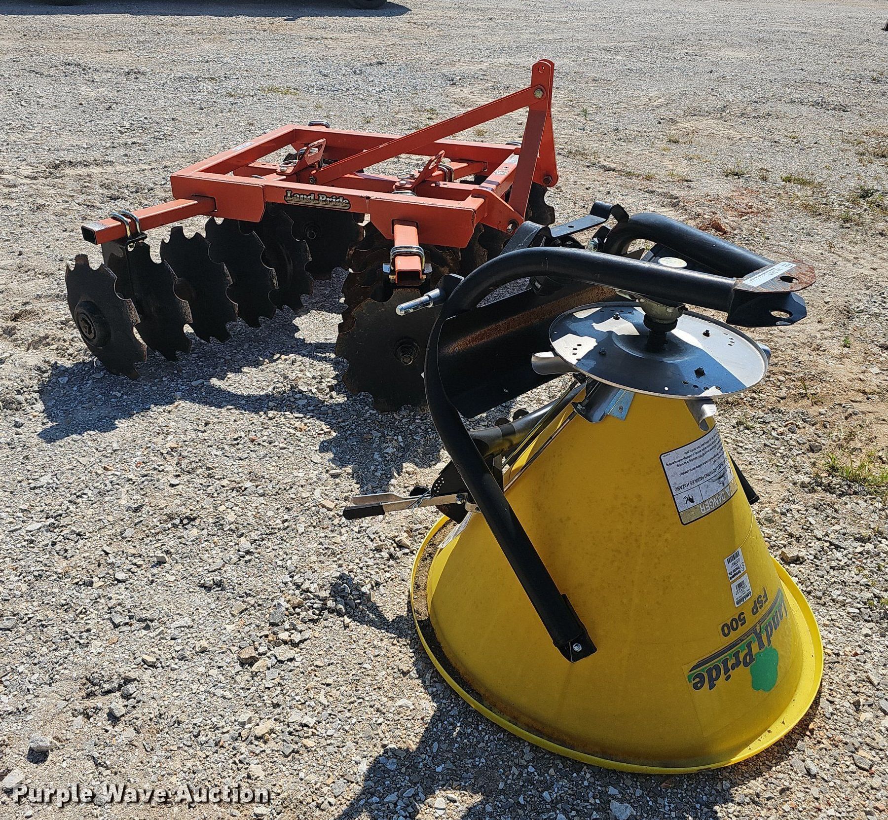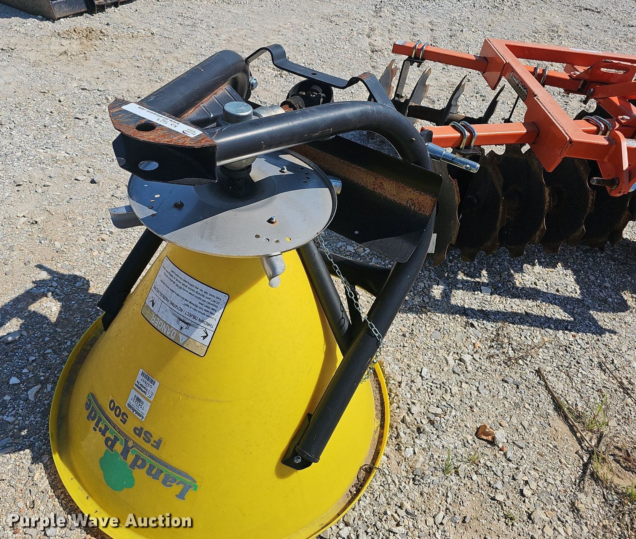 2019 Land Pride DH1572 off-set disk. Overall width: 72", Serial: 1447852. Features Front blades Diameter: 18", Spacing: 7", Rear blades Diameter: 18", Spacing: 7", Attachments Hitch: Three point. Land Pride Spreader Model: FSP500, Serial: 1543237, Hitch: 3 point, PTO. Notes PTO shaft part missing. Family Rentals. Pea Ridge, AR 72751