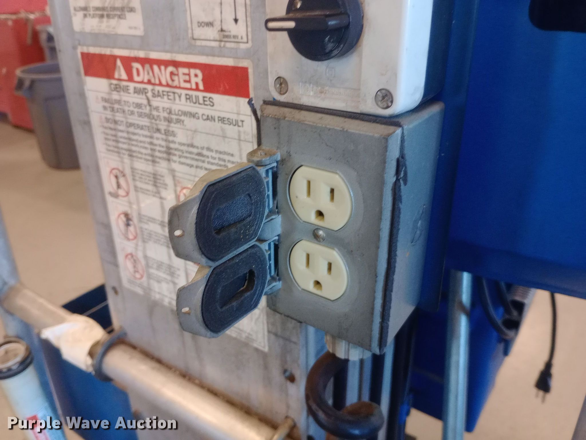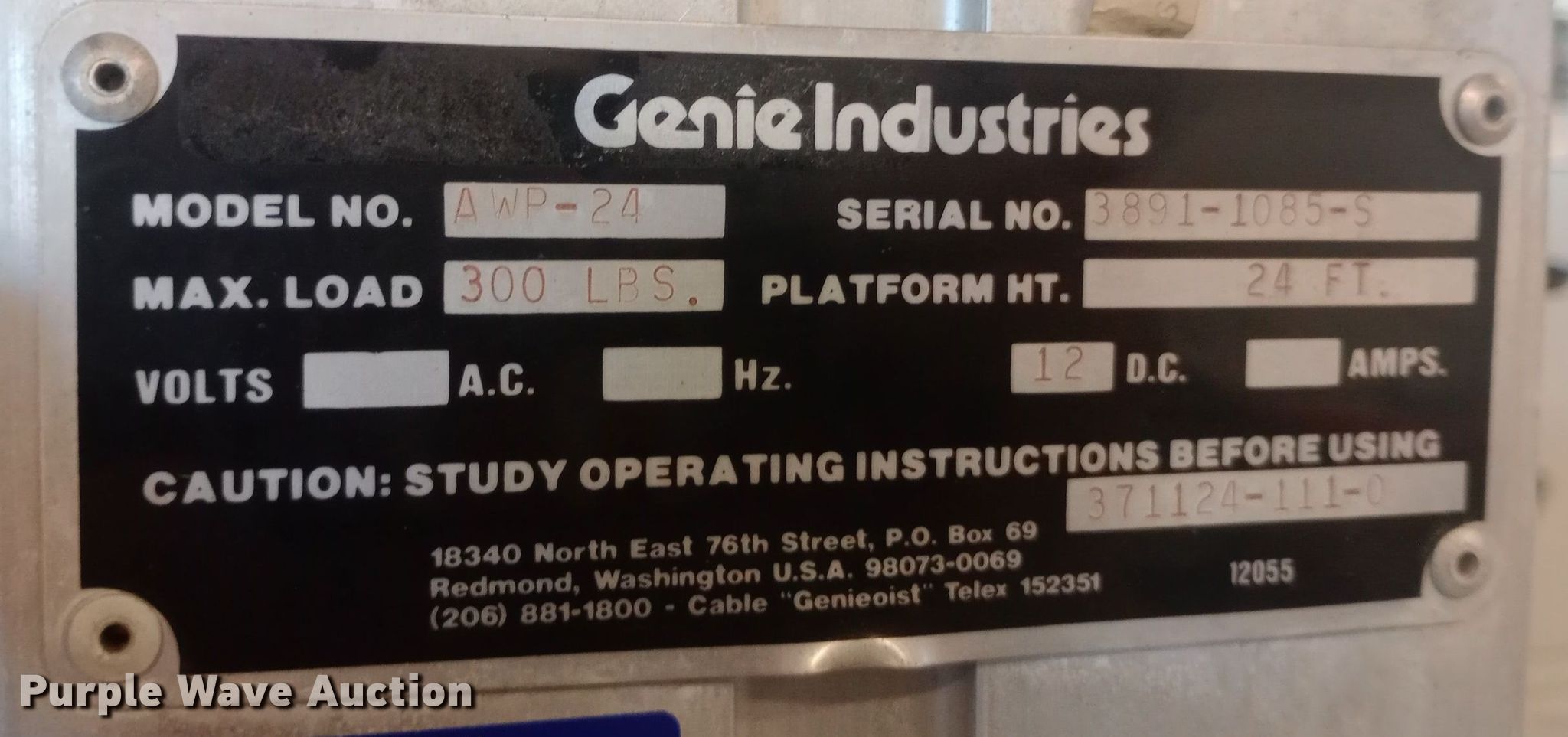Purple Wave is selling a used Scissor or Vertical Lift in Kansas. This item is a Genie AWP-24 vertical lift with the following: Serial: 3891-1085-S