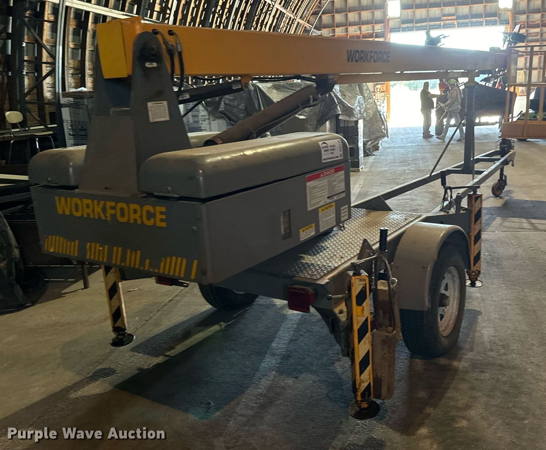 1997 Workforce XLB-4232 boom lift. Hours: 66 on meter, Serial: 41-0775. Electric Motor Volts: 24. Features Tow behind, Boom type: Telescopic, Maximum lift capacity: 300 lbs, Maximum reach length: 32', Maximum lift height: 35' 5", Hydraulic outriggers, Platform: 34" L x 22" W, AC power outlet, Controls: Platform, Ground. Tires Tire size: 225/75D15. Notes Dead battery, Unknown operating condition. This is worksite support equipment and will not come with a title. Transfer of ownership documentation will be a bill of sale. Larned State Hospital. Larned, KS 67550