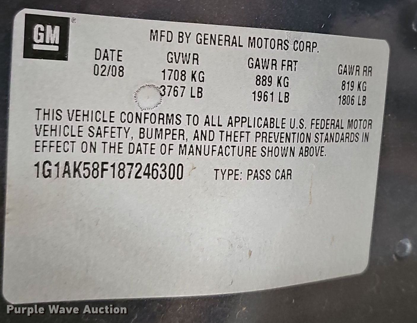 2008 Chevrolet Cobalt LT. Miles: 147,409 on odometer, VIN: 1G1AK58F187246300, Unit #: 22. Engine Displacement: 2.2 L4 DOHC, Cylinders: 4, Fuel type: Gas. Transmission Automatic. Interior AC, Heat. Tires Size: 195/60R15. Notes Dash warning indicator: TPMS, Dead battery. Title history is unknown. Seized vehicle. Condition and history are unknown. No additional information is available. Kansas title. Seller is a government entity who will be assigning and distributing the title. Please contact the seller for distribution questions. Kansas Highway Patrol. Topeka, KS 66618