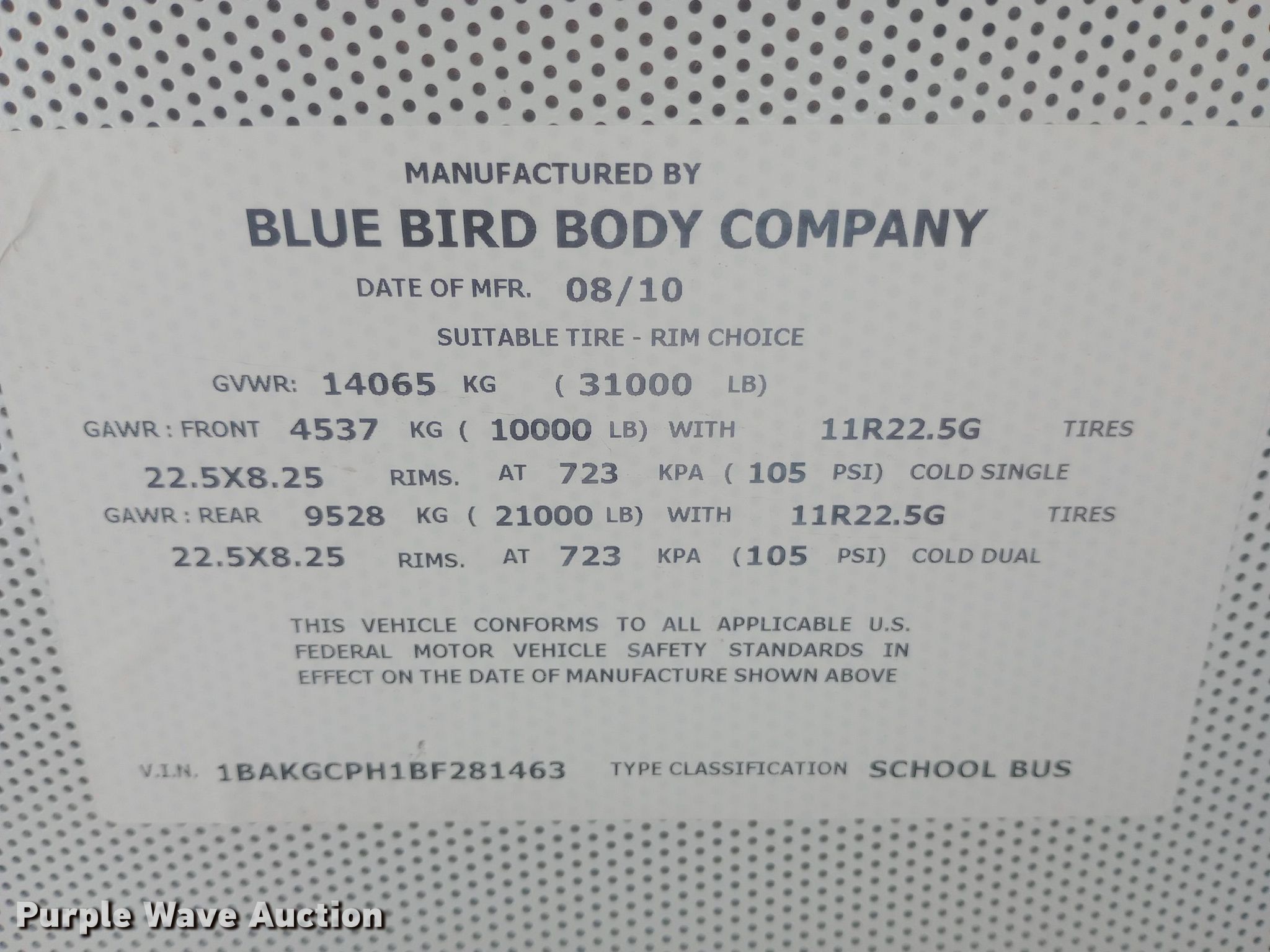 2011 Bluebird Vision school bus. Miles: 112,541 on odometer, Hours: 4,239 on meter, VIN: 1BAKGCPH1BF281463. Engine Cummins, Displacement: 6.7L, Cylinders: 6, Fuel type: Diesel. Transmission Automatic. Chassis Axles: Single, Suspension: Spring, Brakes: Hydraulic, GVWR: 31,000 lbs. Interior Heat, Heated mirrors, Cruise control, Passengers: 72. Tires Size: 11R22.5. Notes Turbo replaced August 2022. View repairs. Oklahoma title. Title distribution may be delayed up to 14 days from verification of funds. Newkirk Public Schools. Newkirk, OK 74647