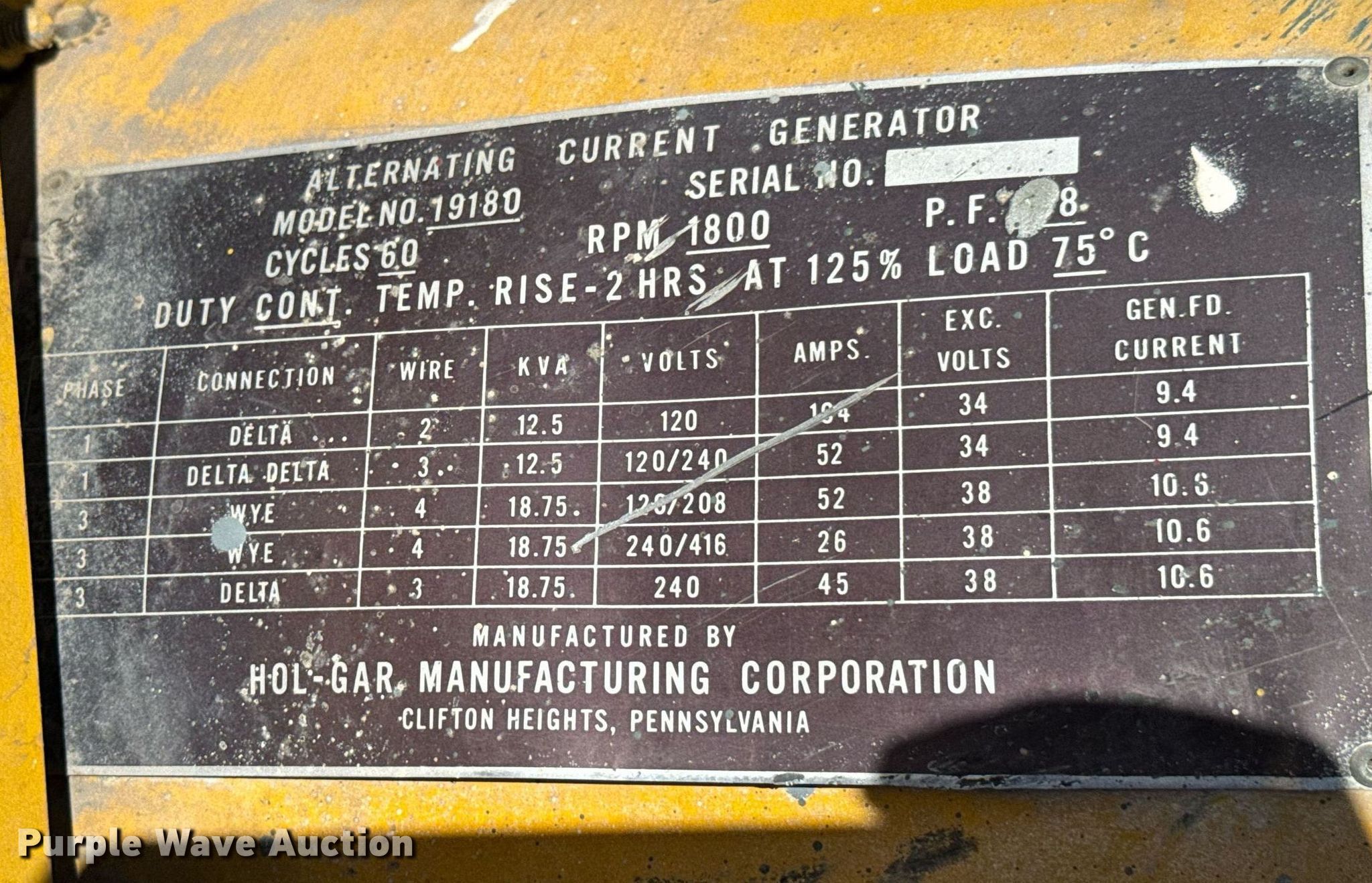 2003 Onan J120-S generator. Serial: 103C742322. Engine Cylinders: 4, Fuel type: Gas. Features Generator Hol-Gar 19180, kVA: 18.75, Phase: Single, Three. City of Chanute, KS. Chanute, KS 66720