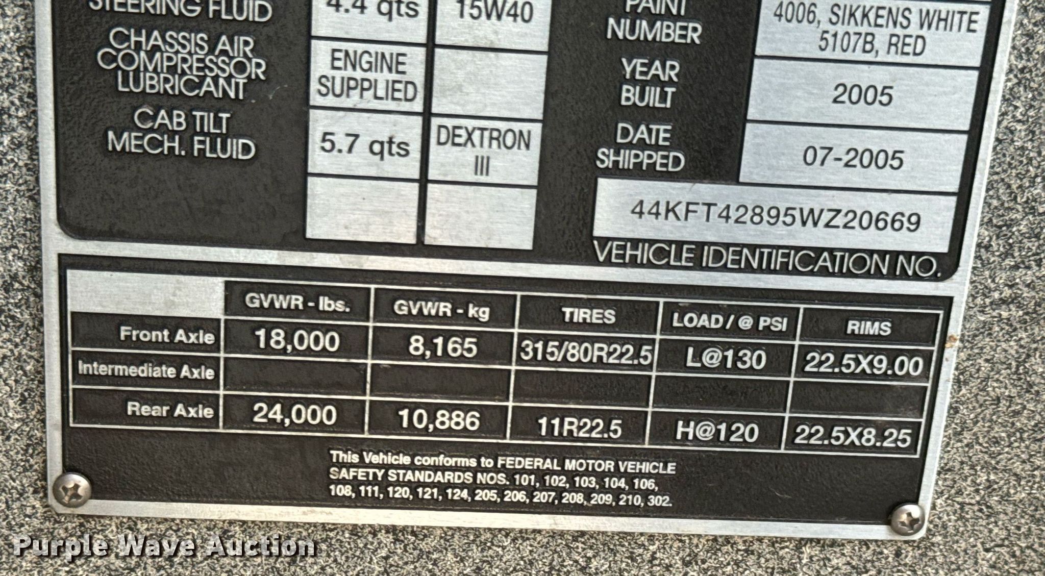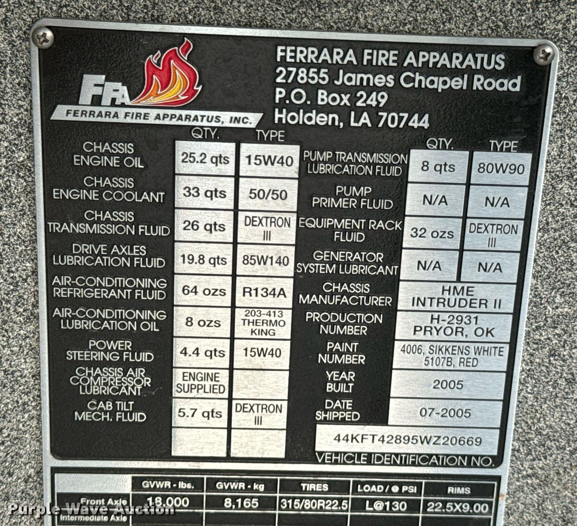 2005 HME 1872 pumper fire truck. Miles: 81,977 on odometer, Hours: 8,928 on meter, VIN: 44KFT42895WZ20669. Engine Cummins, Displacement: 8.3L, Cylinders: 6, Fuel type: Diesel, Engine brake. Transmission Allison, Automatic. Chassis Axles: Single, Suspension: Spring, Brakes: Air, GVWR: 42,000 lbs. Interior AC, Heat, Heated mirrors, Auxiliary controls. Features Fire truck body Tank Capacity: 500 gallons, Pump 1,500 gpm, Generator Premier Pow'R Gard 6000, Hours: 41 on meter, Fuel type: Gas, kW: 6, PA/ siren controls. Tires Front: 315/80R22.5, Rear: 11R22.5. Notes Tools will be removed prior to auction, Honda engine, ladders and pipe poles will be removed prior to auction. Oklahoma title. Title distribution may be delayed up to 14 days from verification of funds. Pryor Fire Department. Pryor, OK 74361