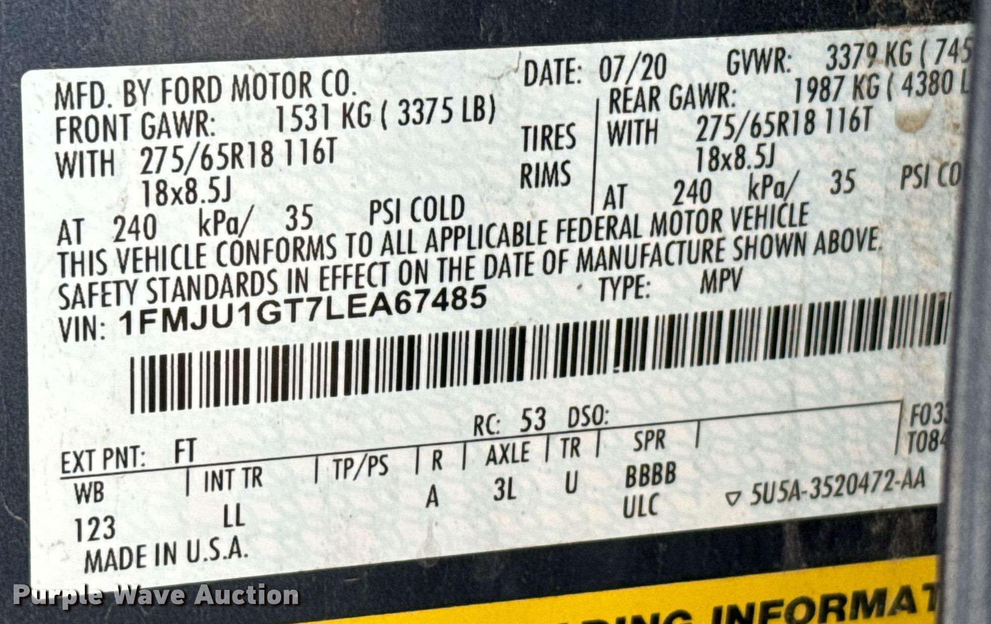 Purple Wave is selling a used Passenger Vehicle in Kansas. This item is a 2020 Ford Expedition SUV with the following: Miles: 112,519 on odometer, VIN: 1FMJU1GT7LEA67485