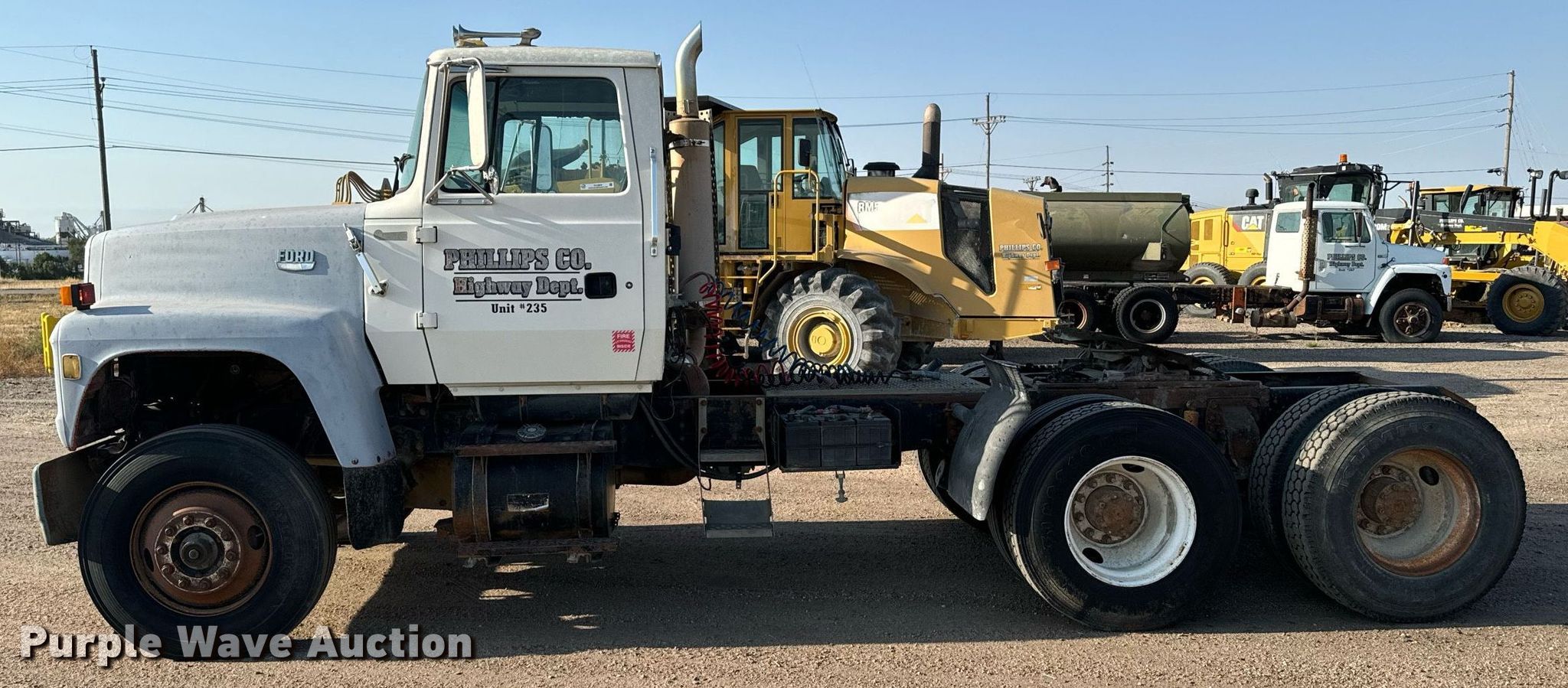 1997 Ford LT9000 semi truck. Miles: 550,480 on odometer, Hours: 567 on meter, VIN: 1FDYU90X1VVA15296. Engine Caterpillar 3406, Displacement: 14.6L, Cylinders: 6, Fuel type: Diesel. Transmission Eaton Fuller Roadranger, Manual, Speed: 9. Chassis Axles: Tandem, Differential lock: Inter-axle, Suspension: Air Dump valves, Brakes: Air, GVWR: 15,525 lbs FAWR: 8,184 lbs, RAWR: 7,341 lbs. Interior AC, Heat. Features Deck plate: Steel, Fifth wheel type: Air operated, Fuel tank: Dual. Tires Size: 11R22.5. Notes Windshield chipped or cracked. Kansas title. Phillips County Road and Bridge. Phillipsburg, KS 67661