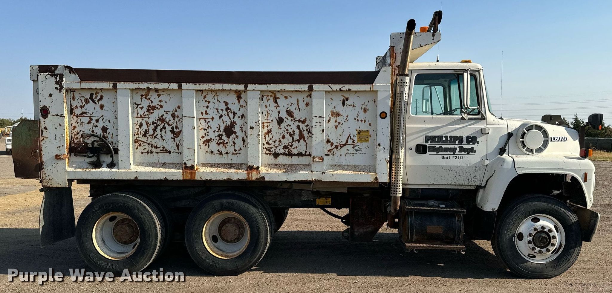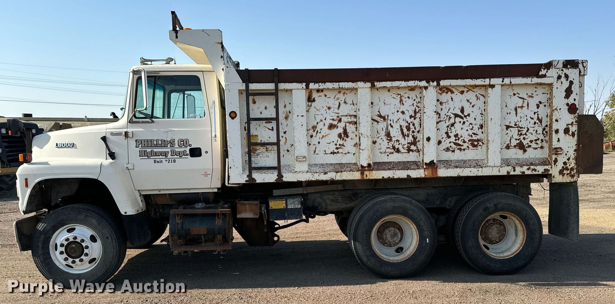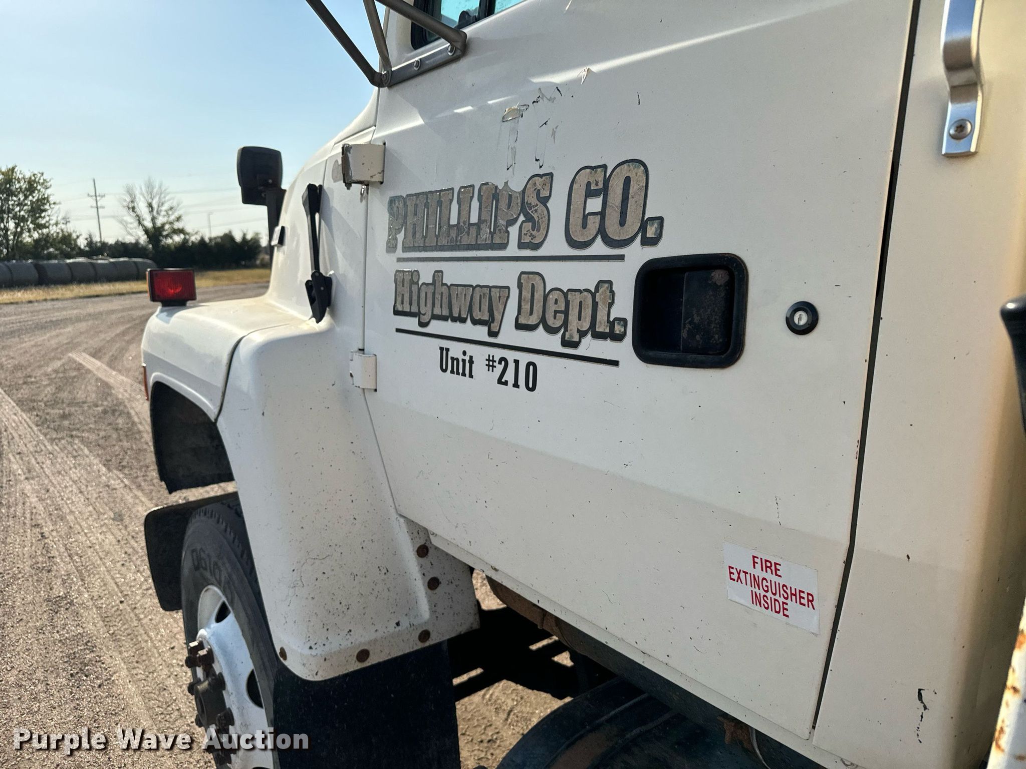 1996 Ford L8000 dump truck. Miles: 349,185 on odometer, Hours: 2,269 on meter, VIN: 1FDYW82E5TVA31224. Engine Cummins, Displacement: 8.3L, Cylinders: 6, Fuel type: Diesel. Transmission Allison, Automatic. Chassis Axles: Tandem, Suspension: Spring over walking beam, Brakes: Air, PTO, GVWR: 53,220 lbs, Wheelbase: 174". Interior AC, Heat. Features Dump bed Mabar DB144207, 14' L x 96" W, Side height: 46", Side board height: 7", Bed type: Steel, Ram: Single, End gate: Air operated, Plow Width: 144", Snowplow. Tires Size: 11R22.5. Notes Windshield chipped or cracked. Kansas title. Phillips County Road and Bridge. Phillipsburg, KS 67661