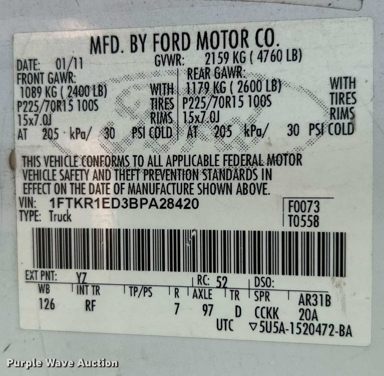 Purple Wave is selling a used Compact Pickup or Van in Oklahoma. This item is a 2011 Ford Ranger SuperCab pickup truck with the following: Miles: 93,128 on odometer, VIN: 1FTKR1ED3BPA28420, Unit #: 609