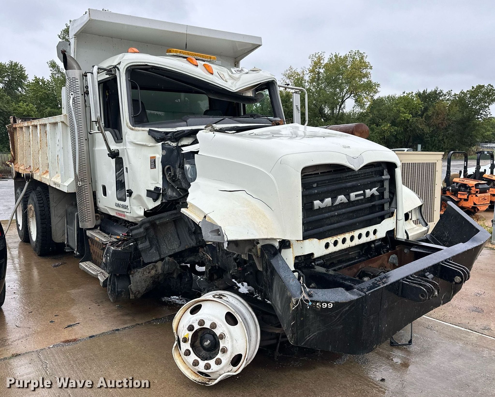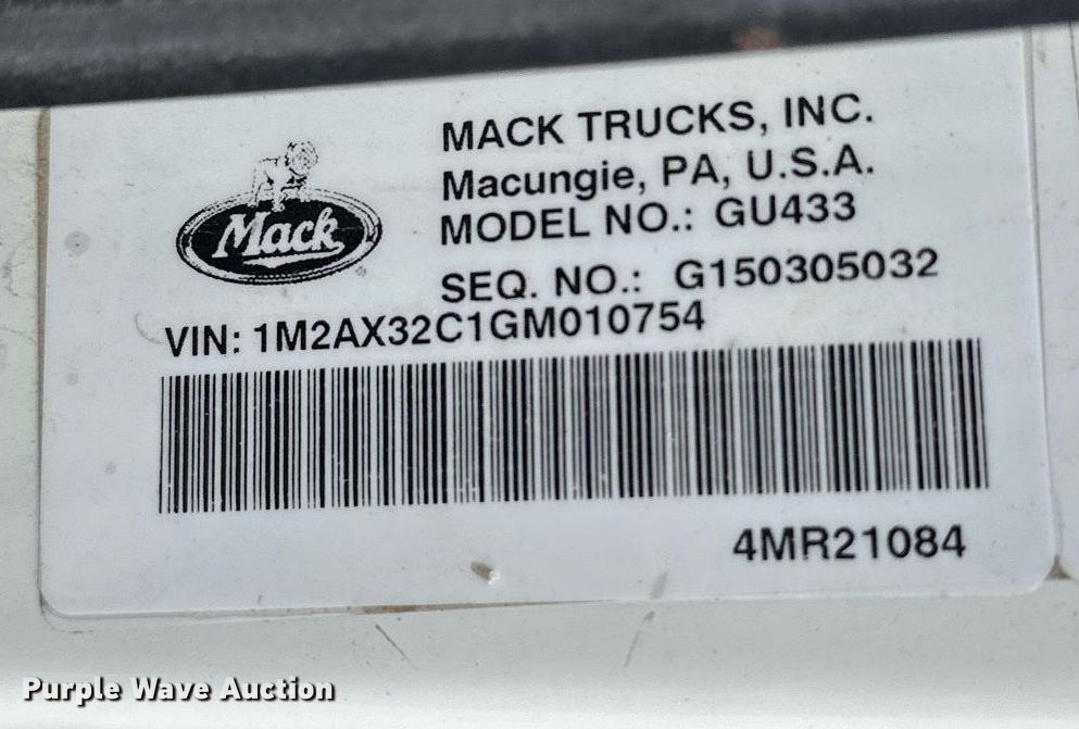 Purple Wave is selling a used Construction Dump Truck in Oklahoma. This item is a 2016 Mack Granite GU433 dump truck with the following: Miles: Unknown, VIN: 1M2AX32C1GM010754, Unit #: 1599